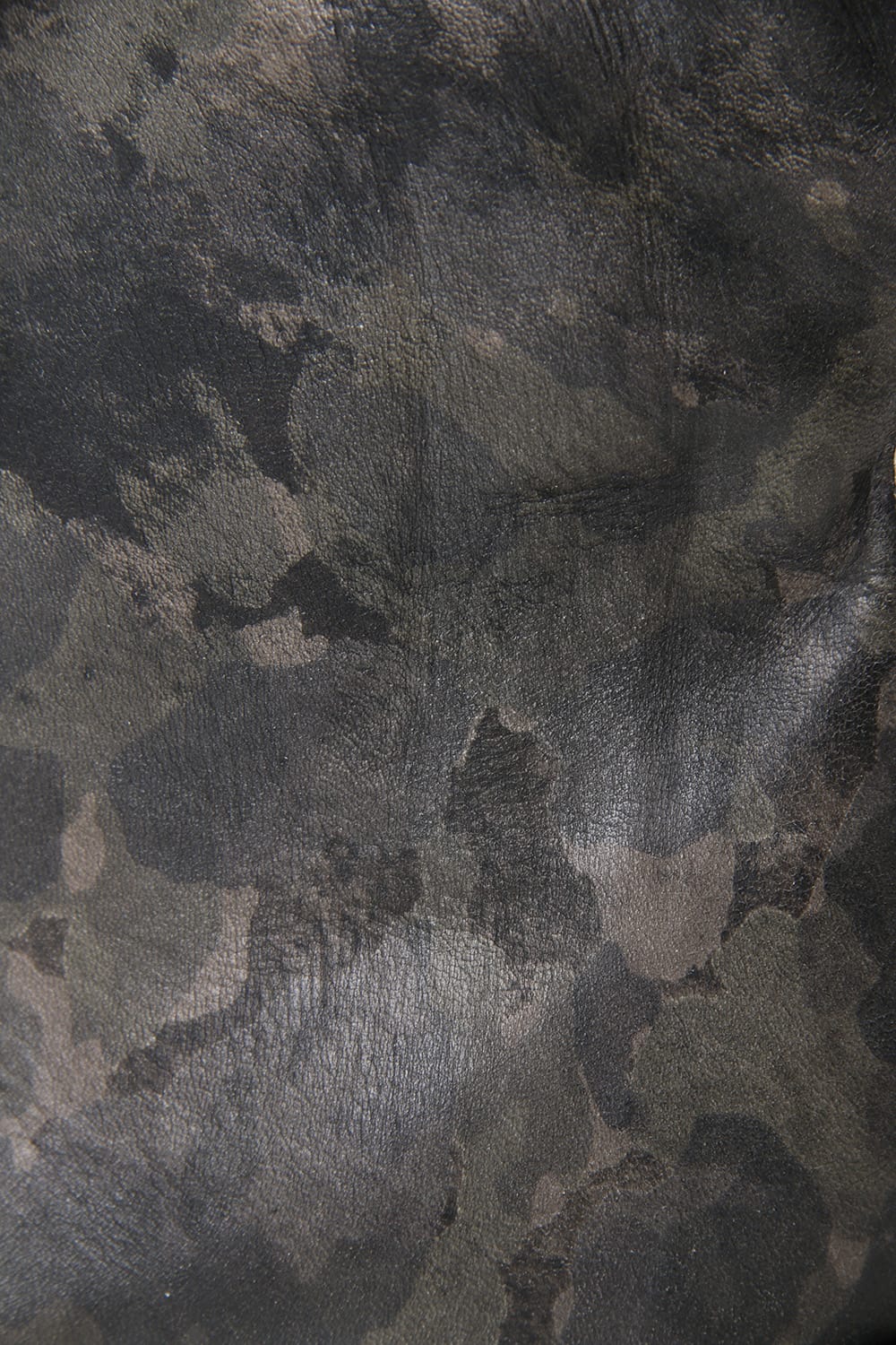 This pair is a long type boot of front zip specifications characterised by the toe with the volume that is familiar in the "PL" series. This is a special model with only a limited number produced. The dark and matte camouflage pattern was not done by a regular tumbler dye, it was expressed by putting a film on leather and then dyeing it. Both front leather and liner are molded in one piece. The sole is a double sole specification with a raised heel. The inseam is long and is very compatible with all kinds of bottoms.