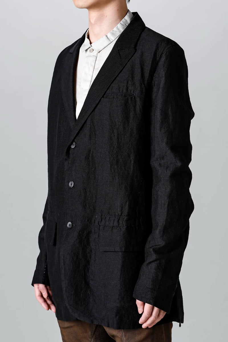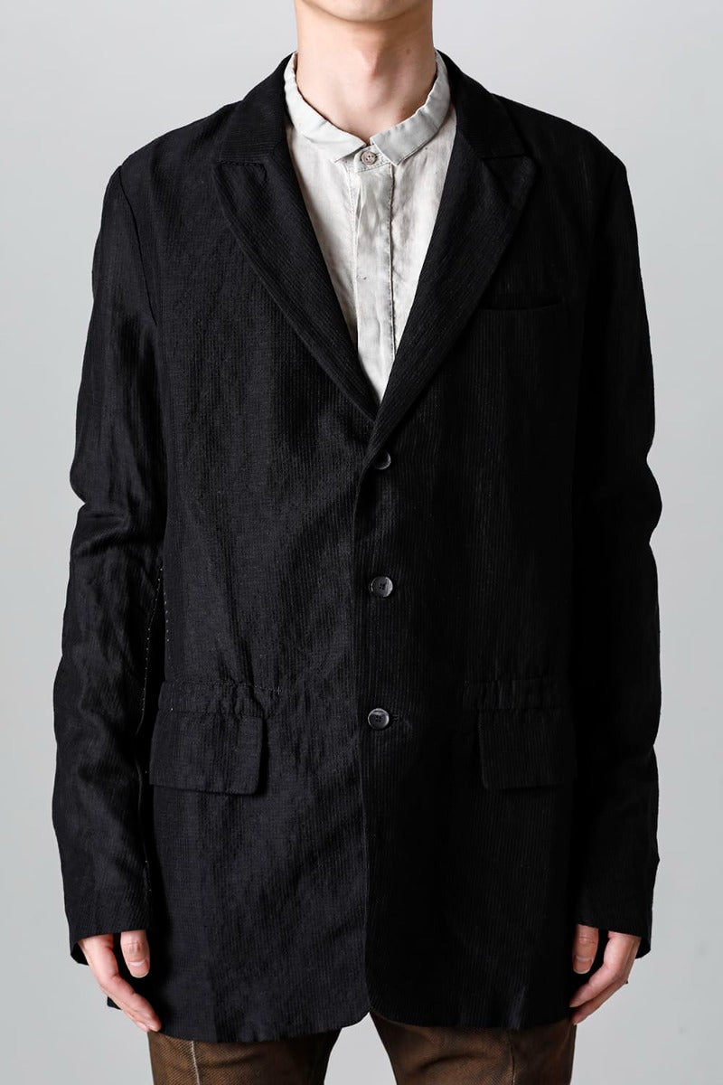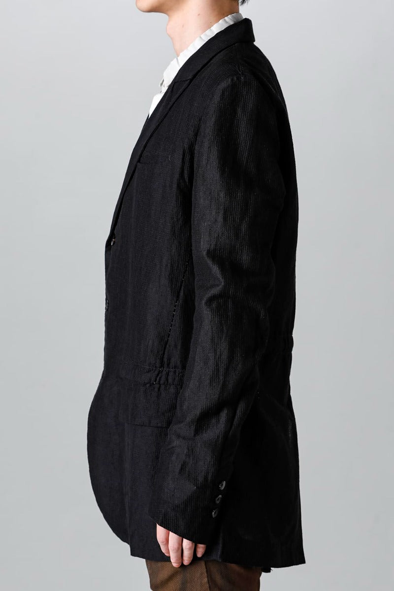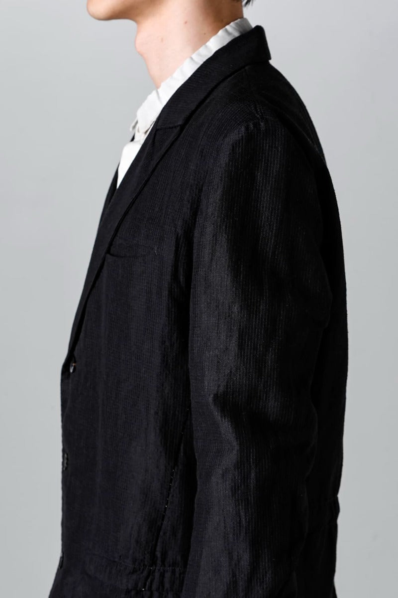 Relaxed silhouette jacket in fine ripstop fabric of light cotton linen. It is unlined and very lightly tailored in both construction and fabric. The collar can be worn up or with a peaked lapel, and it is a 3-hand scratch horn button jacket. Horizontal flap pockets with stitched pocket bags and single slash pocket on the chest. Three button cuffs. It is back vented and all seams are stitched with masnada's iconic scratch stitched design.