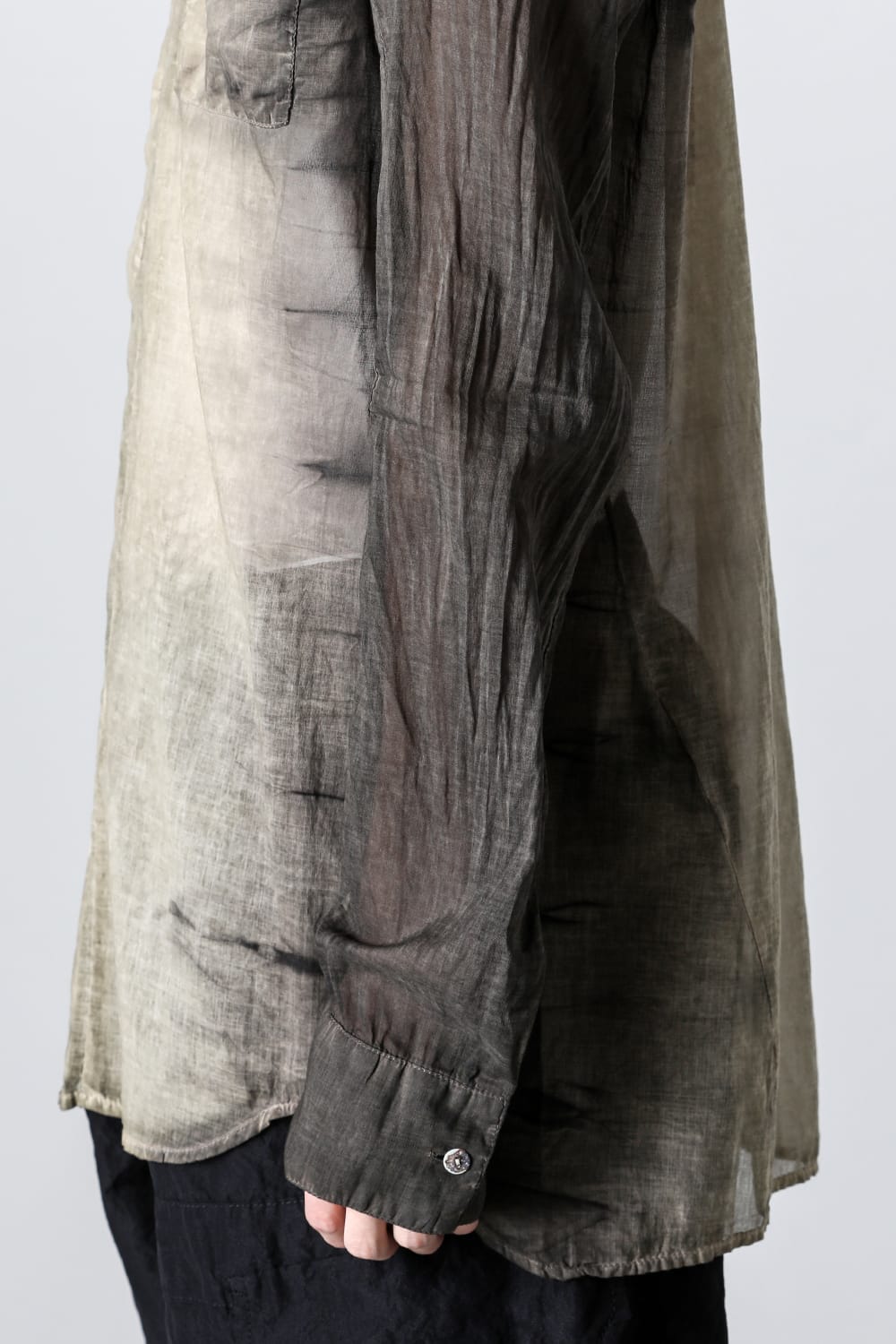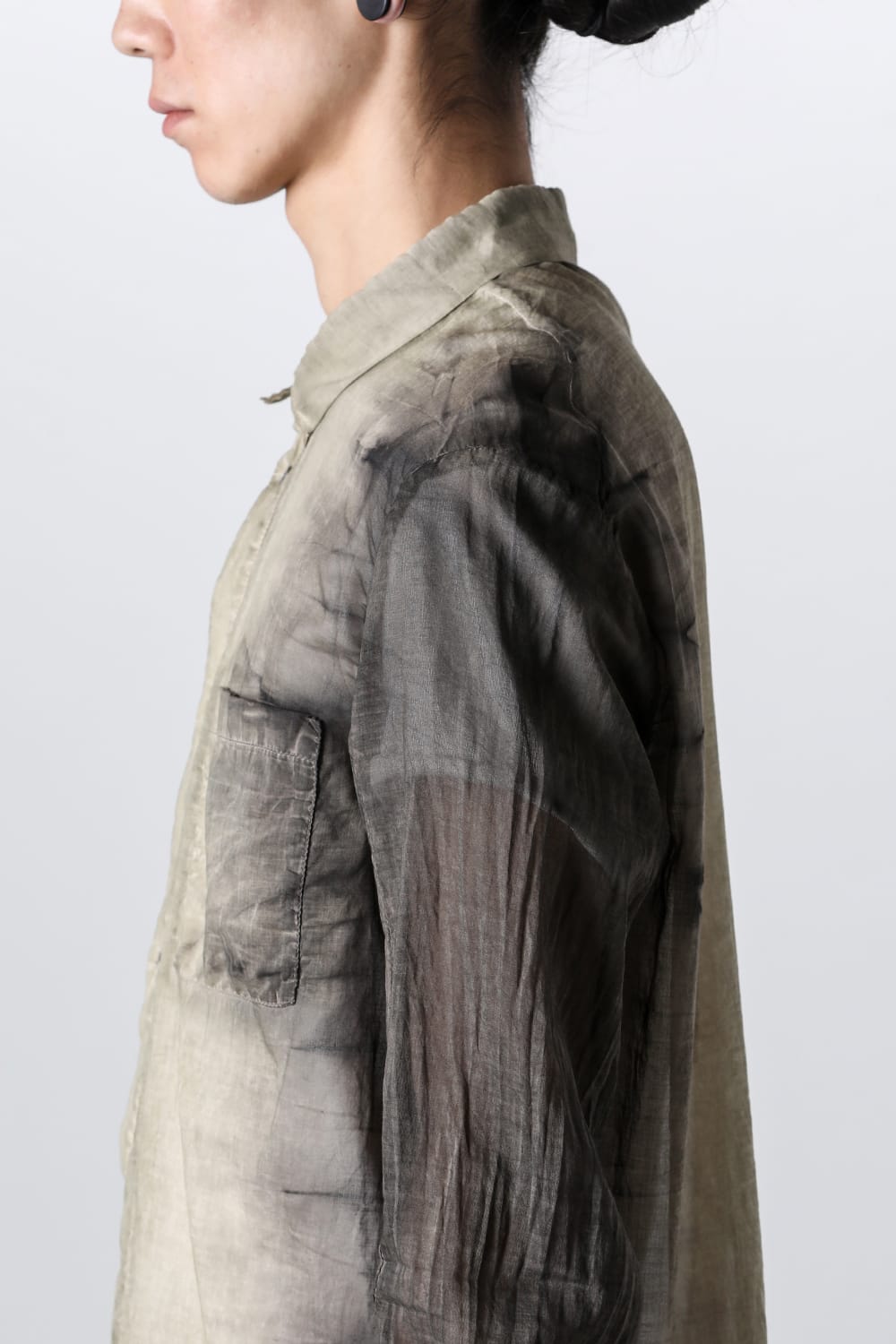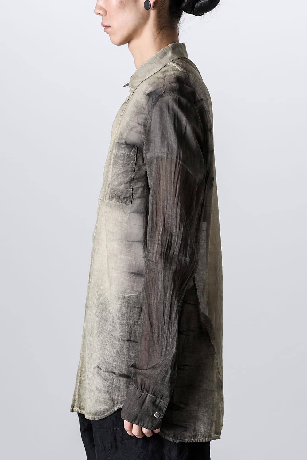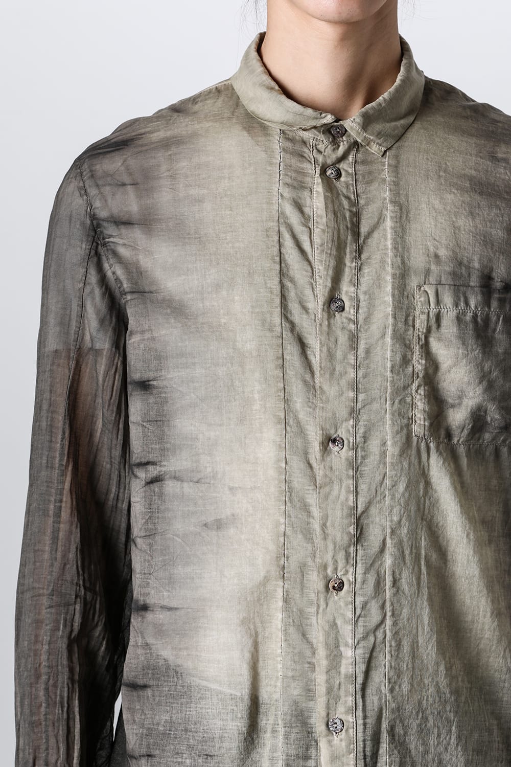 A button-down shirt with a vertical line created by using the same material for the front center. The silhouette is slim but not solid, giving a slightly casual impression. Made of soft and slightly sheer lightweight cotton, it offers a dry touch and a cool feeling. It features a small collar with shell buttons on the front and a chest pocket. Characteristic is the mottled color difference between the body and sleeves.