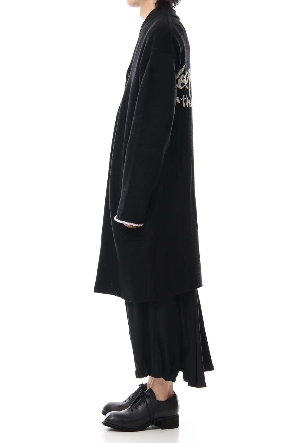 A long knit cardigan with a message "Keep on Rockin' in the Free World" printed on the back. Only the left side of the sleeve has a white asymmetric design. The knitting fabric is changed along with the message. It is 5 gauge thick and long knit that you can wear it as an outer garment.