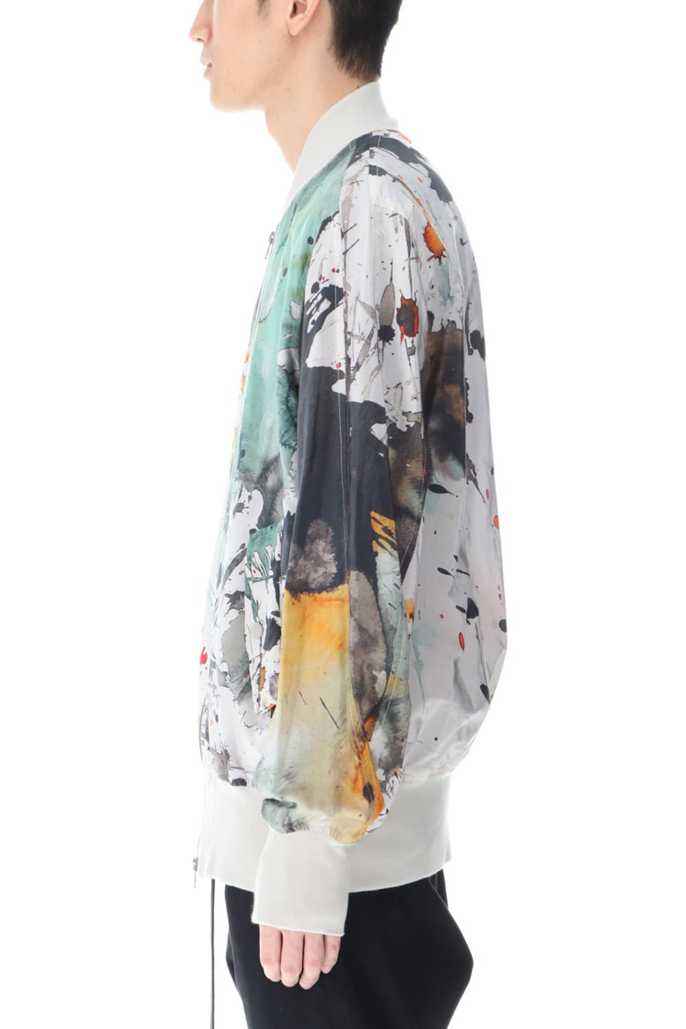 The bomber jacket design has a loose silhouette with a large body width and sleeves.