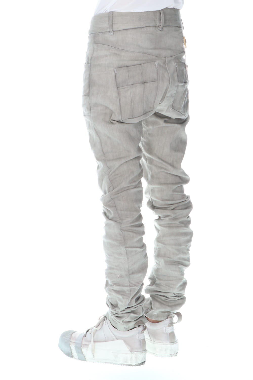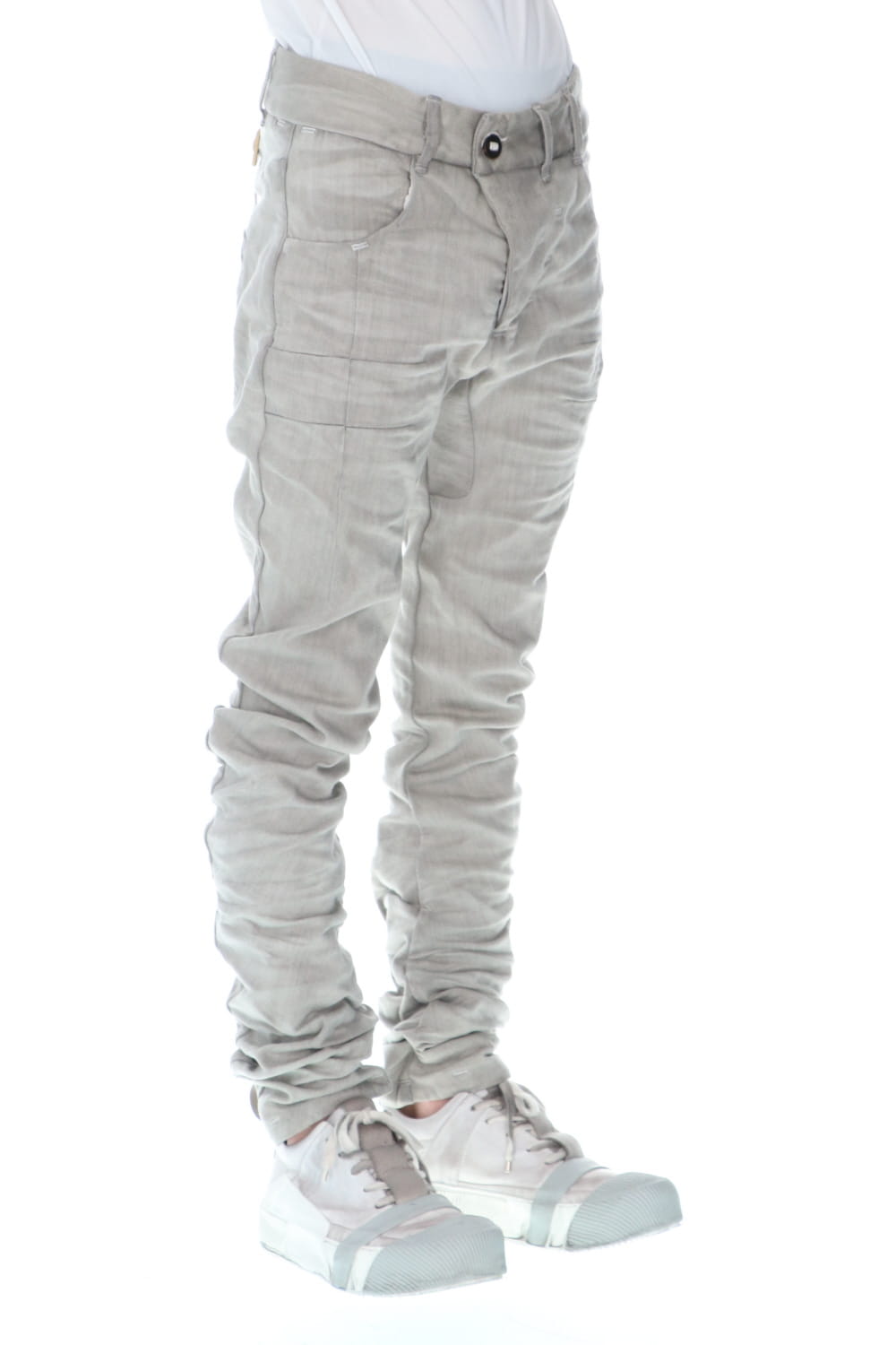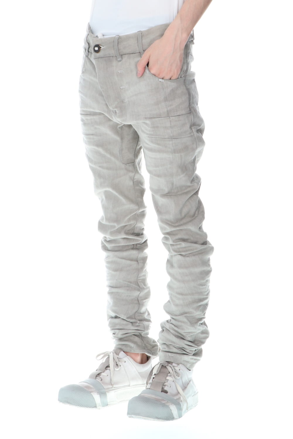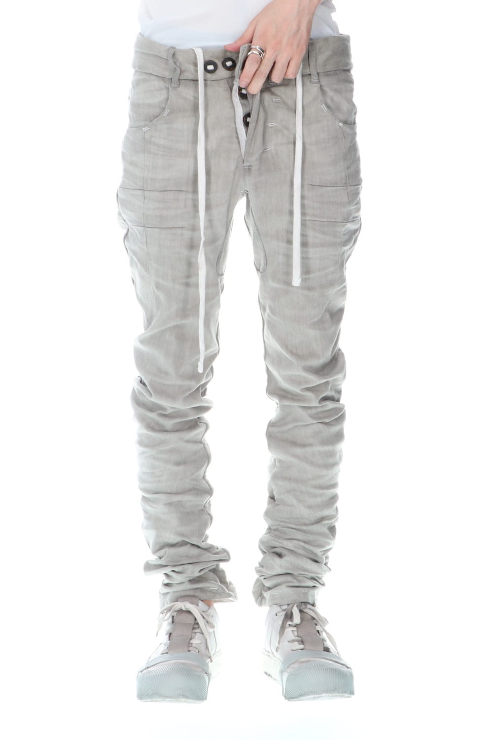 These processed denim pants are a standard and popular item. The base is a tight fit, polyurethane blend stretch denim with an oxydie (bleach) finish.