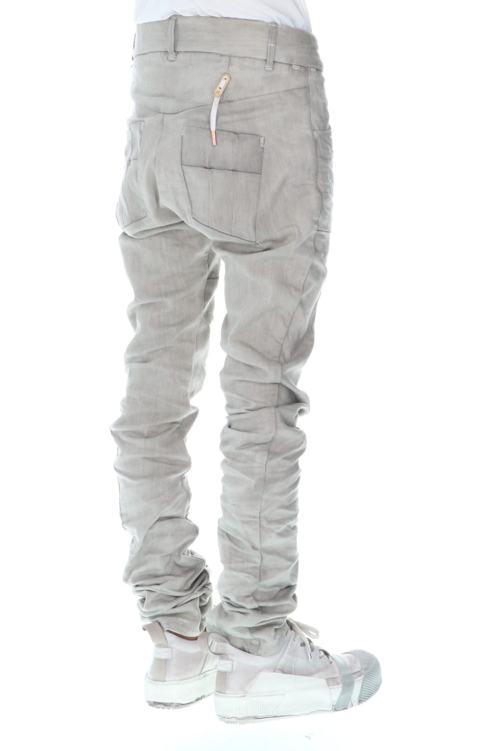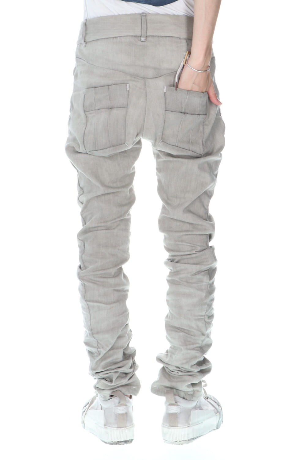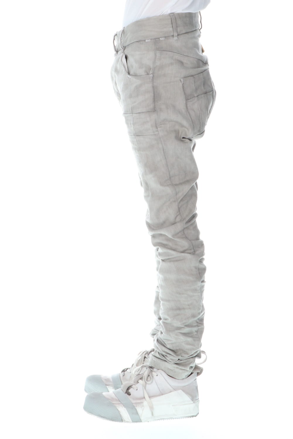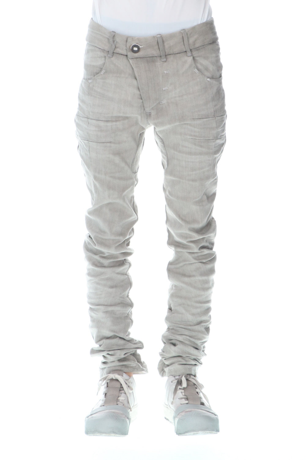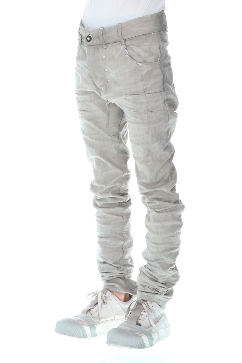 These processed denim pants are a standard and popular item. The base is a tight fit, polyurethane blend stretch denim with an oxydie (bleach) finish.