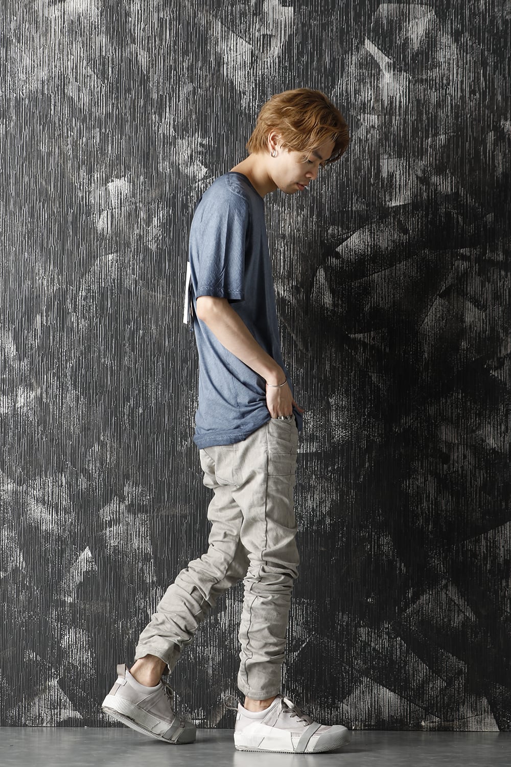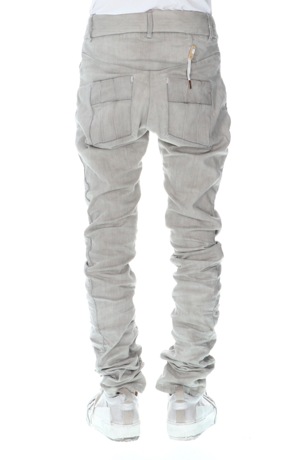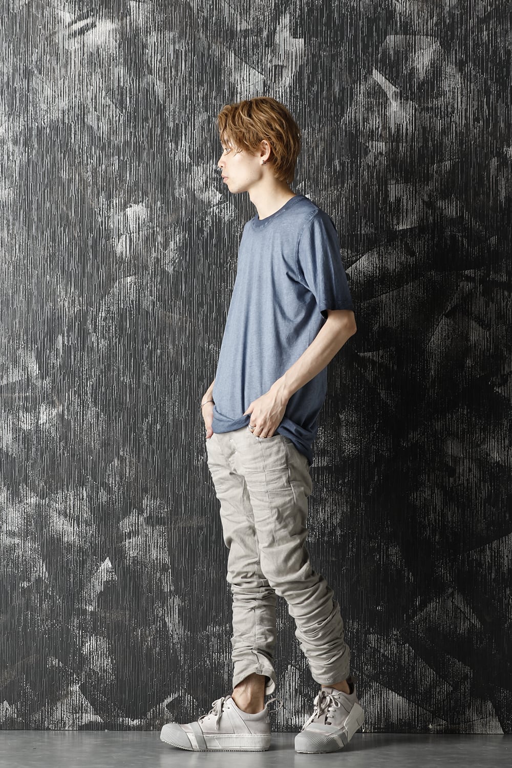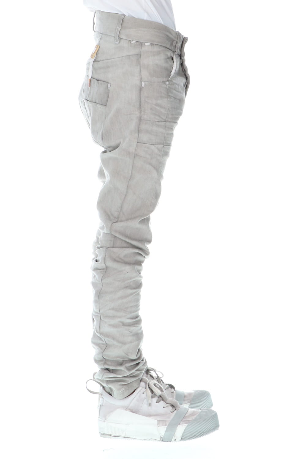 These processed denim pants are a standard and popular item. The base is a tight fit, polyurethane blend stretch denim with an oxydie (bleach) finish.