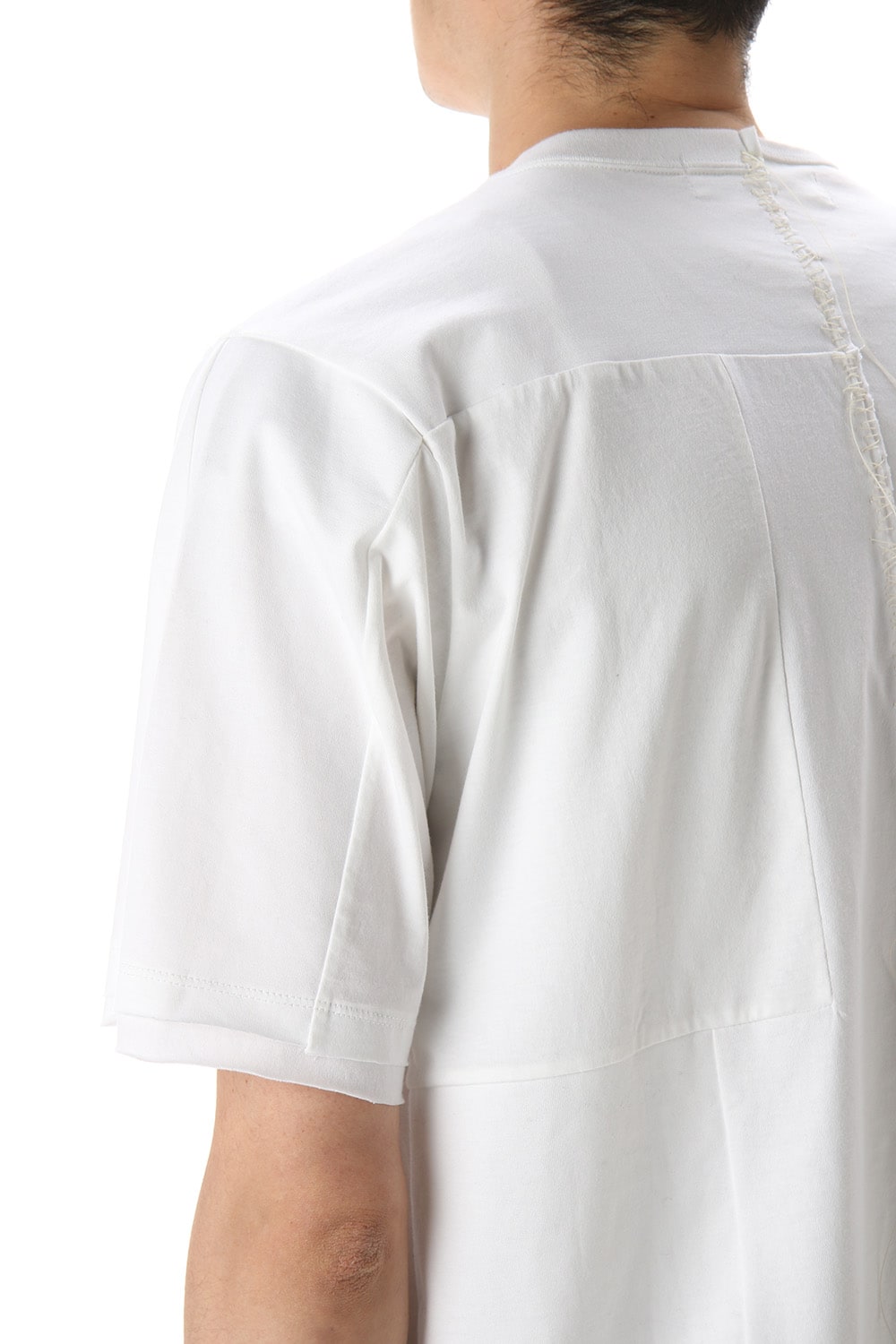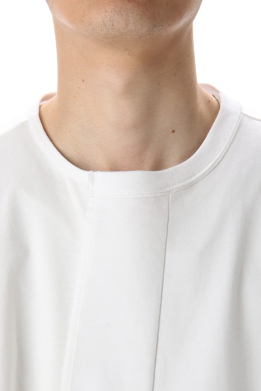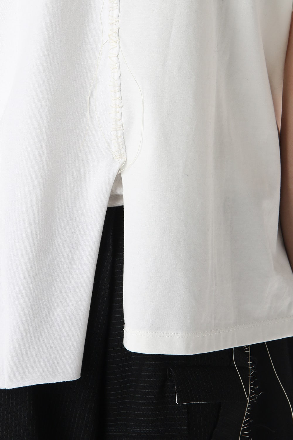 A simple t-shirt made of one kind of jersey (right bodice) and a dense t-shirt made of three kinds of jersey (left bodice) are combined. It's cut in a straightforward fashion, with a cut-out hem and cuffs and an asymmetrical hem. The back center is hand stitched and there is a slit below the stitching.