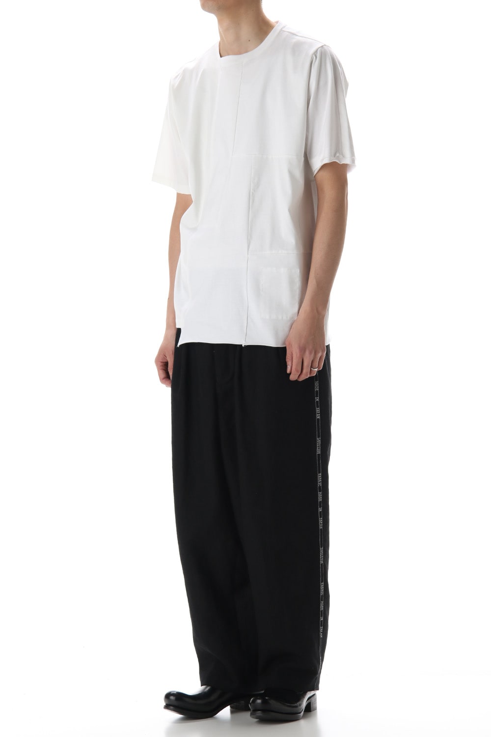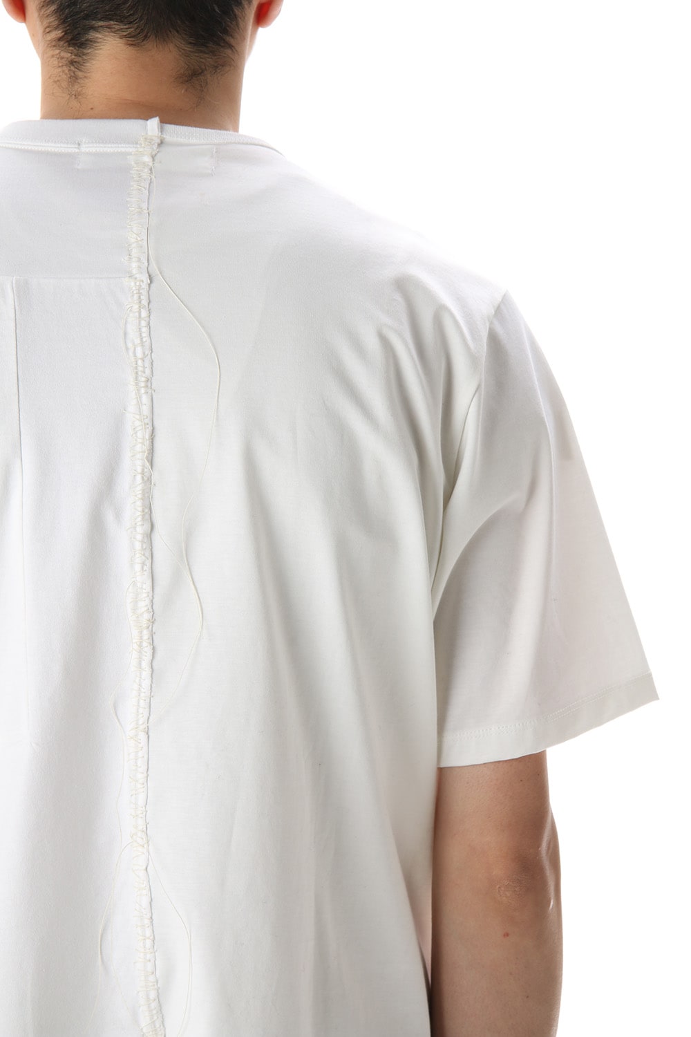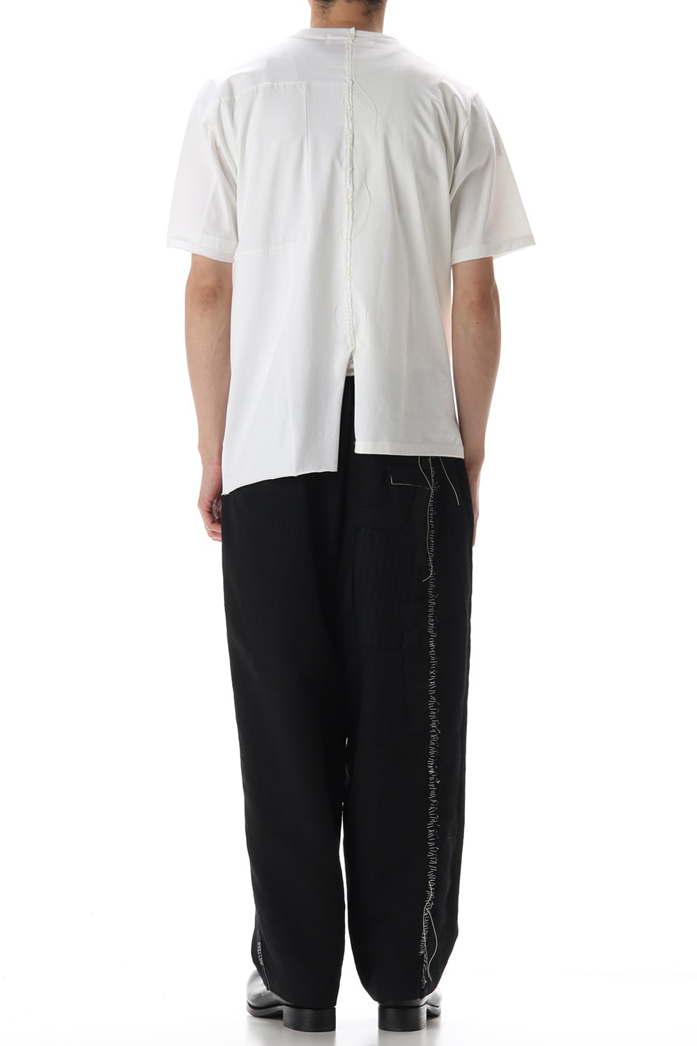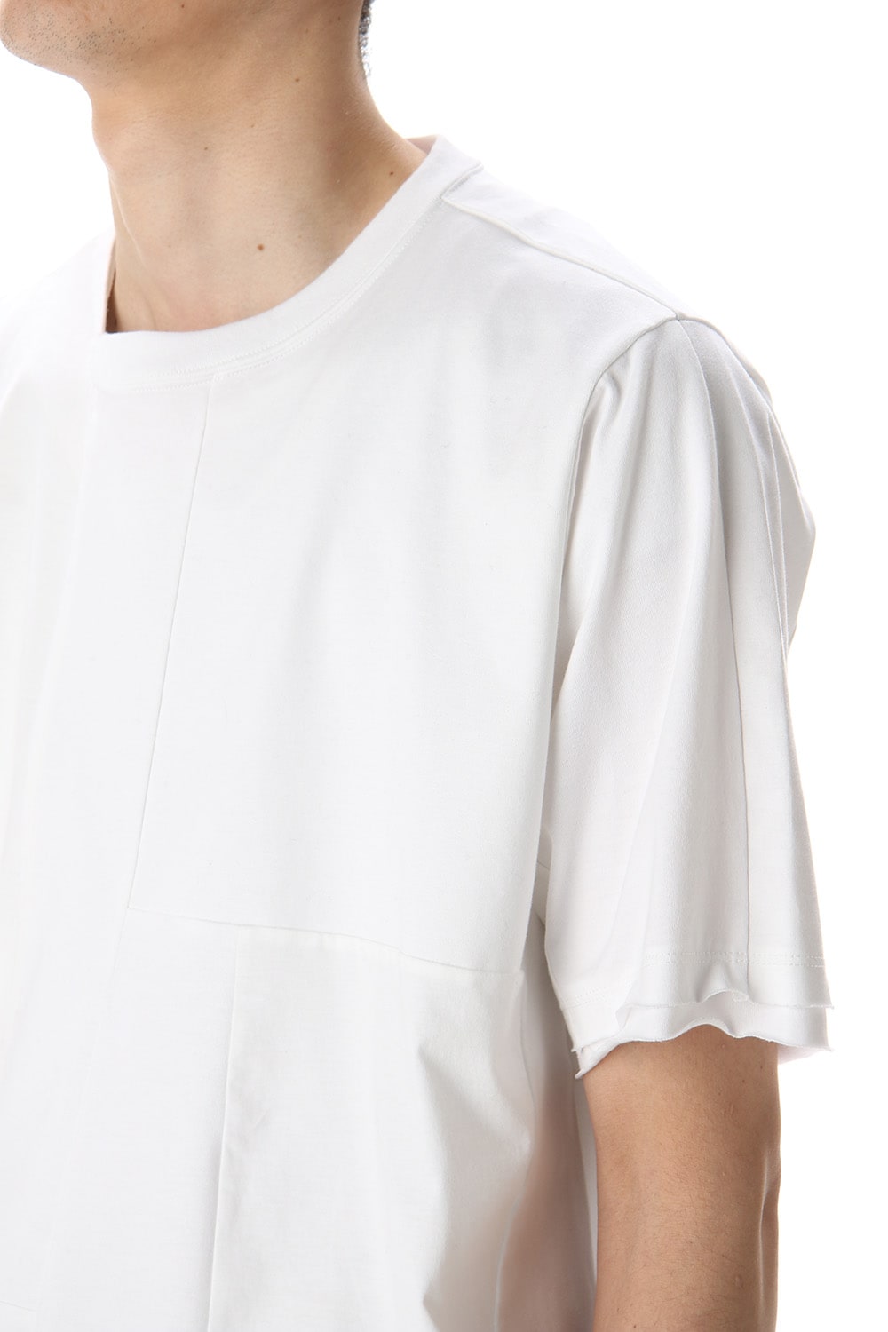 A simple t-shirt made of one kind of jersey (right bodice) and a dense t-shirt made of three kinds of jersey (left bodice) are combined. It's cut in a straightforward fashion, with a cut-out hem and cuffs and an asymmetrical hem. The back center is hand stitched and there is a slit below the stitching.