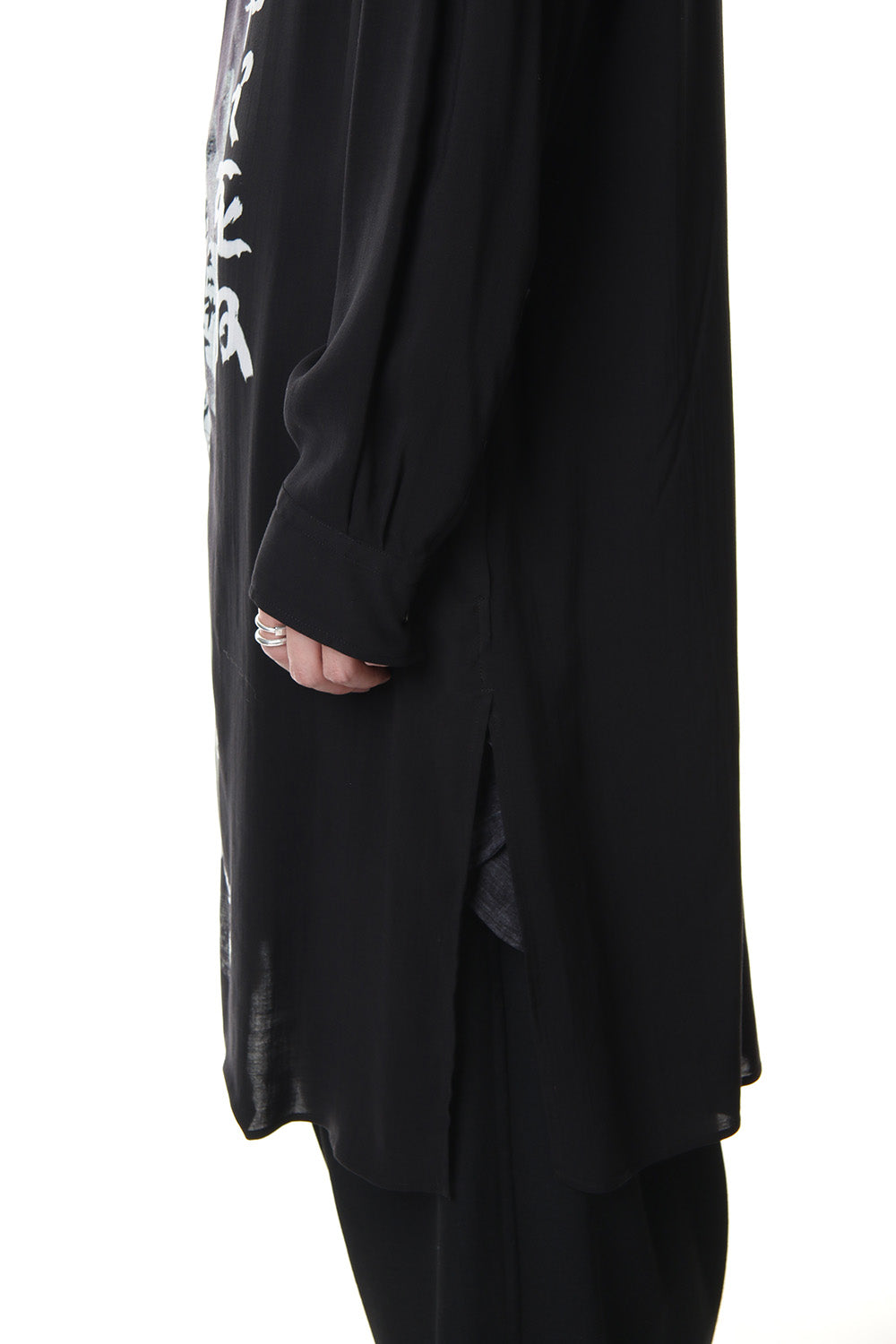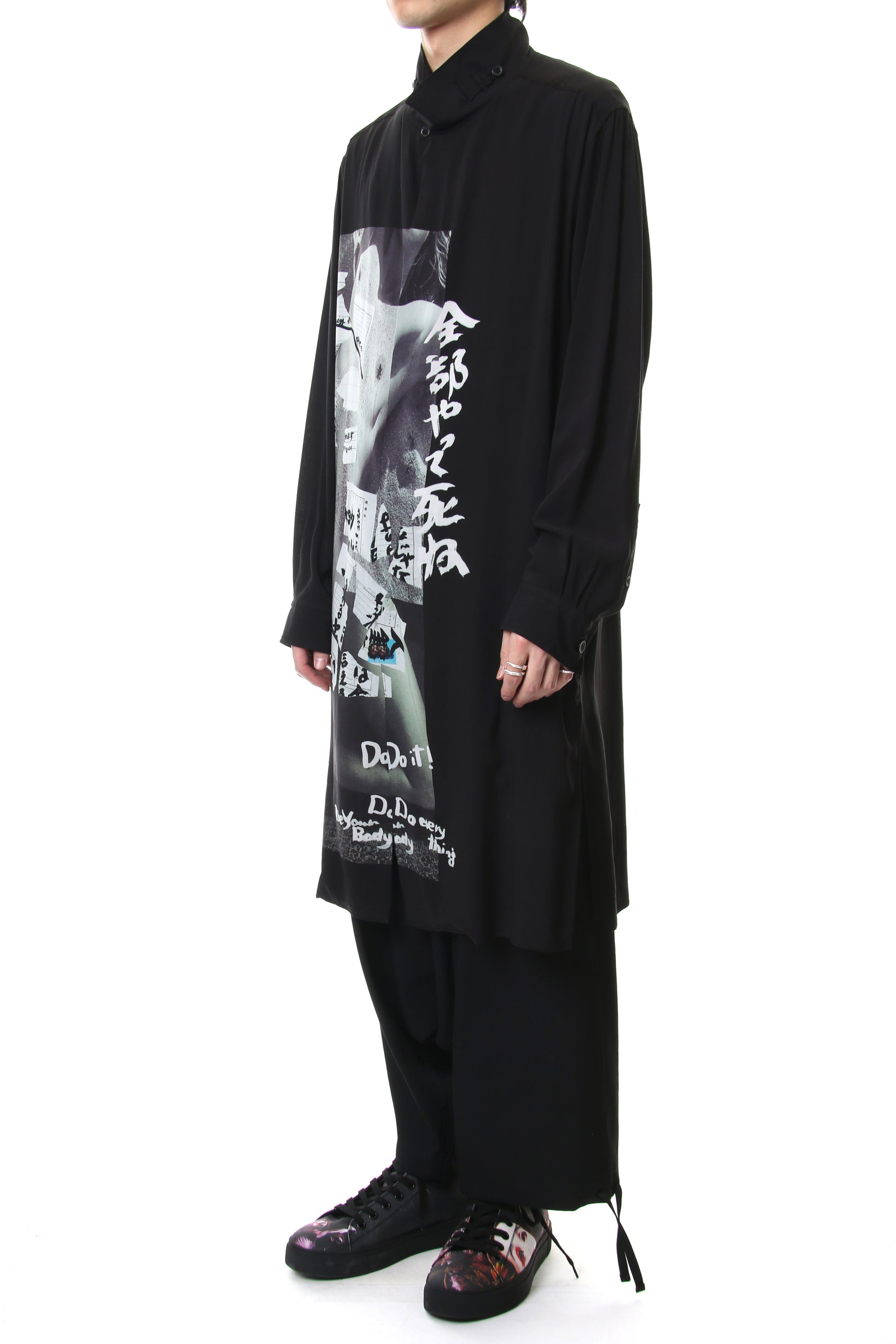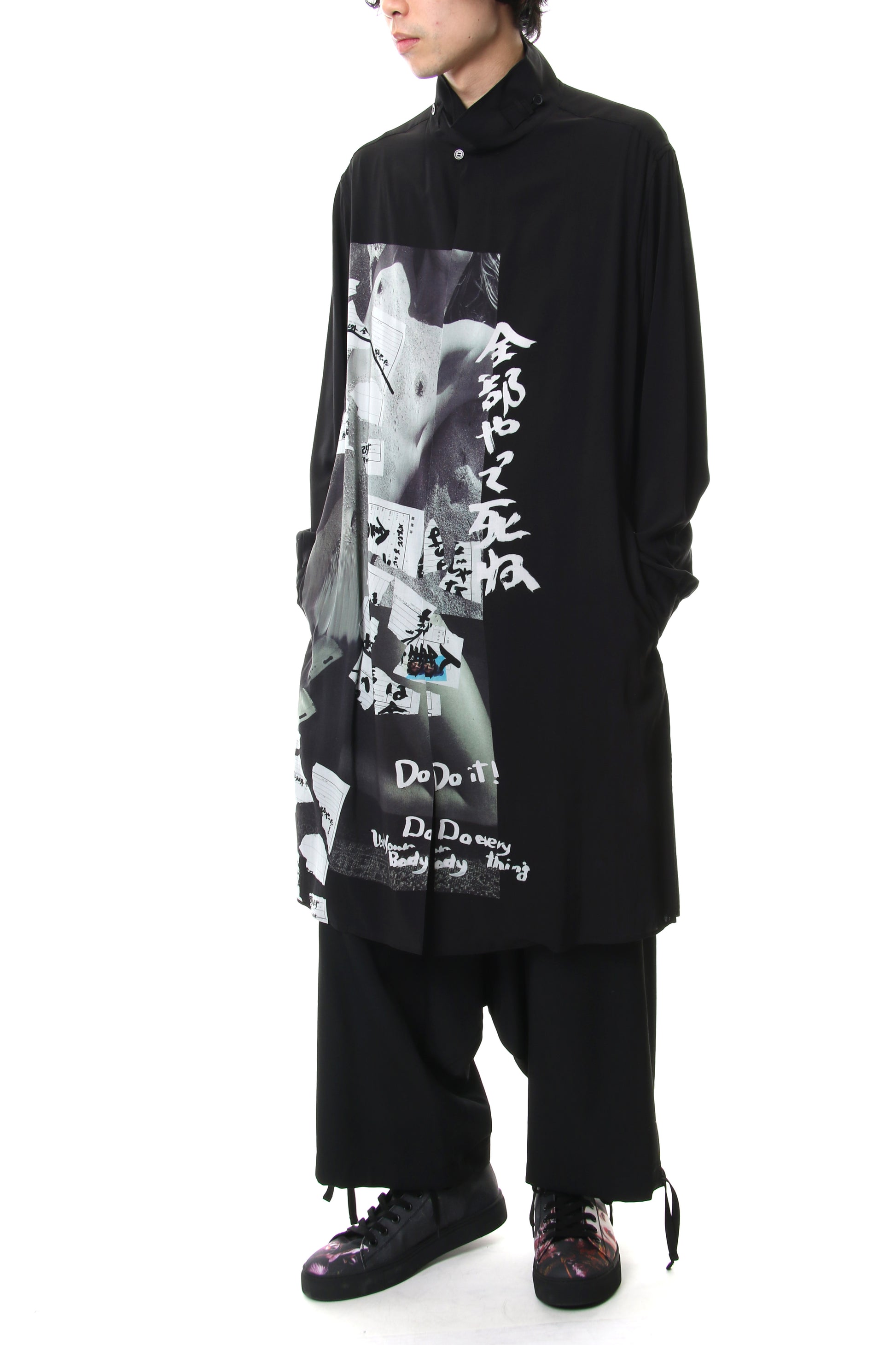 Long length shirt with a bold print on lightweight rayon fabric that was worn during the runway LOOK 27. The neck has a specification that keeps two belt-like parts crossed over, similar to the one that was developed in a broad fabric during the 18 AW season. Slit pockets are attached to both sides and it is also recommended to wear as a coat.