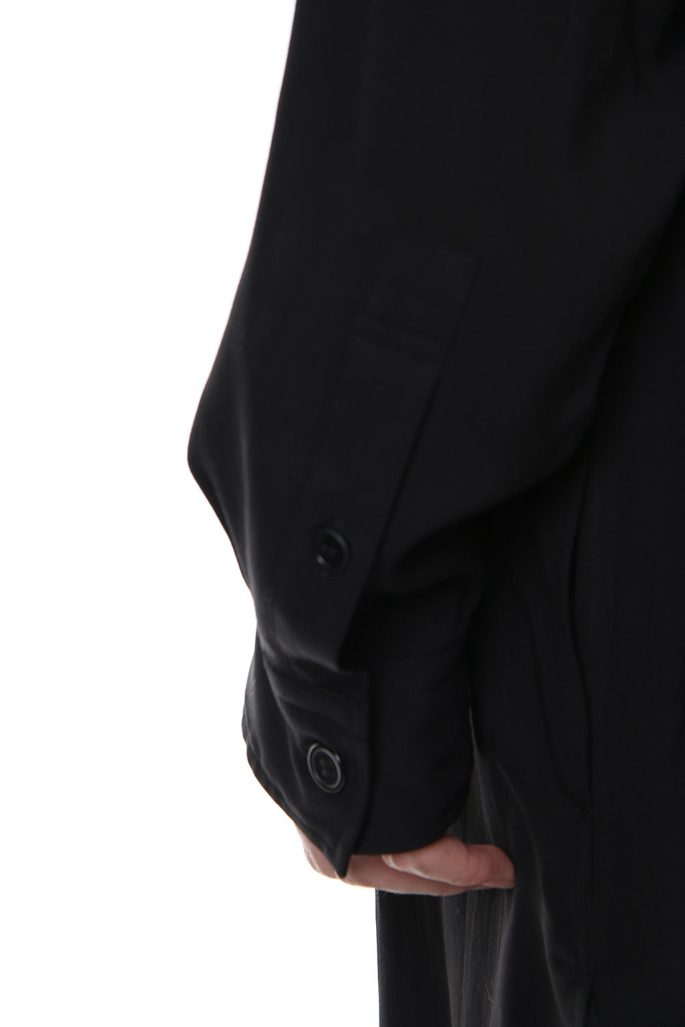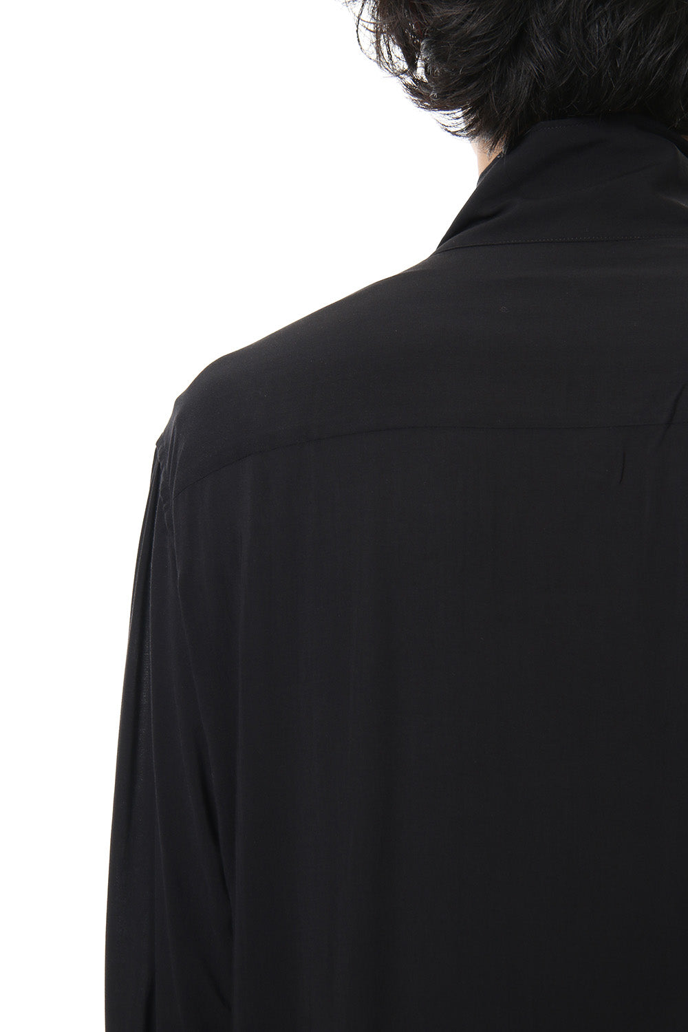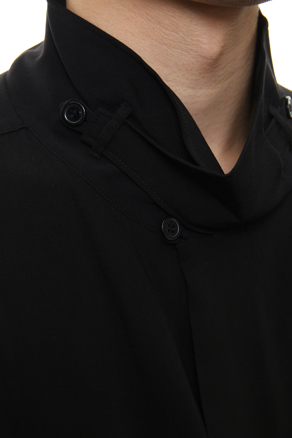 Long length shirt with a bold print on lightweight rayon fabric that was worn during the runway LOOK 27. The neck has a specification that keeps two belt-like parts crossed over, similar to the one that was developed in a broad fabric during the 18 AW season. Slit pockets are attached to both sides and it is also recommended to wear as a coat.
