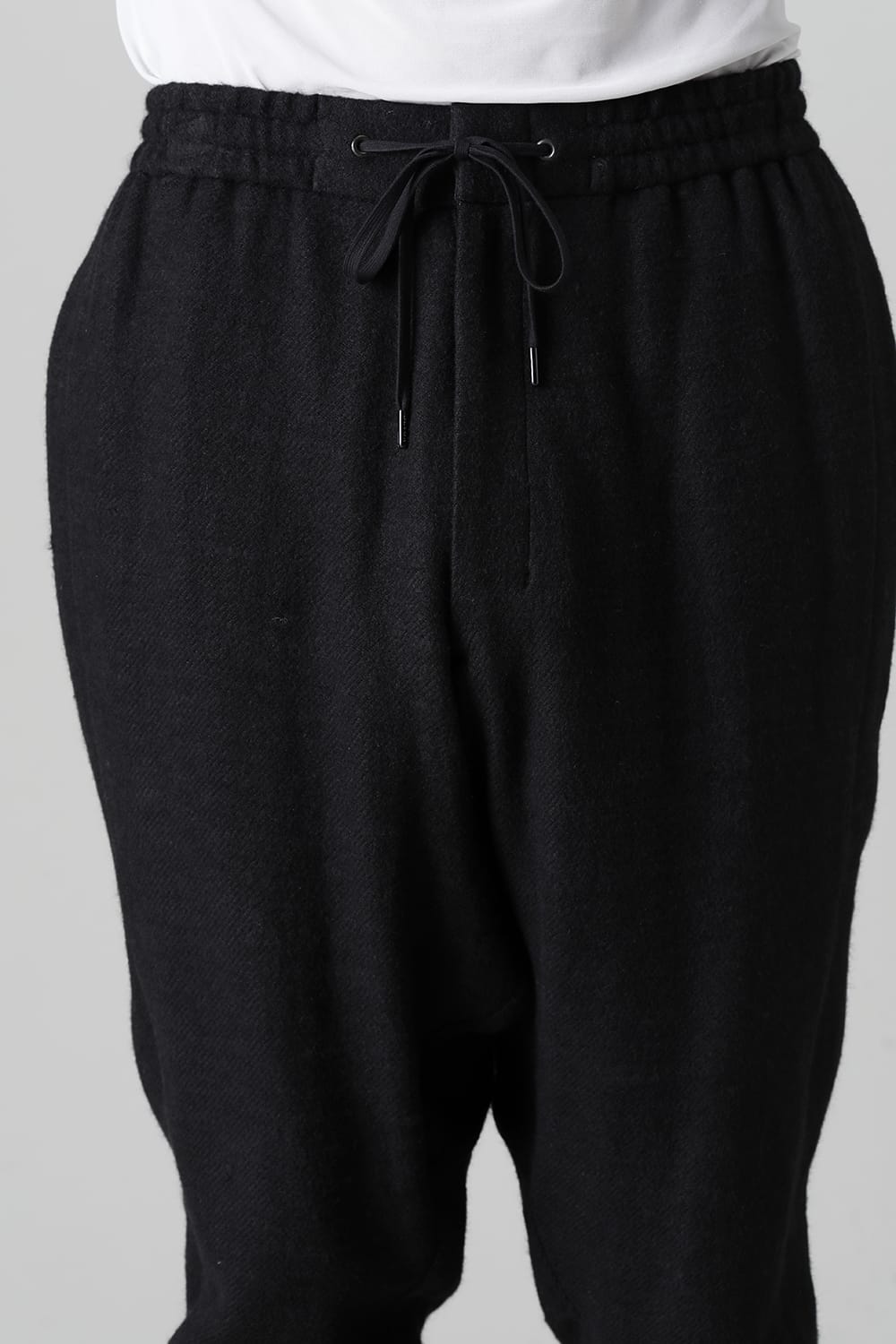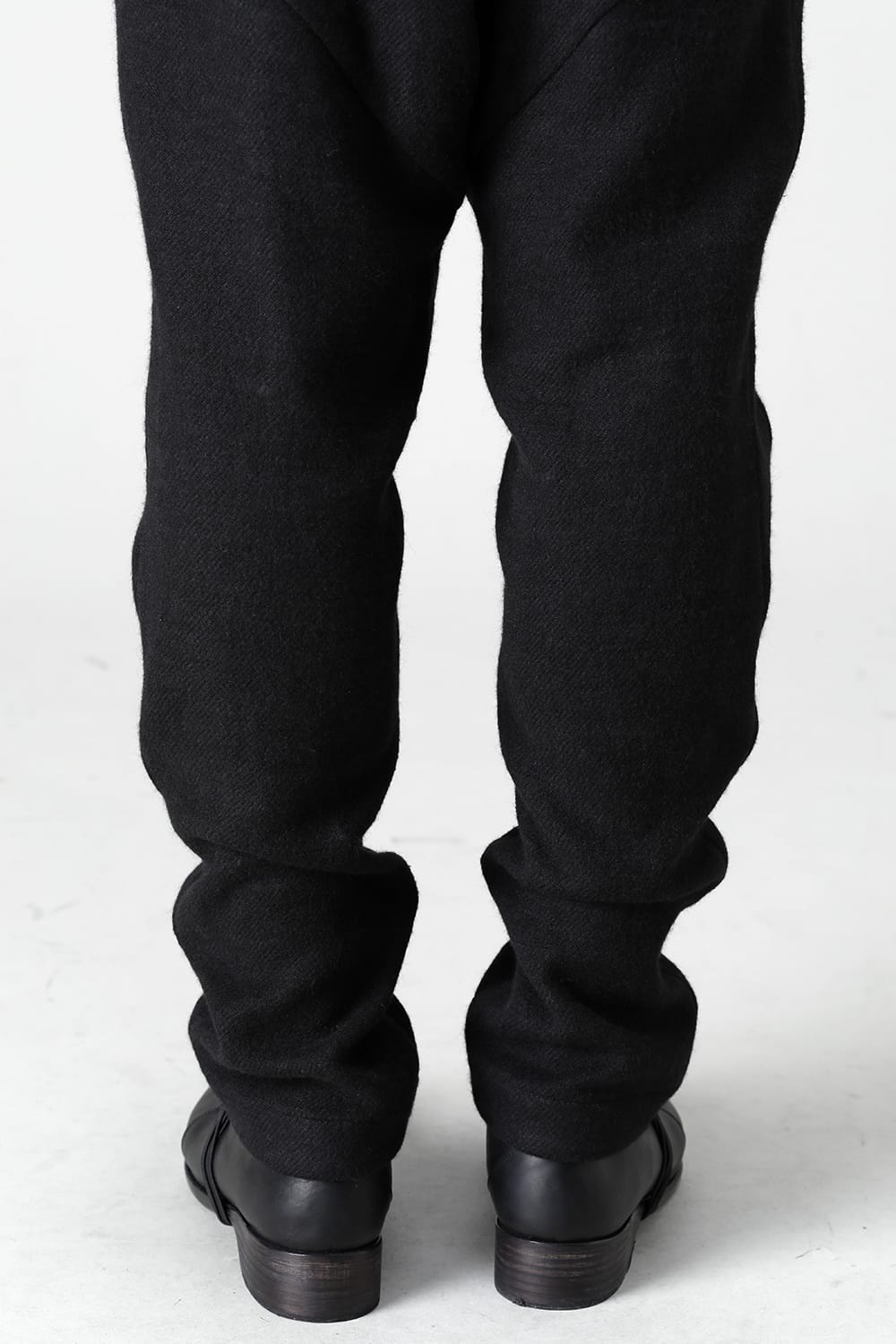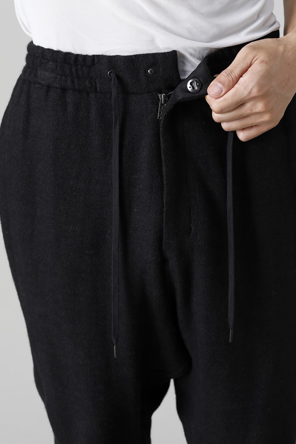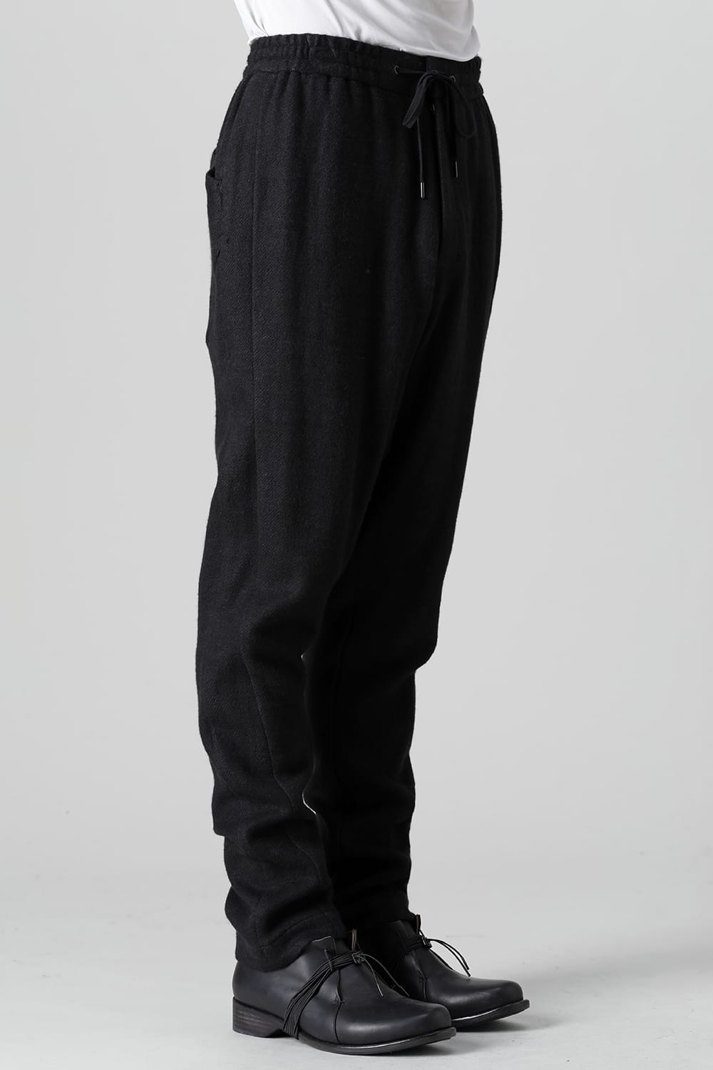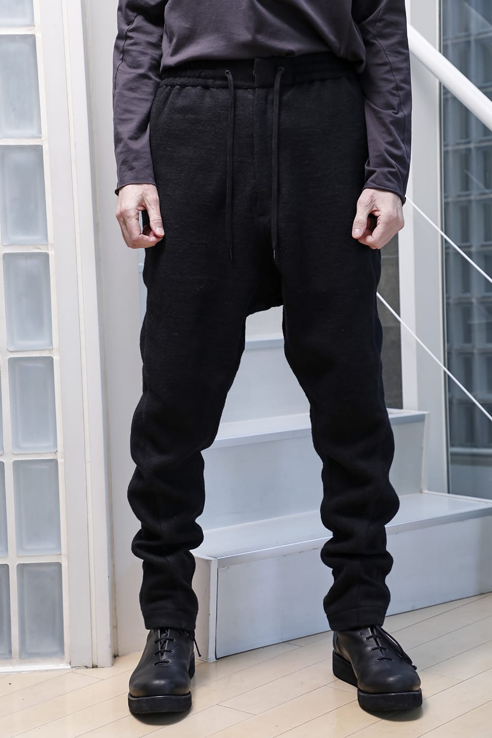 The design is a jodhpurs silhouette with a deep inseam, loose waist, and a unique anatomical pattern from below the knee. The waist is made with elastic and draw cord like a pair of easy pants.