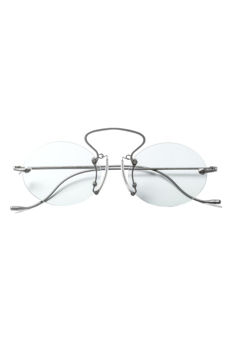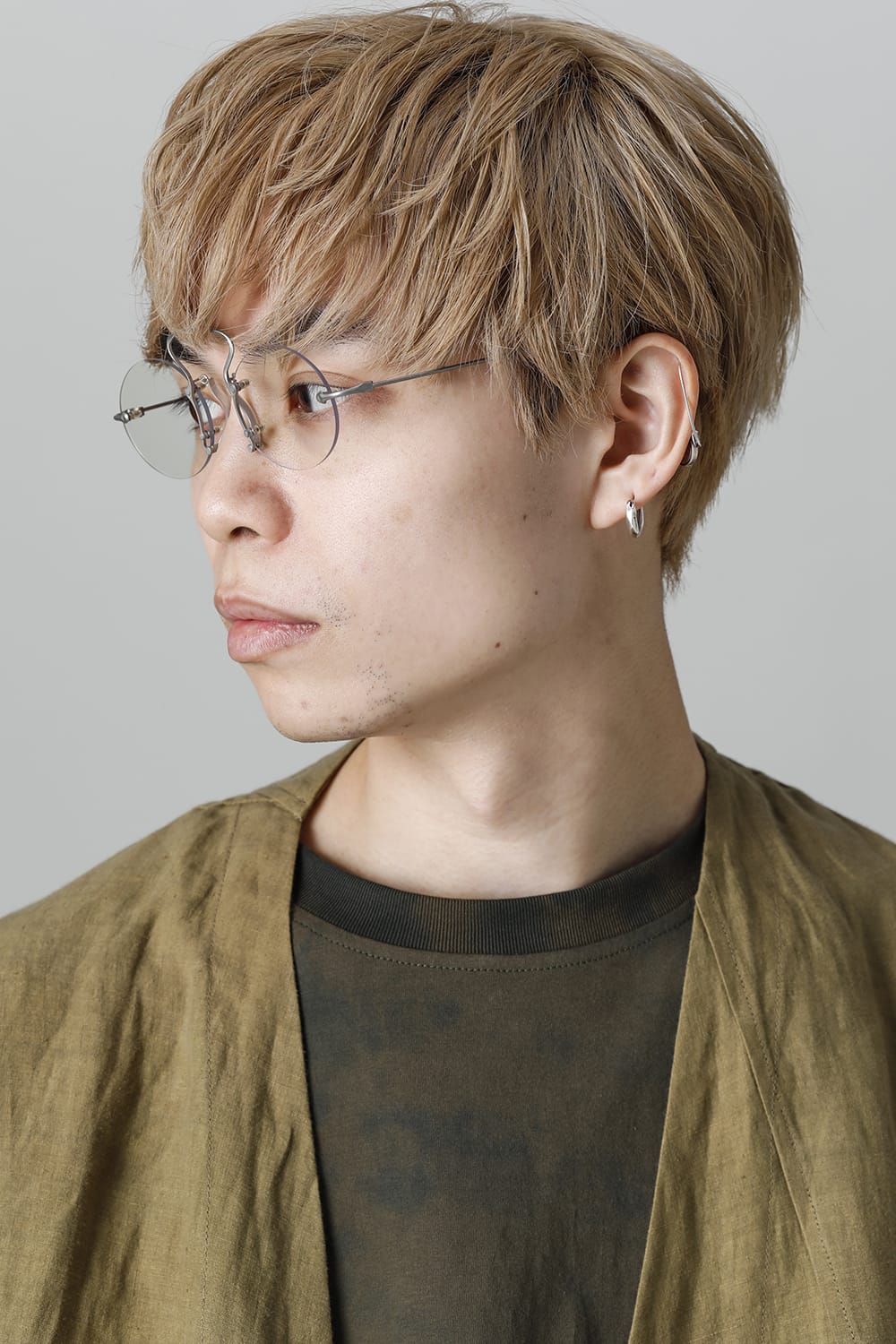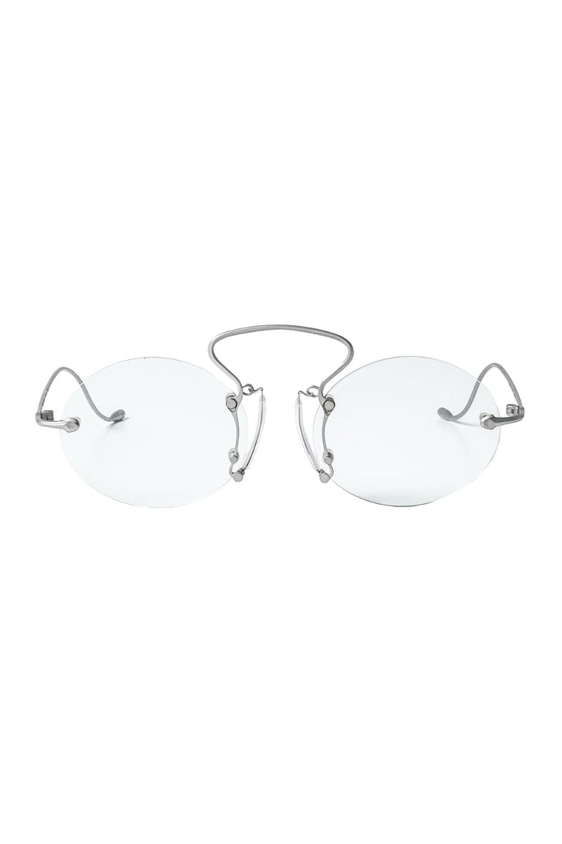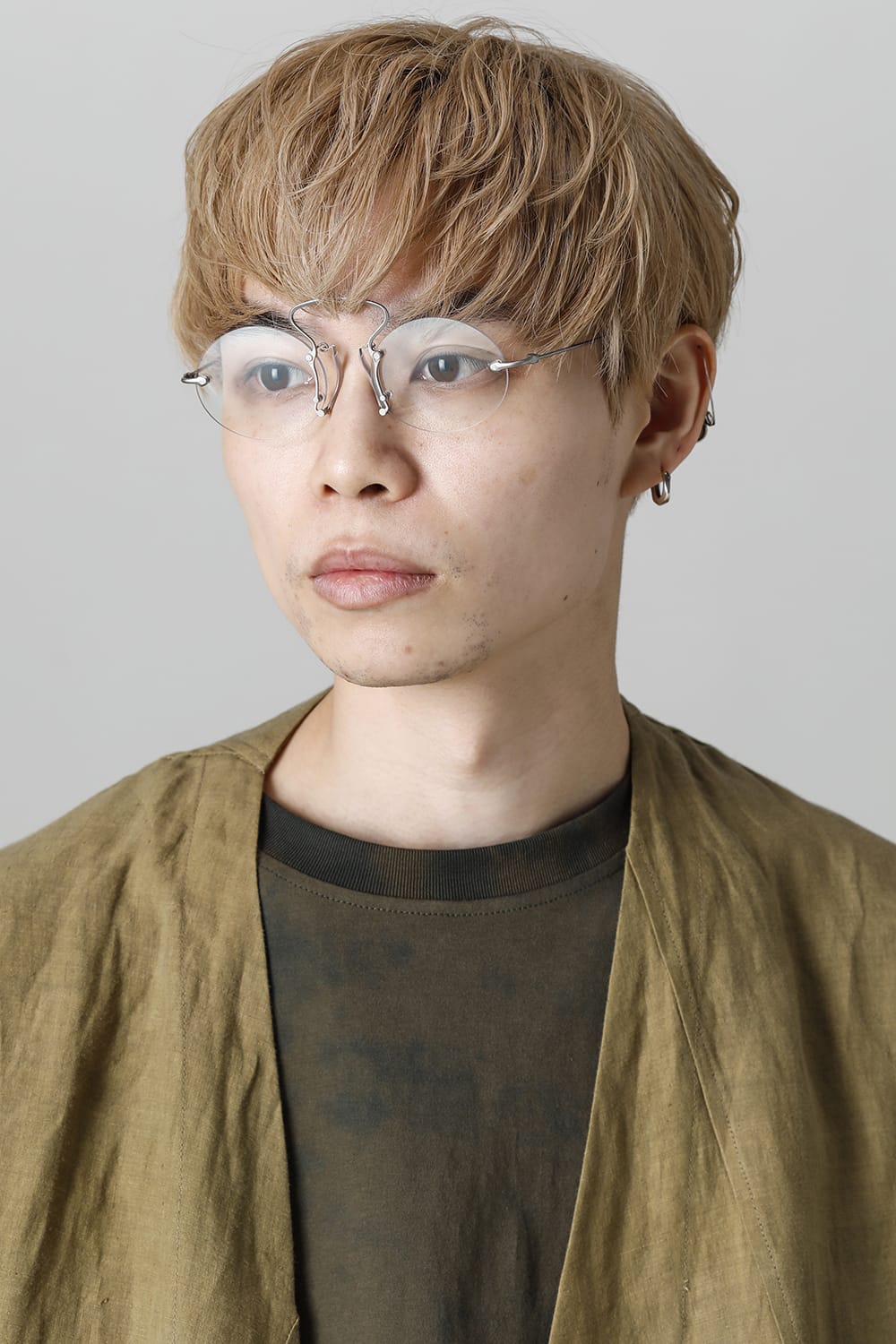 "RG00UW6 PINCE-NEZ Oval" is a model also worn in the UMA WANG 21 -22 AW collection look. This model, named "PINCE-NEZ Oval", originally a rimless design with attached temples, based on the finch-type spectacles that were popular in Europe and the USA in the 19th and early 20th centuries, in which the temples were removed and fixed only at the nose. The nose pad is spring-loaded like the original finch-type, and it is light enough to forget that it has a very good fit. Accented with a curved and distinctive bridge design, the frame comes in two colors: Vintage Black and Vintage Silver. The brand's proposal was mainly color lenses, but our shop has selected clear lenses that bring out the bridge design and are easy to image even when combined with light colored lenses. You can change it to your favorite color or degree lenses, so please enjoy it with your favorite combination.