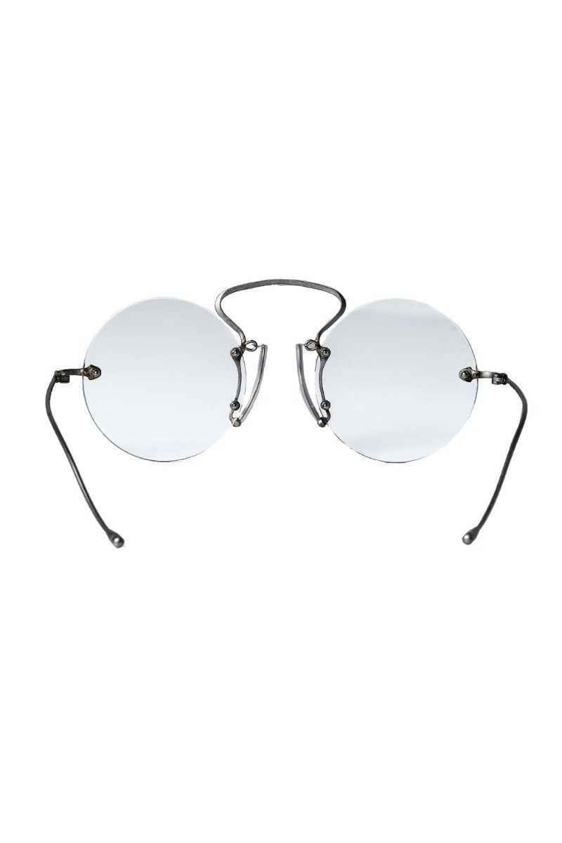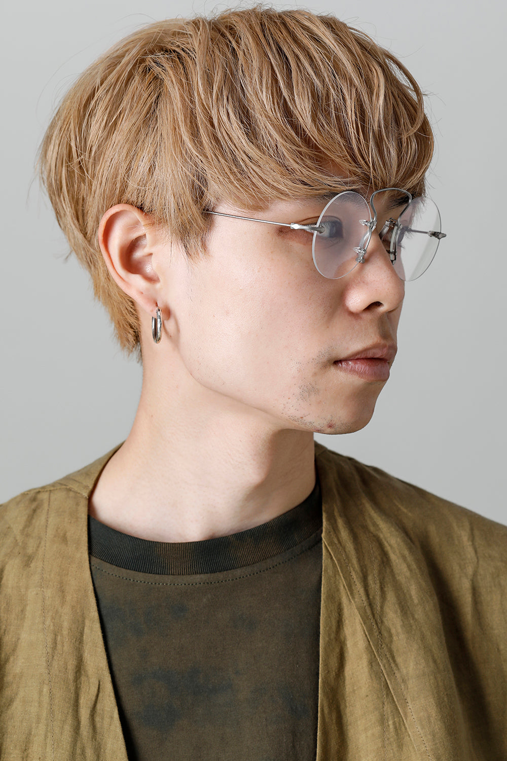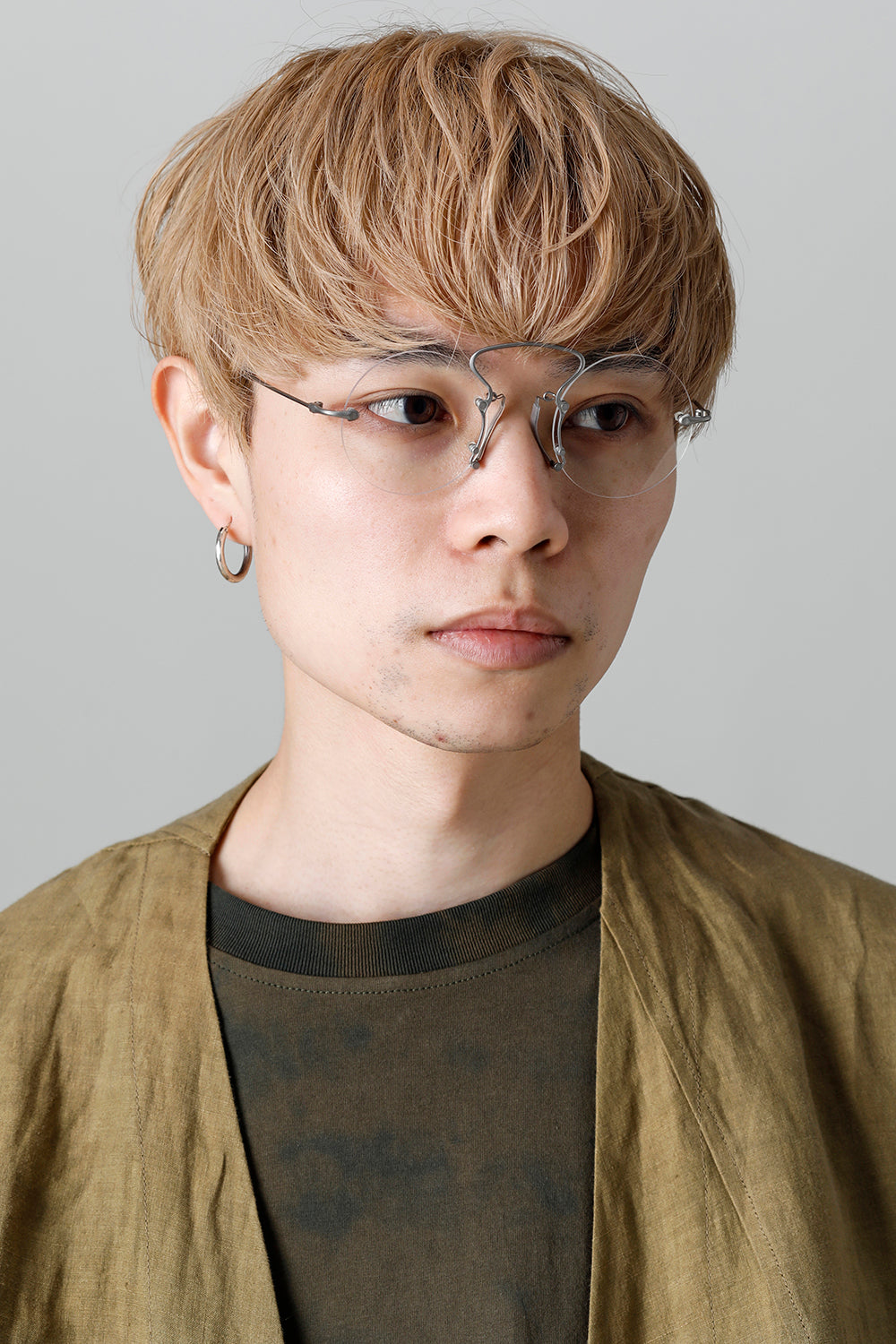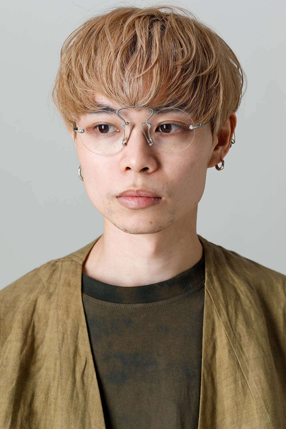 "RG00UW9 PINCE-NEZ Round" is a model that was also worn on the runway of the UMA WANG 22 SS collection. Called "PINCE-NEZ Round", originally a rimless design with attached temples, based on the finch-type spectacles that were popular in Europe and the USA in the 19th and early 20th centuries, in which the temples were removed and fixed only at the nose. The nose pad is spring-loaded like the original finch-type, and it is light enough to forget that it has a very good fit. Accented with a curved and distinctive bridge design, the frame comes in two colors: Vintage Black and Vintage Silver. The brand's proposal was mainly color lenses, but our shop has selected clear lenses that bring out the bridge design and are easy to image even when combined with light colored lenses. You can change it to your favorite color or degree lenses, so please enjoy it with your favorite combination.