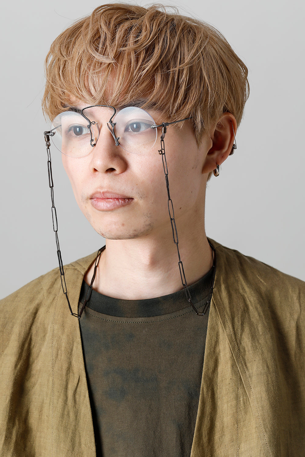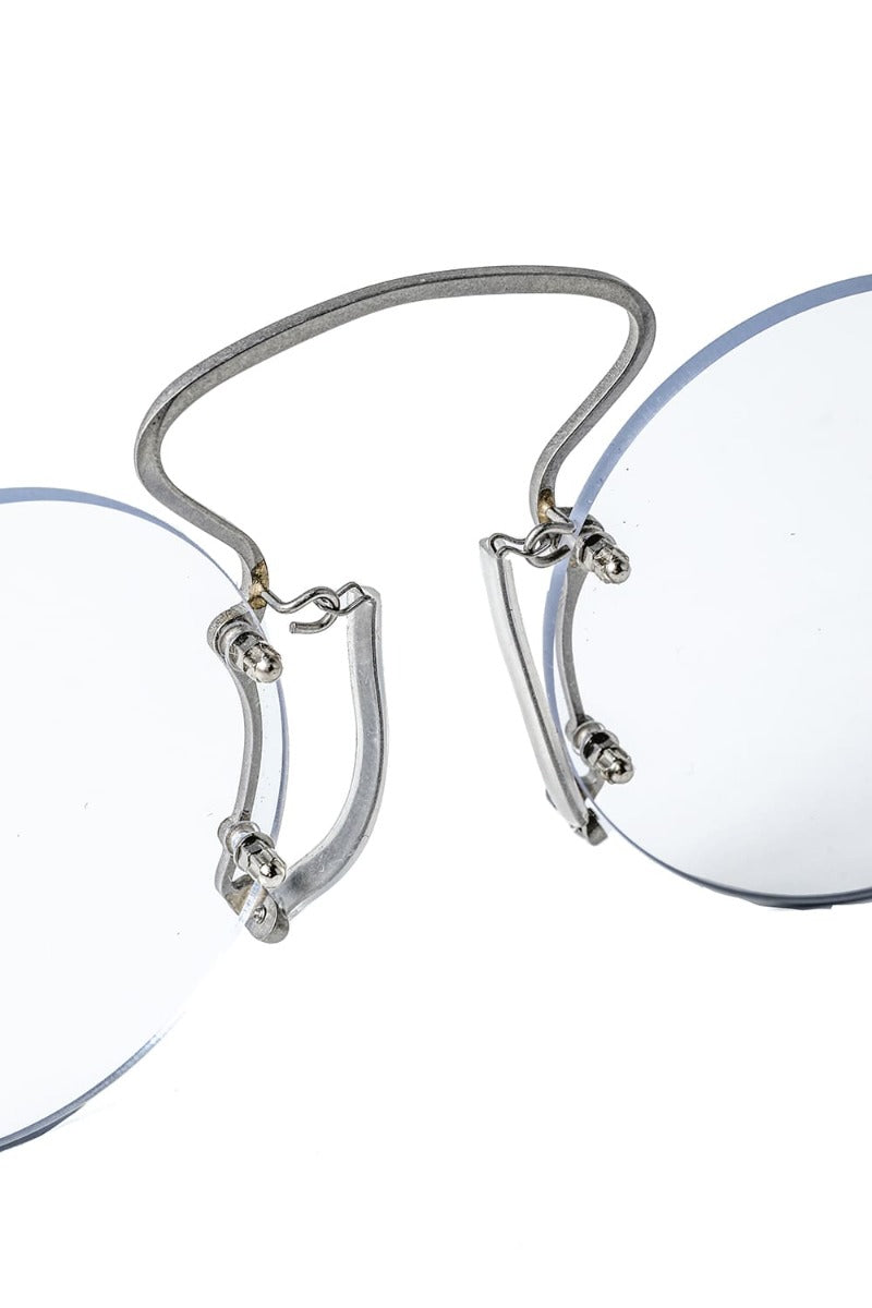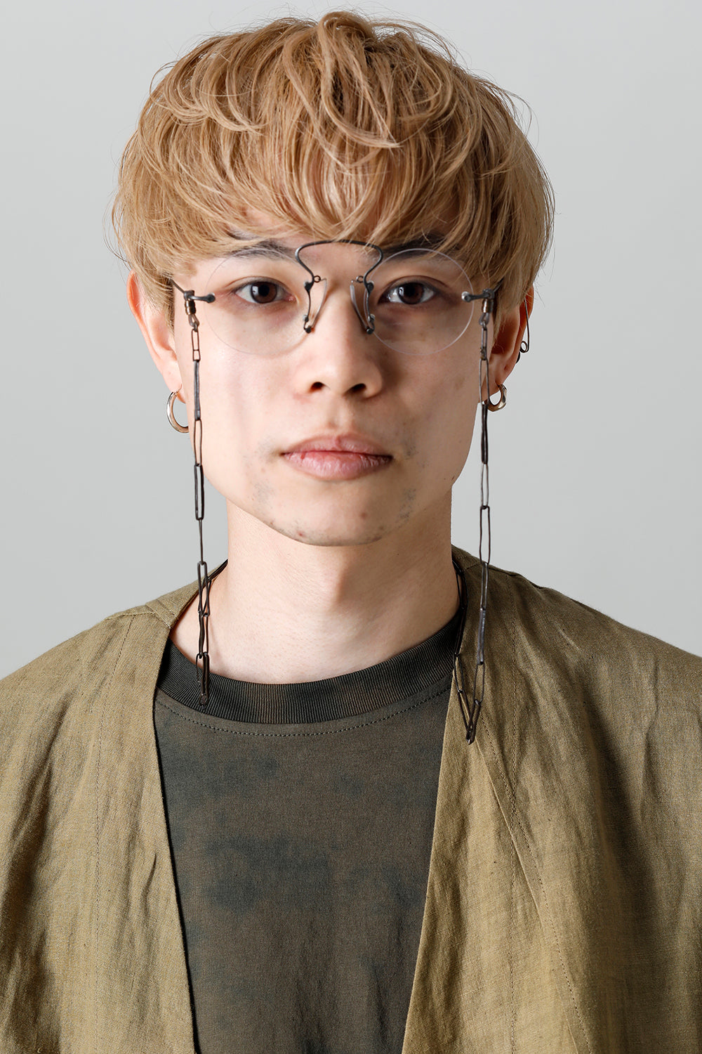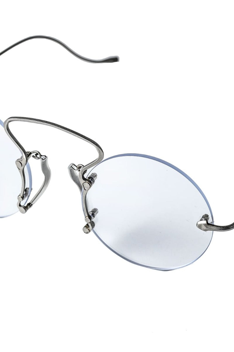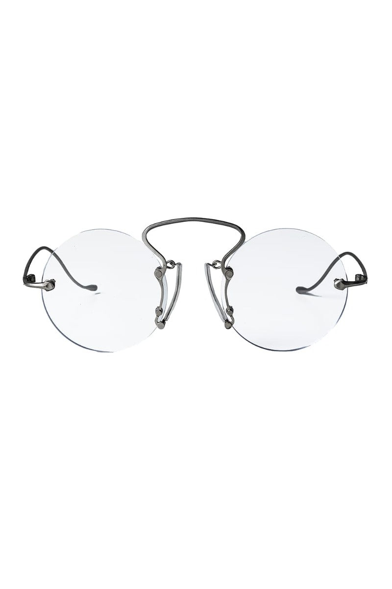 "RG00UW9 PINCE-NEZ Round" is a model that was also worn on the runway of the UMA WANG 22 SS collection. Called "PINCE-NEZ Round", originally a rimless design with attached temples, based on the finch-type spectacles that were popular in Europe and the USA in the 19th and early 20th centuries, in which the temples were removed and fixed only at the nose. The nose pad is spring-loaded like the original finch-type, and it is light enough to forget that it has a very good fit. Accented with a curved and distinctive bridge design, the frame comes in two colors: Vintage Black and Vintage Silver. The brand's proposal was mainly color lenses, but our shop has selected clear lenses that bring out the bridge design and are easy to image even when combined with light colored lenses. You can change it to your favorite color or degree lenses, so please enjoy it with your favorite combination.