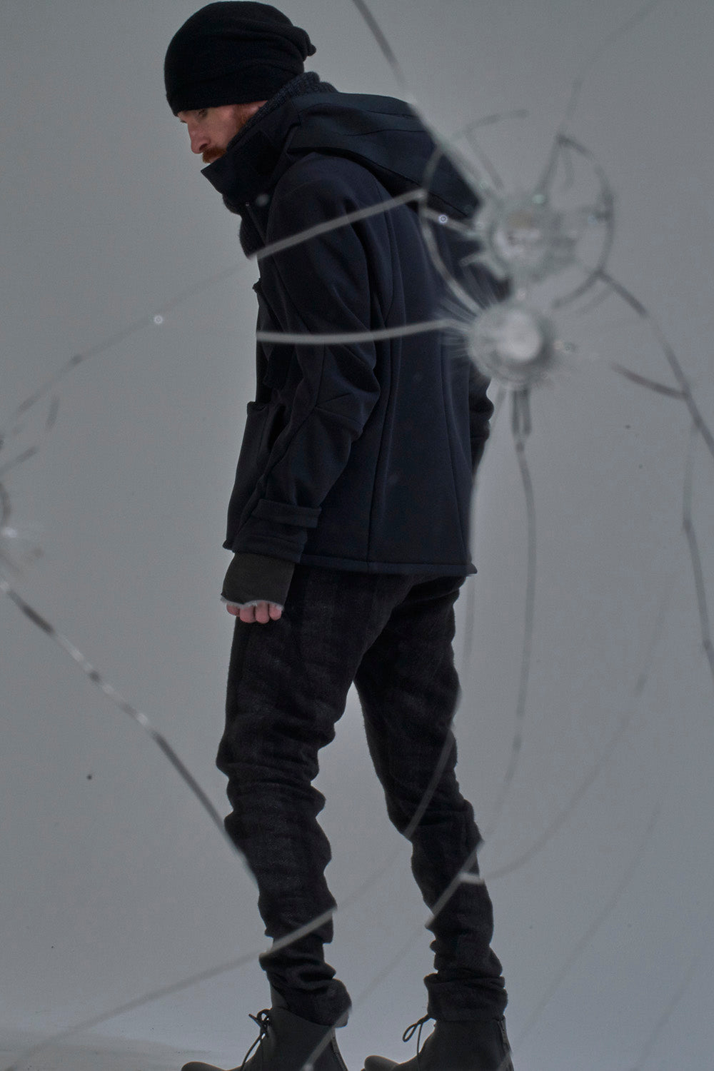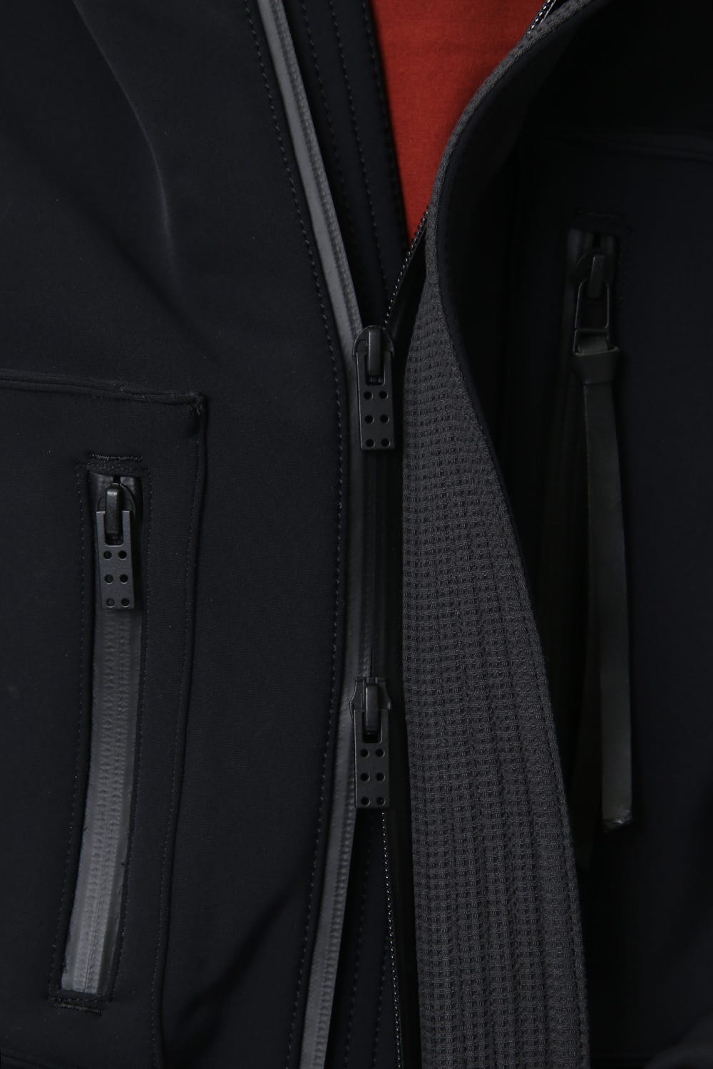 The fabric was produced by Schoeller in Switzerland. The fabric has a three-layer structure, the front side is water repellent, the middle part is crushed cork sheet and the last layer that comes into contact with the skin is a 4way stretch cloth subjected to fine brushed processing. The characteristic of it is that it has a good retention and stretch. The pattern is produced with a regular fit and the design is made as a field parka type with many pockets.