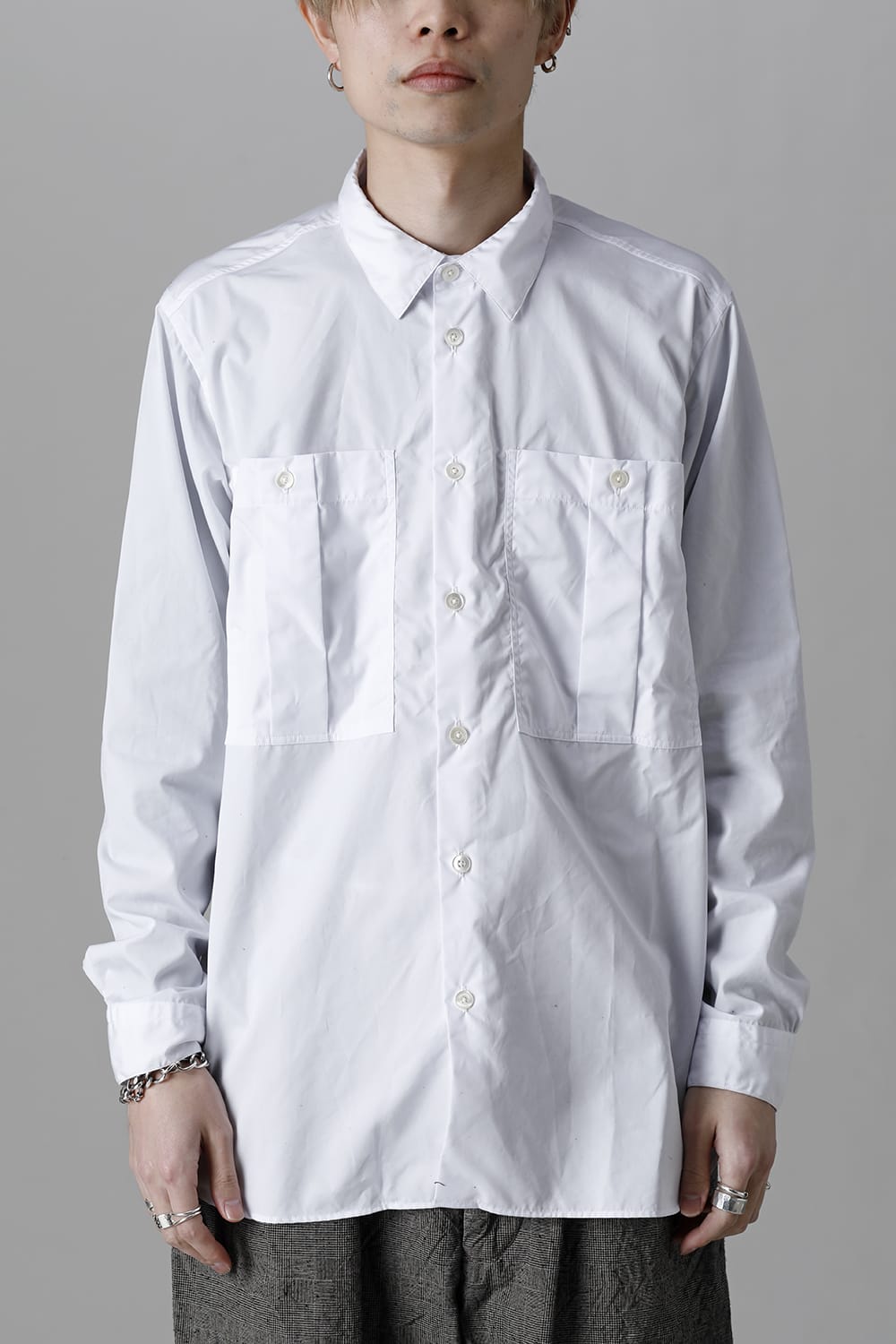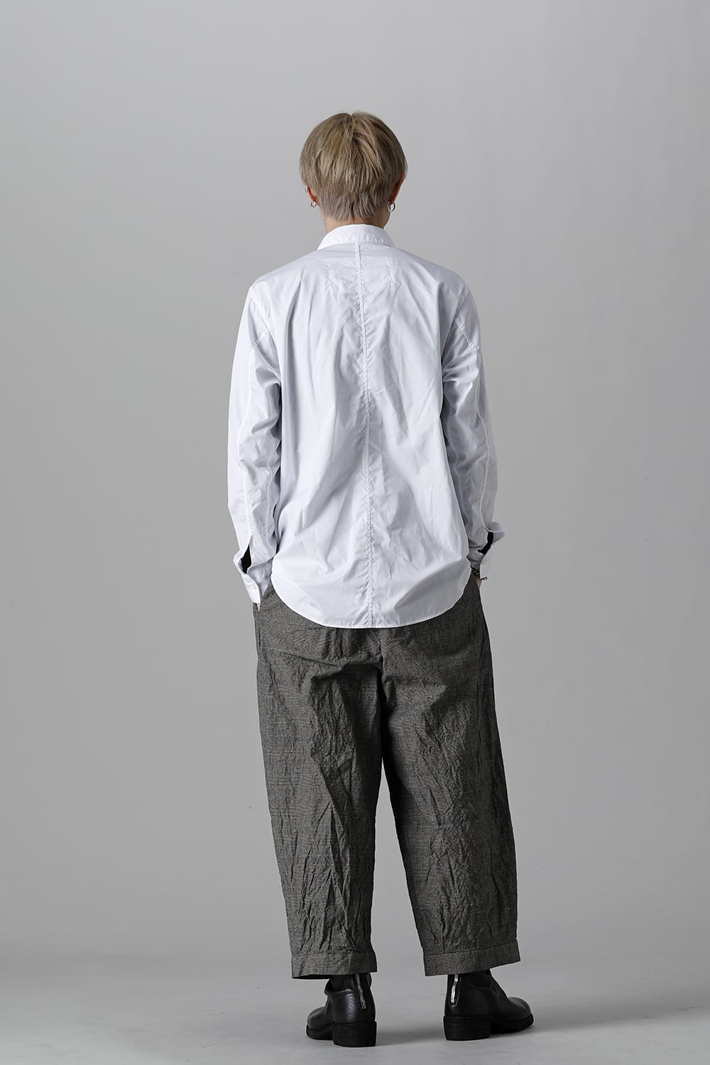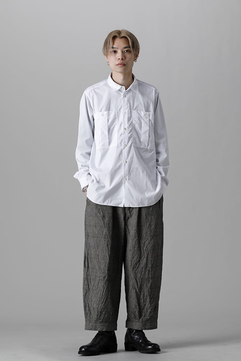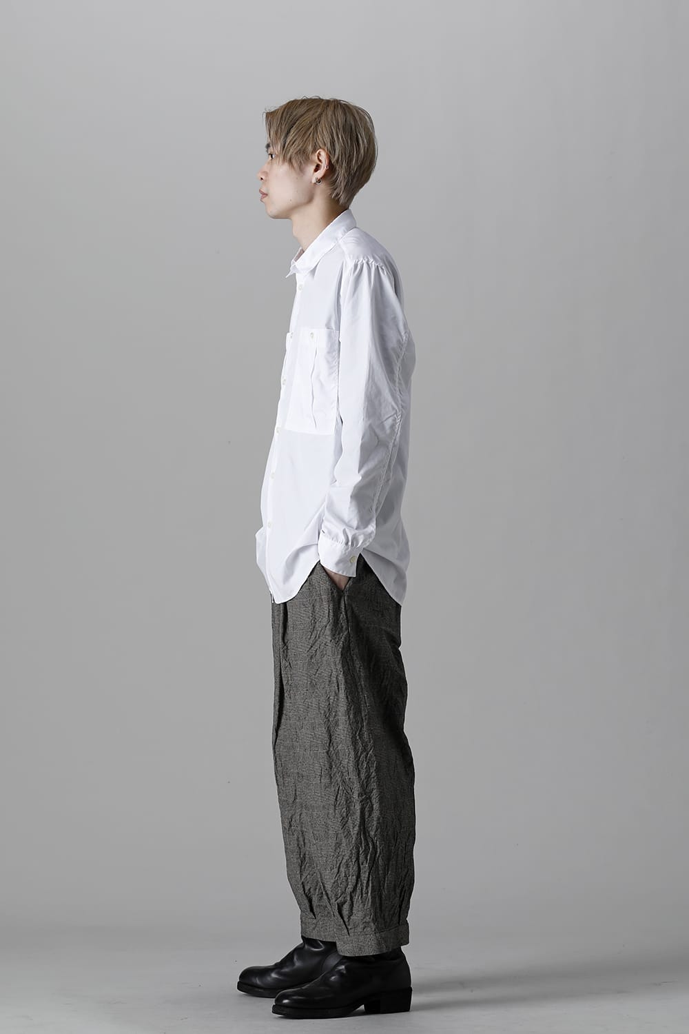 ANNASTESIA exclusive model of Klasica's standard shirt "sh-035", which is not available this season. This is a simple and easy to use shirt with large pockets on both breasts and work shirt details that can be worn casually. The back design, which eliminates the yoke on the shoulder and has a puckering center seam, has a simple yet tasteful appearance. The fabric is broadcloth from Thomas Mason, a world-class mill for shirt fabric. One of the lines is the "Journey" series, which is a fabric that is literally ideal for travel, with strength, sliding, and less wrinkles. Although it has a thickness that is not transparent, it is flexible and gives a relatively soft impression as a Thomas Mason fabric. The washed puckering and loose silhouette is typical of the brand.