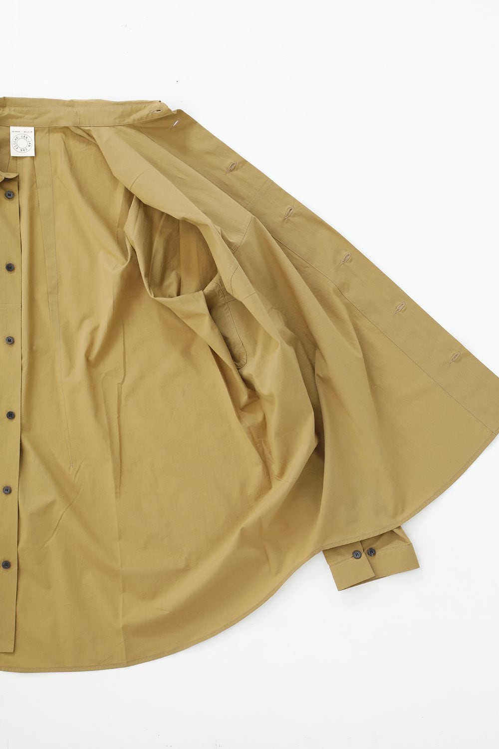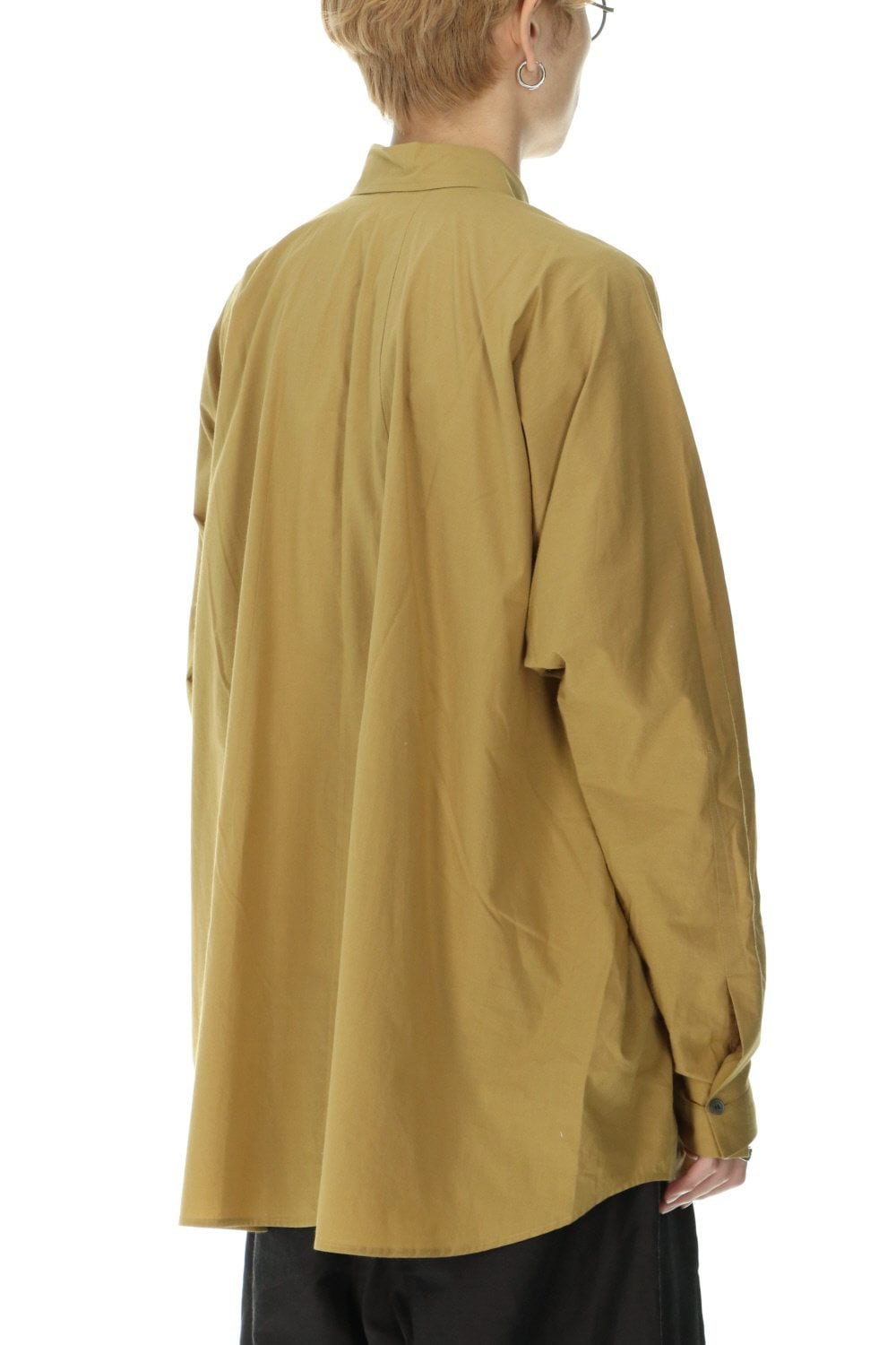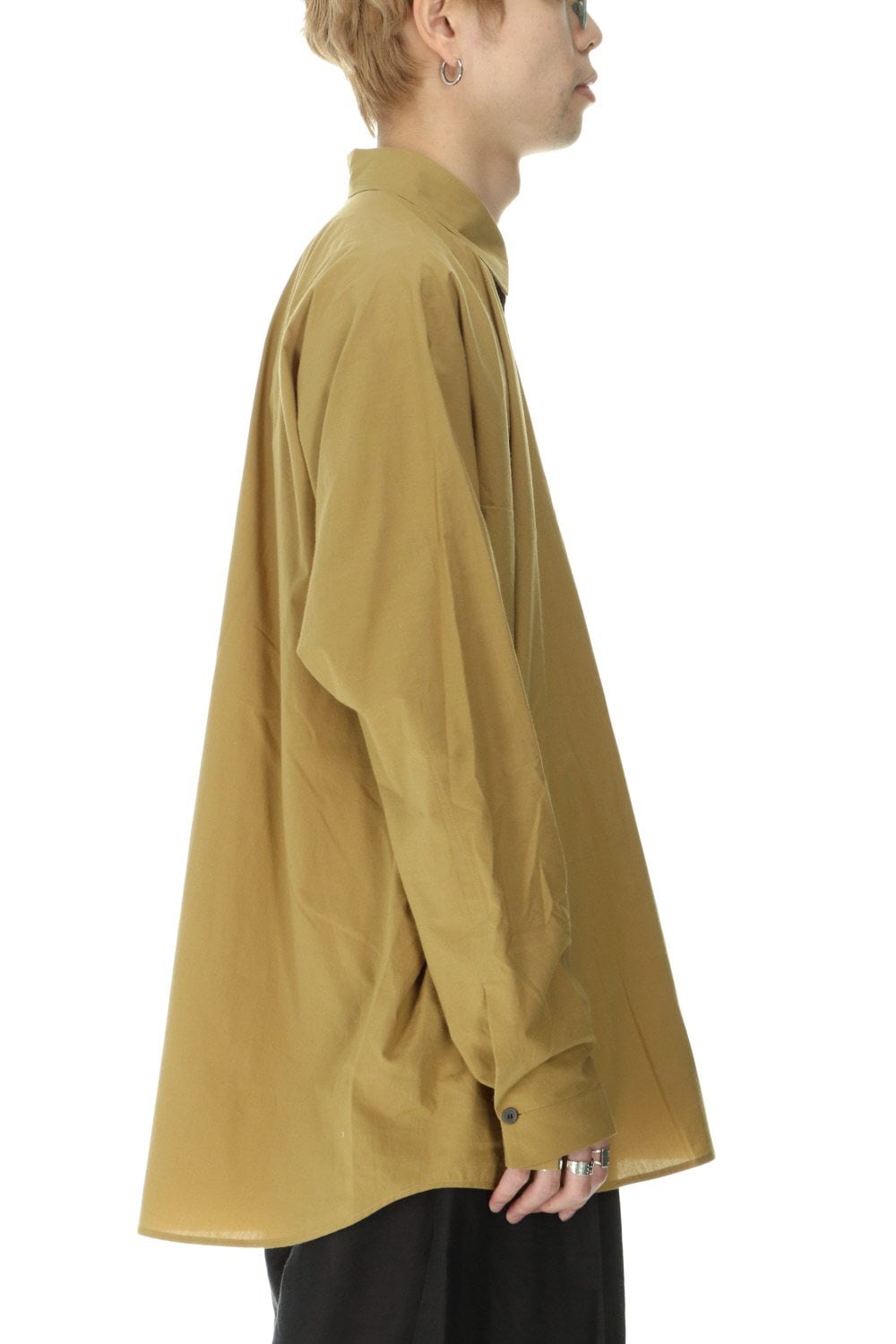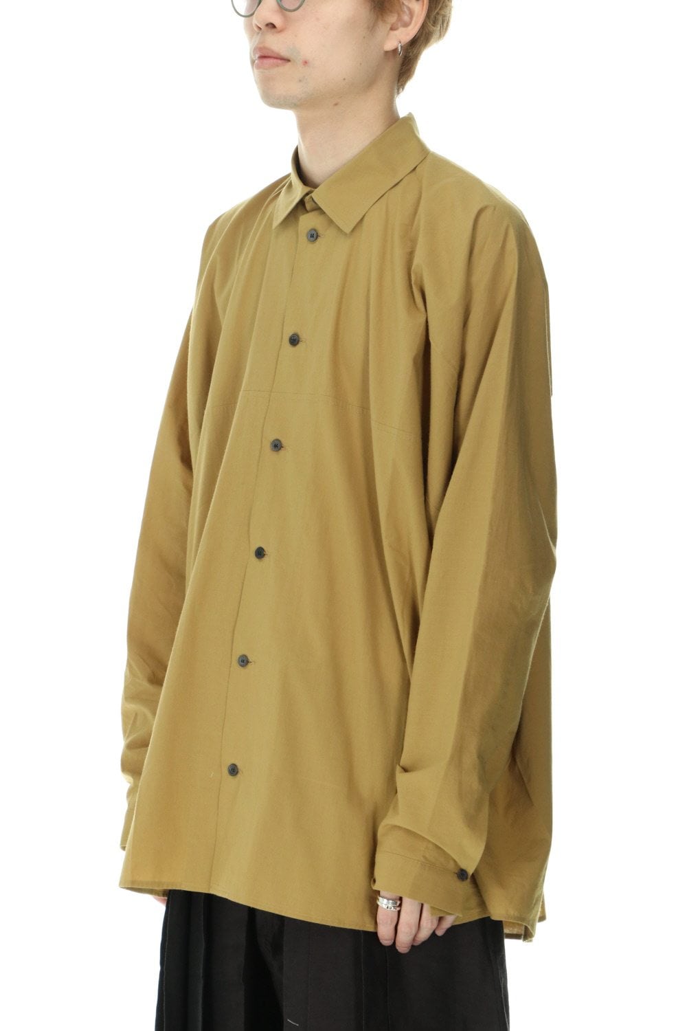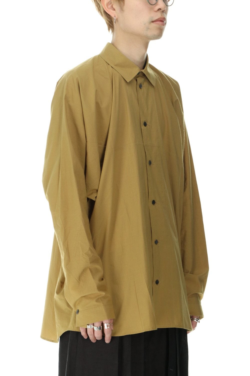 This is a standard wide-fit shirt from the same brand. The sleeves are placed perpendicular to the body of the garment, and a wide-fit silhouette is created by taking a lot of space under the sides. The sleeves and around the neck are made in a regular size to create an oversized but sharp silhouette. This item is made of a fine plain weave fabric. It has a soft yet delicate look. It has a nice mustard color. This item goes well with the Ecru colors that are popular this season.