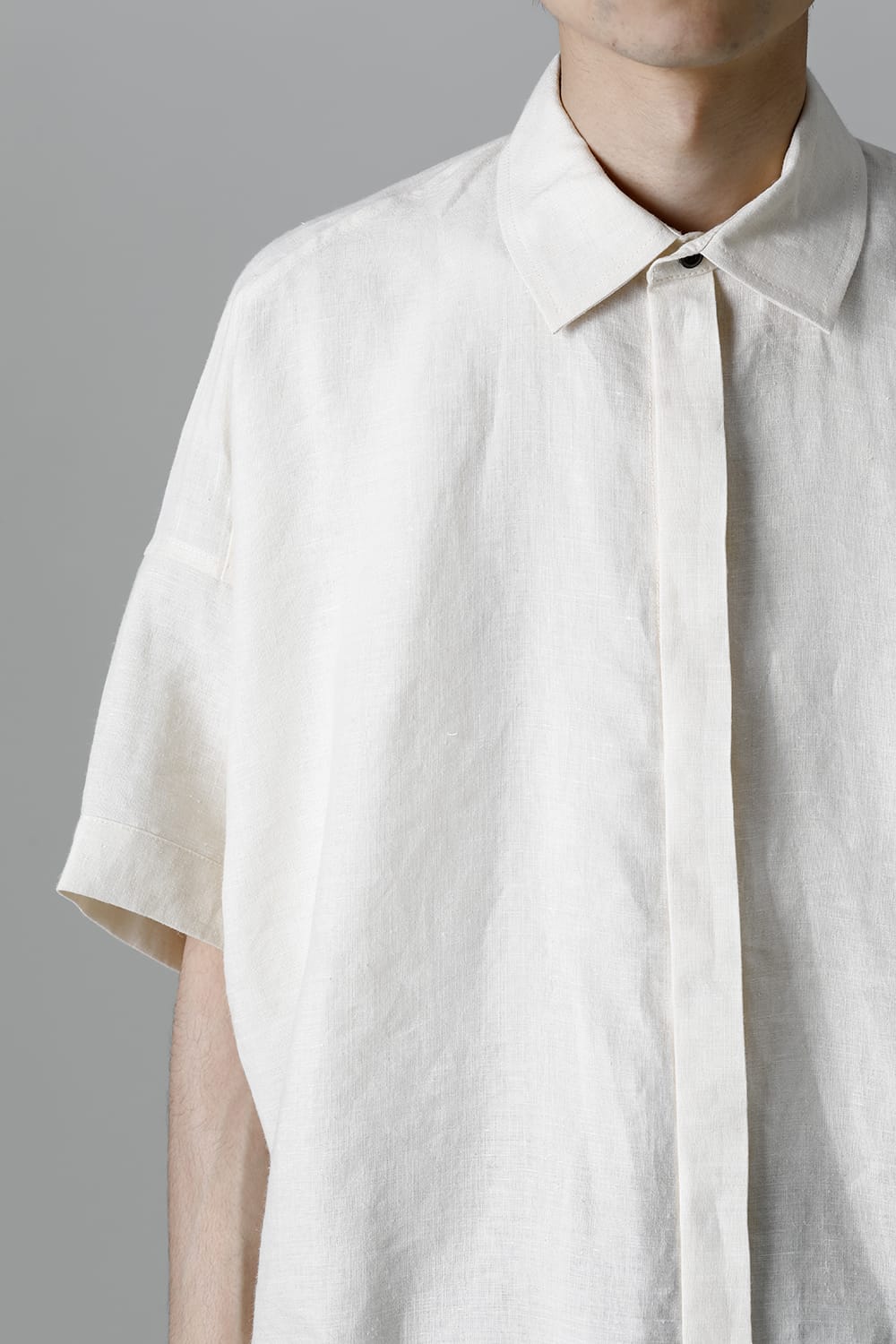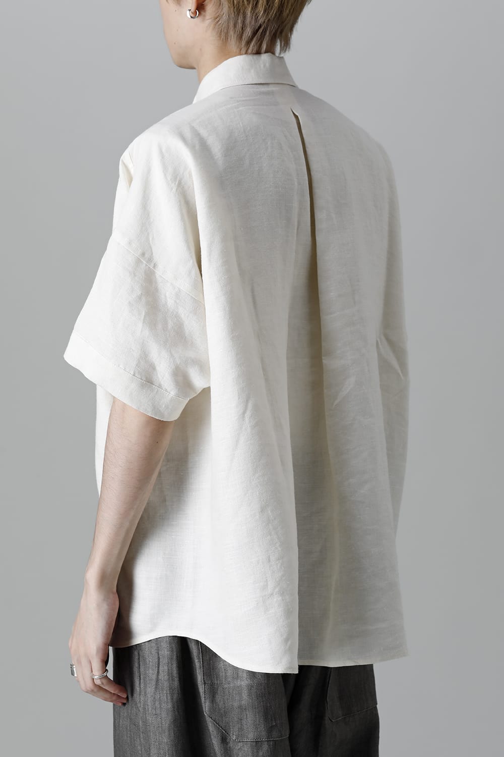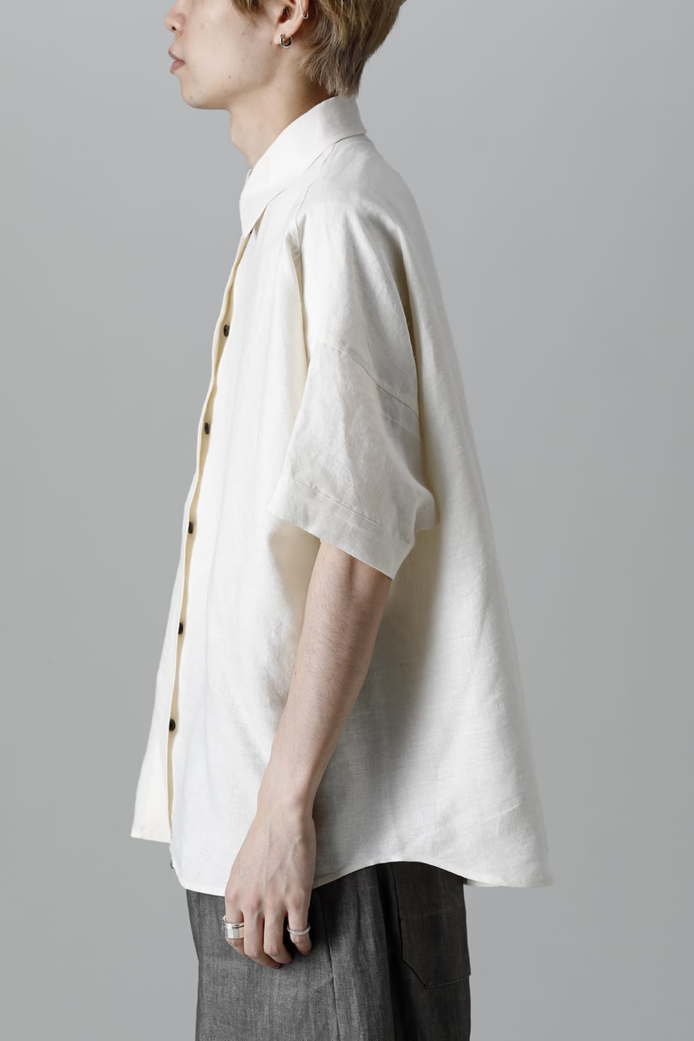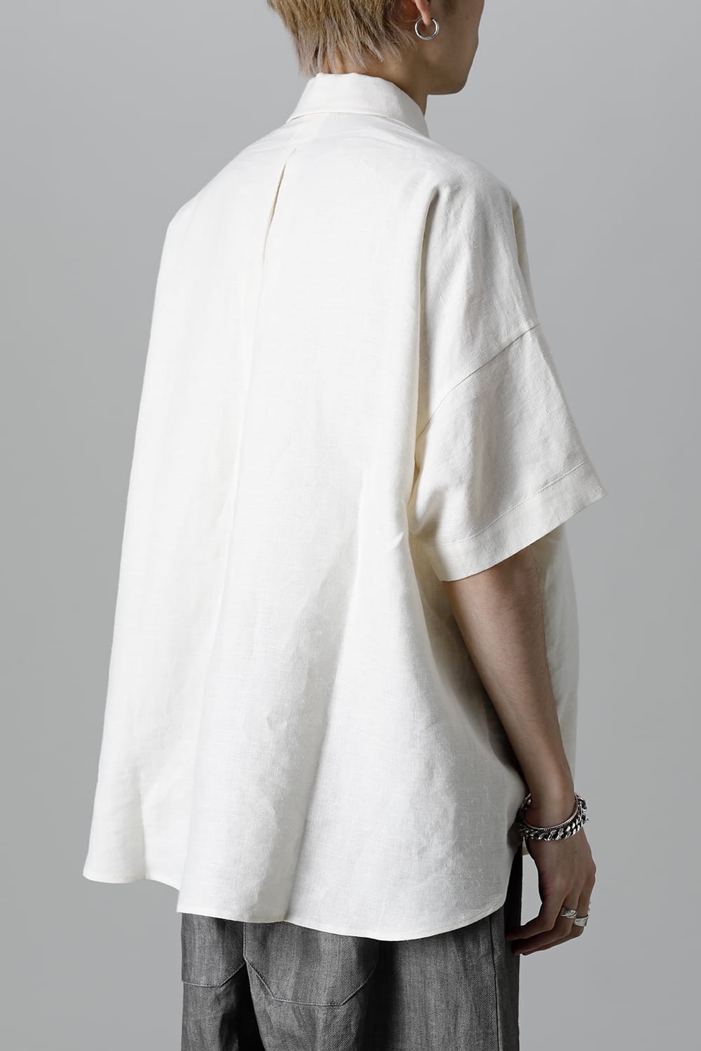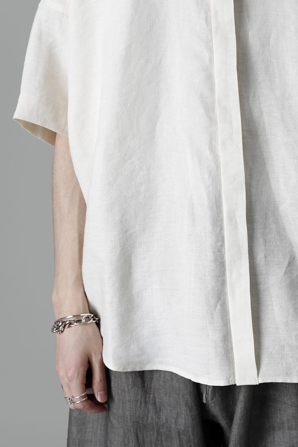 This is a short sleeve shirt with a wide fit that has a one-piece pattern on the front and back of the body, and is based on a regular color shirt with a seemingly basic fly front. The back body has box pleats, continuing from the 21 -22 AW collection, to keep a clean silhouette with a one-piece pattern that doesn't leave much on the fabric. This item is characterized by the unique pattern of JAN-JAN VAN ESSCHE that does not cut and paste the fabric as much as possible. For example, the fly front part is treated by folding the fabric around the body. The fabric is made of hemp jersey stitch and has a light weight and matte texture. The more you wear it, the more roundish wrinkles will appear and the more gentle it will look.