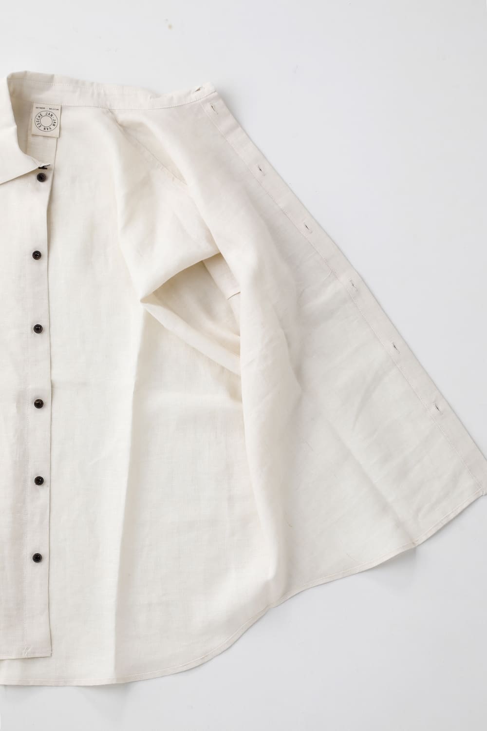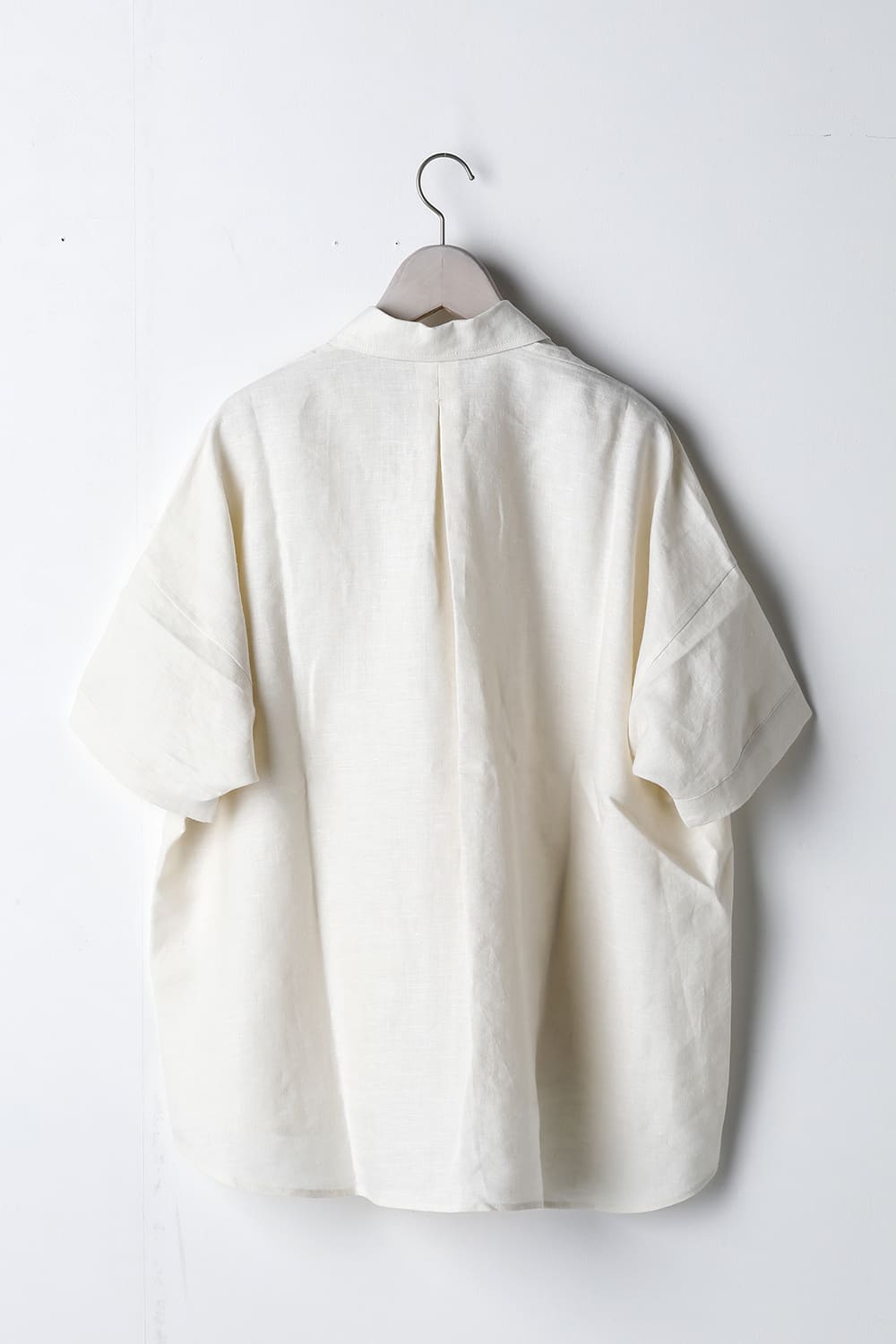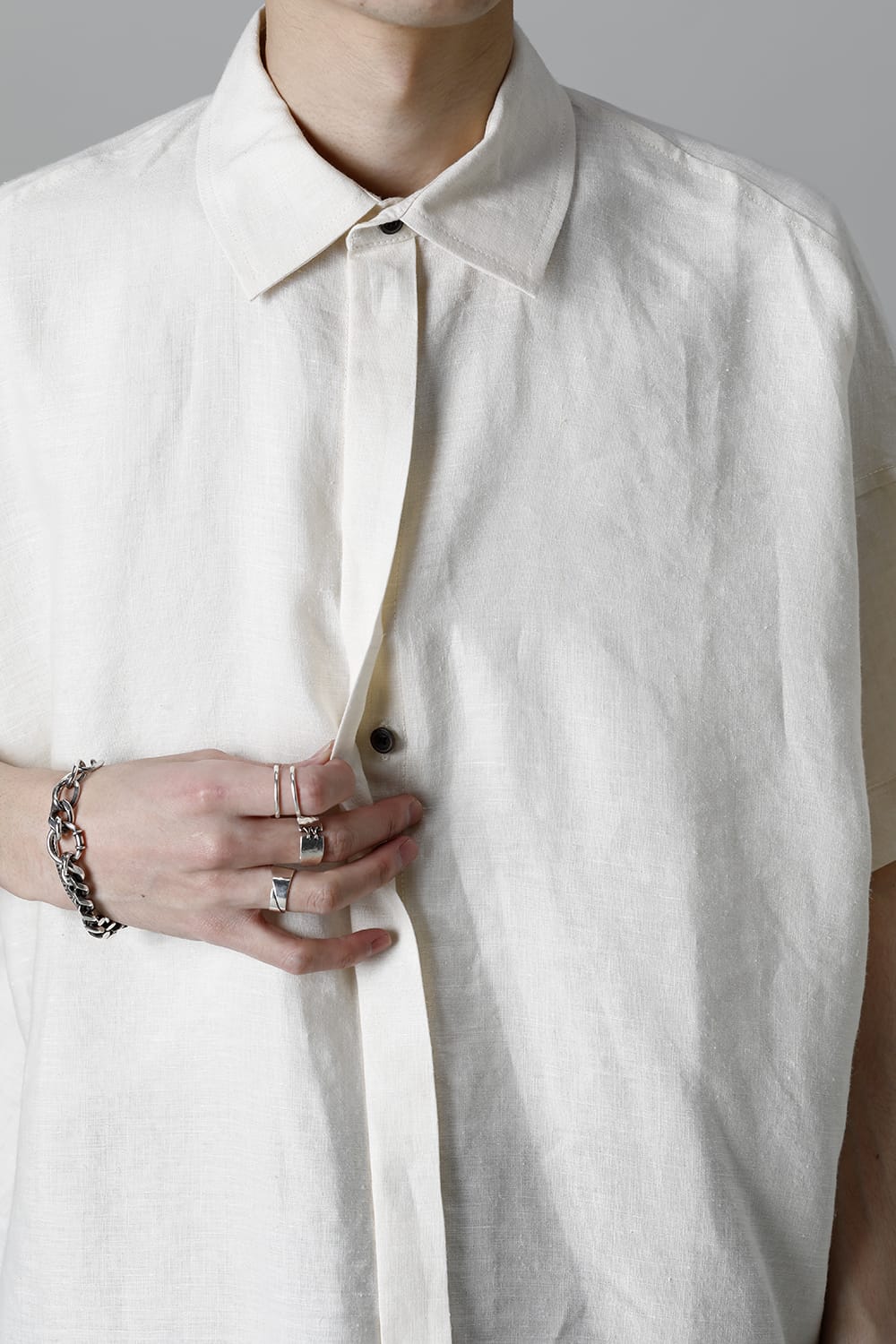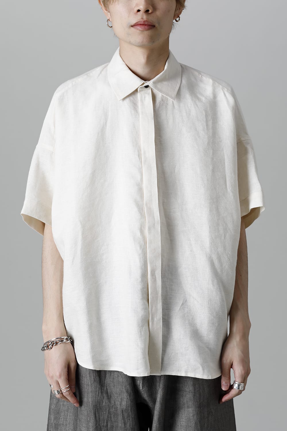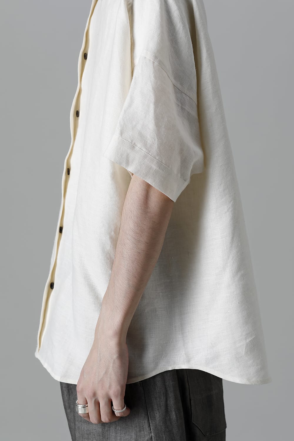 This is a short sleeve shirt with a wide fit that has a one-piece pattern on the front and back of the body, and is based on a regular color shirt with a seemingly basic fly front. The back body has box pleats, continuing from the 21 -22 AW collection, to keep a clean silhouette with a one-piece pattern that doesn't leave much on the fabric. This item is characterized by the unique pattern of JAN-JAN VAN ESSCHE that does not cut and paste the fabric as much as possible. For example, the fly front part is treated by folding the fabric around the body. The fabric is made of hemp jersey stitch and has a light weight and matte texture. The more you wear it, the more roundish wrinkles will appear and the more gentle it will look.