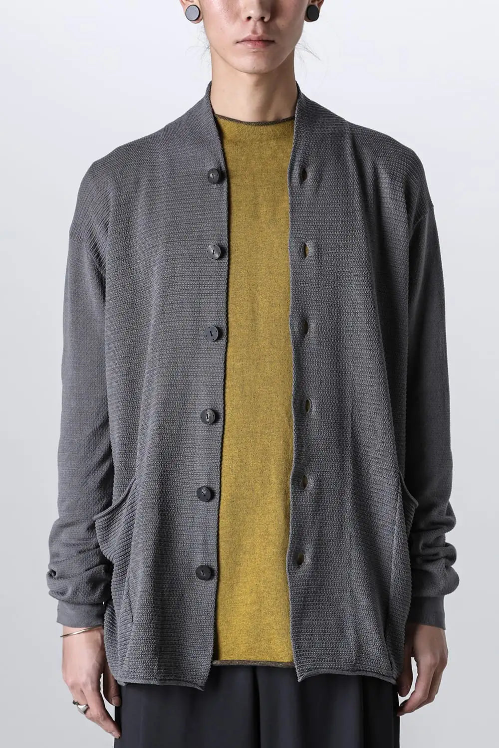 By placing buttons at a higher position, it can be worn fully buttoned up for a jacket-like appearance.