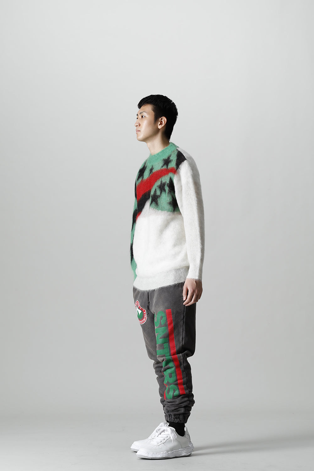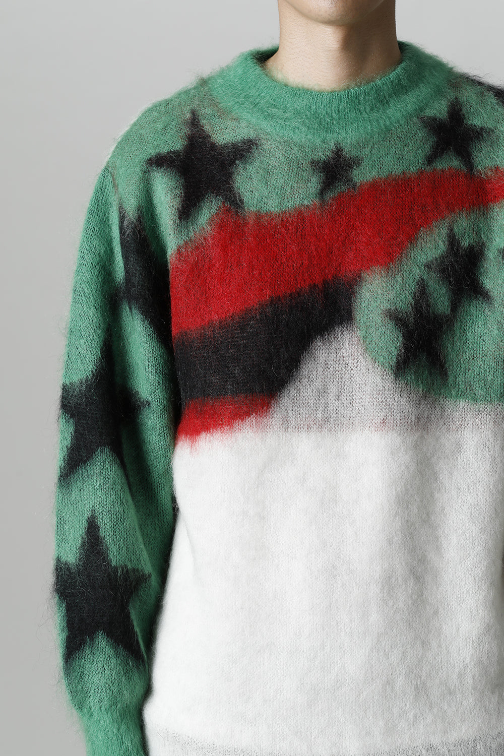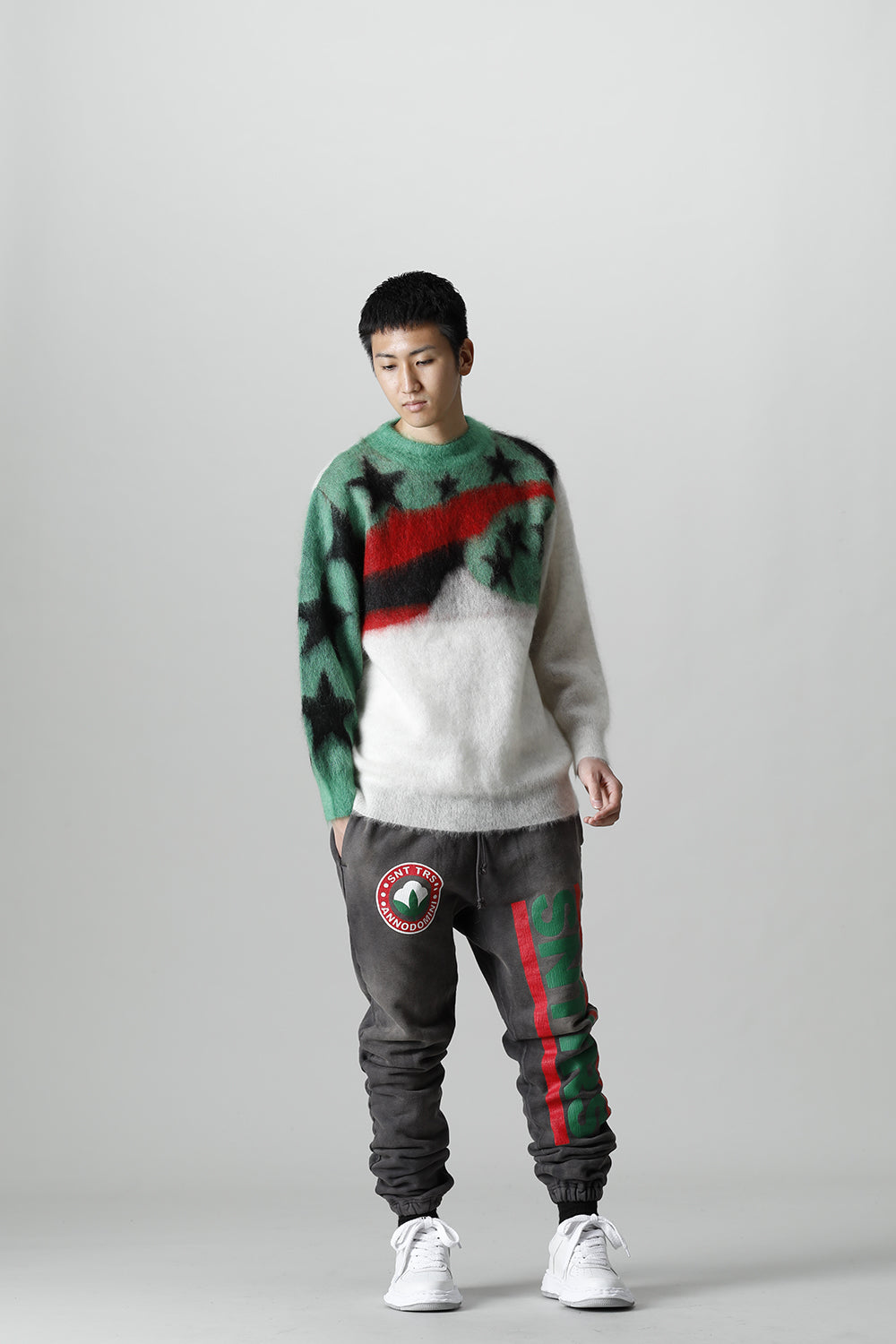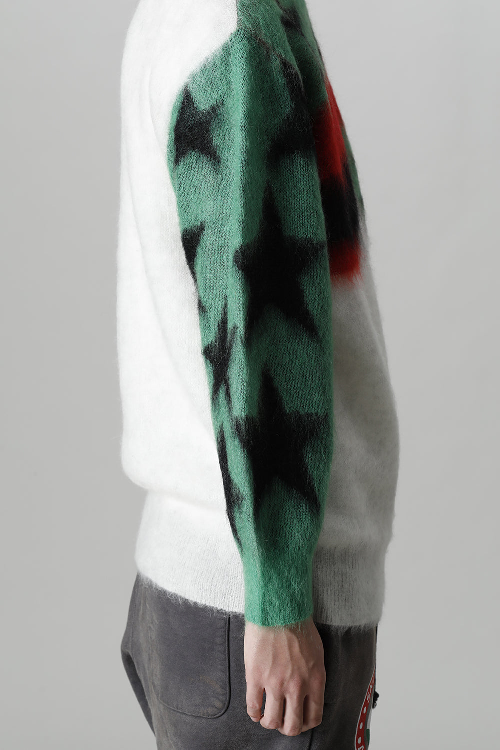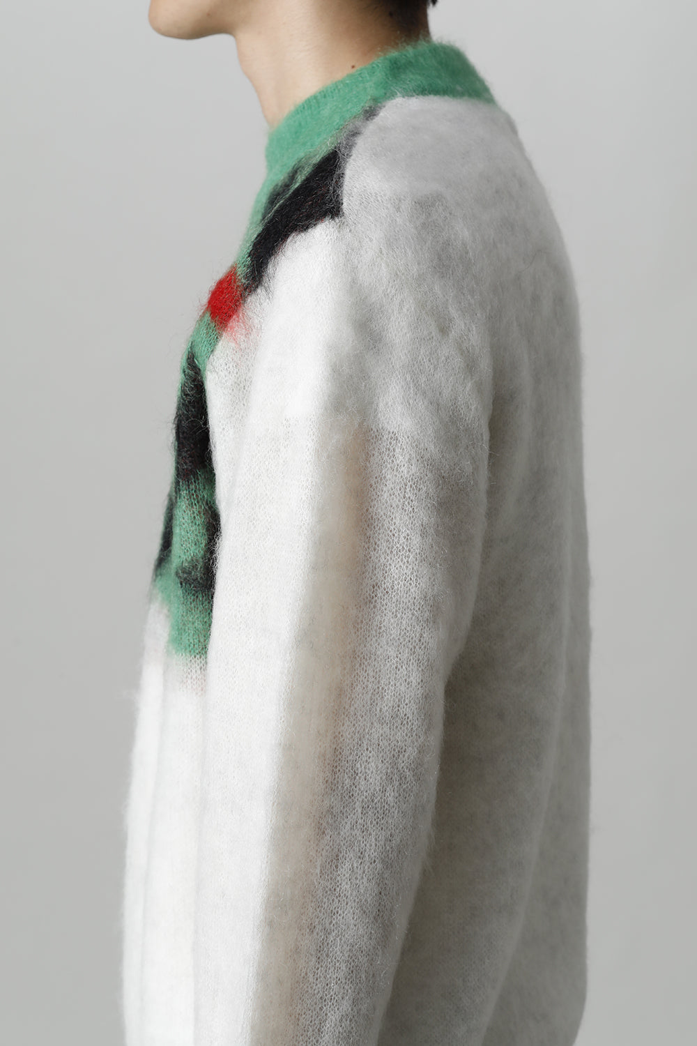 This is the first knit item of the brand and is a mohair knit with a pop impression in color and design.