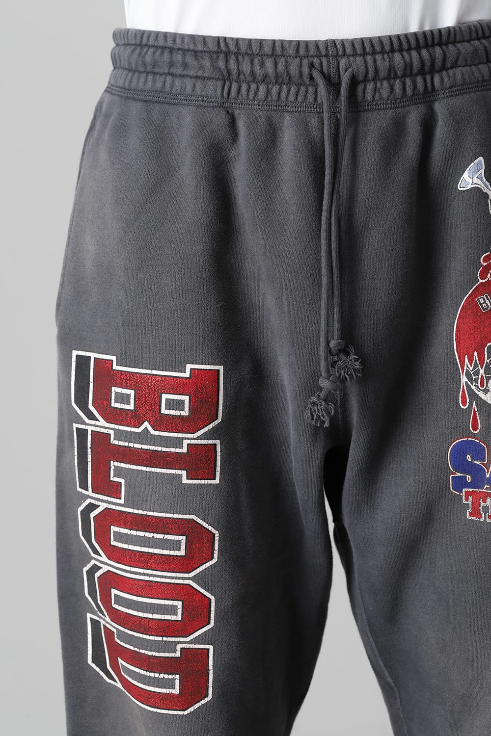 Sweatpants with a graphic print of the Holy Grail and "BLOOD OF THE SON," which signifies that Joseph of Arimathea received a drop of the blood of Jesus Christ that was dropped from the cross.