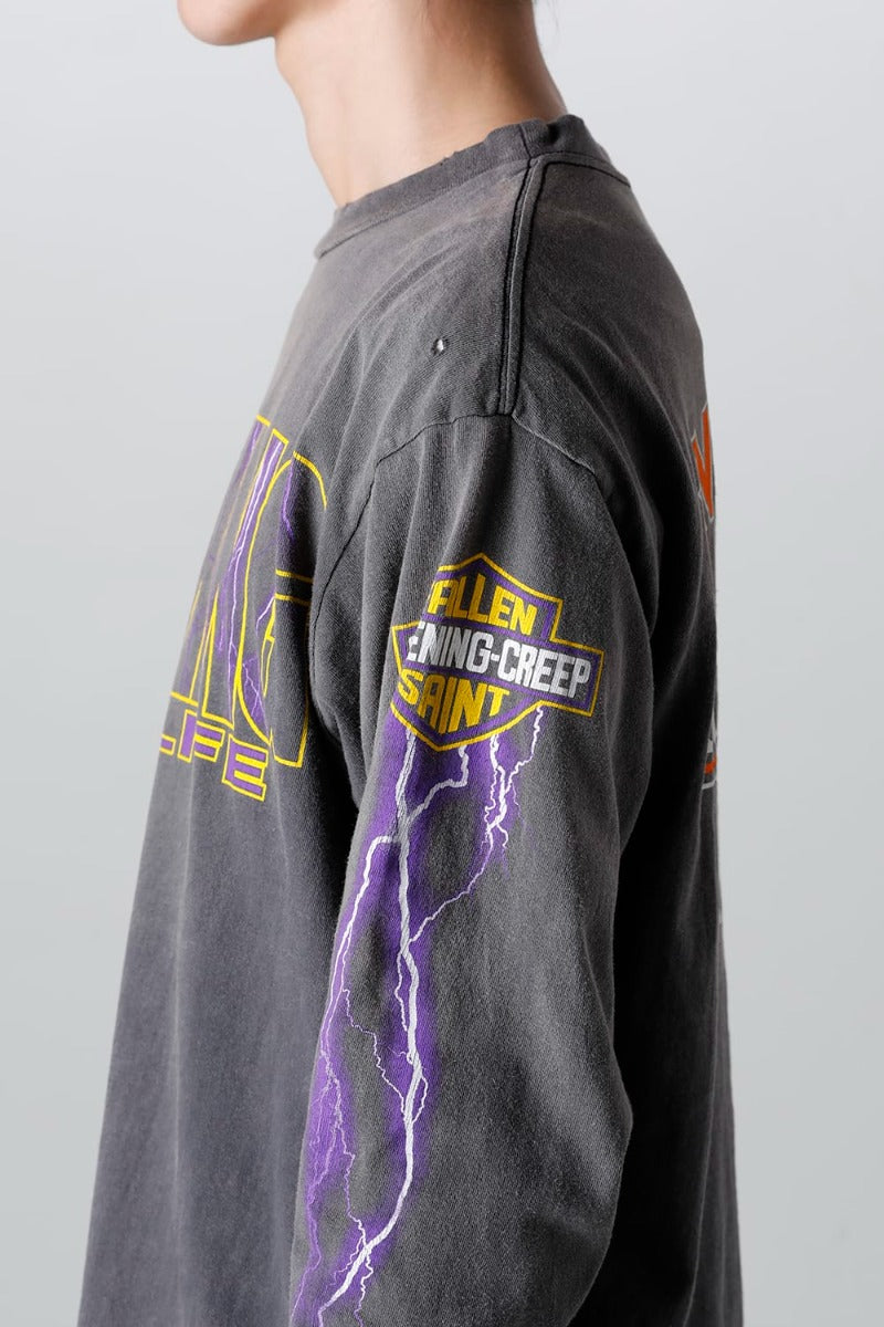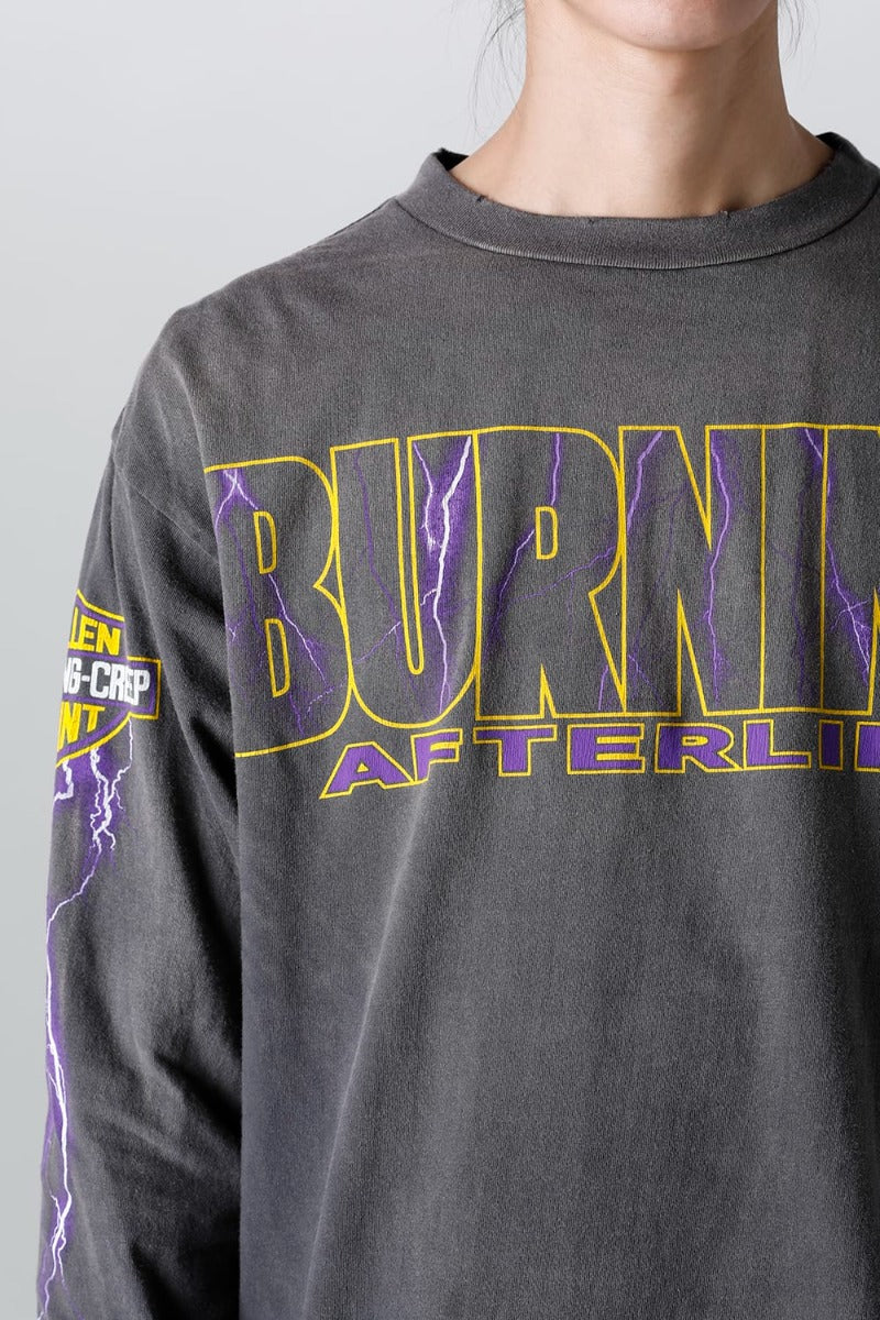 A long-sleeved T-shirt with the words "BURNING" on the front and a realistic thunder print on the sleeves.