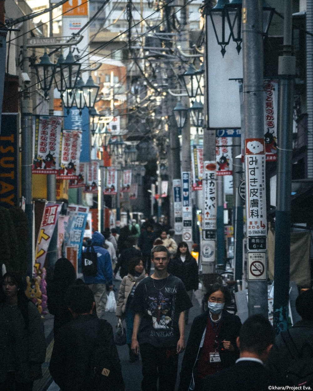 A design featuring a collage of characters from "Evangelion" including Asuka Langley Soryu, Shinji Ikari, Rei Ayanami, Gendo Ikari, Misato Katsuragi, Ritsuko Akagi, and Unit-01 on the front, with the brand name printed on the back.