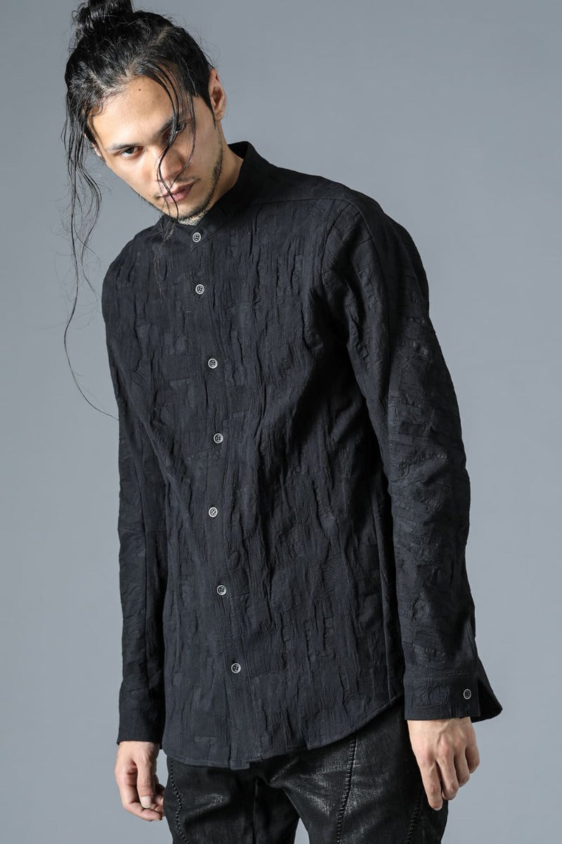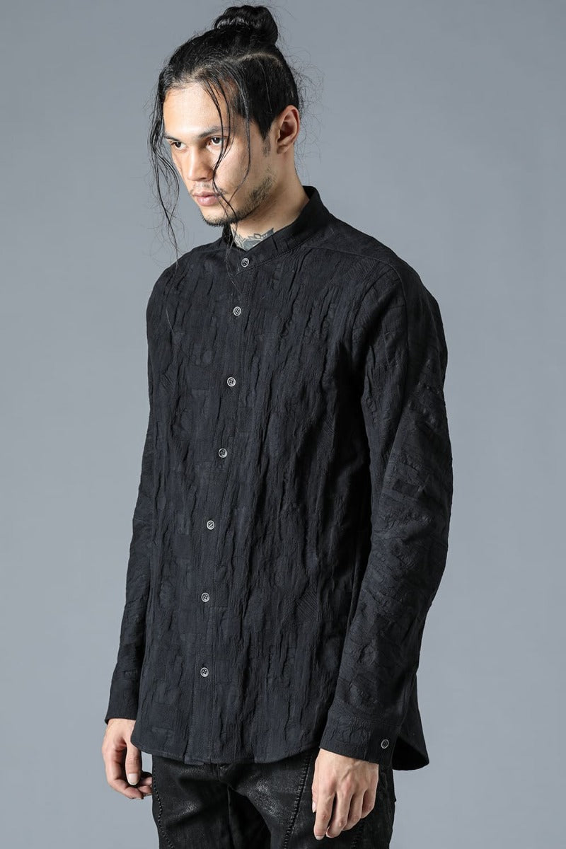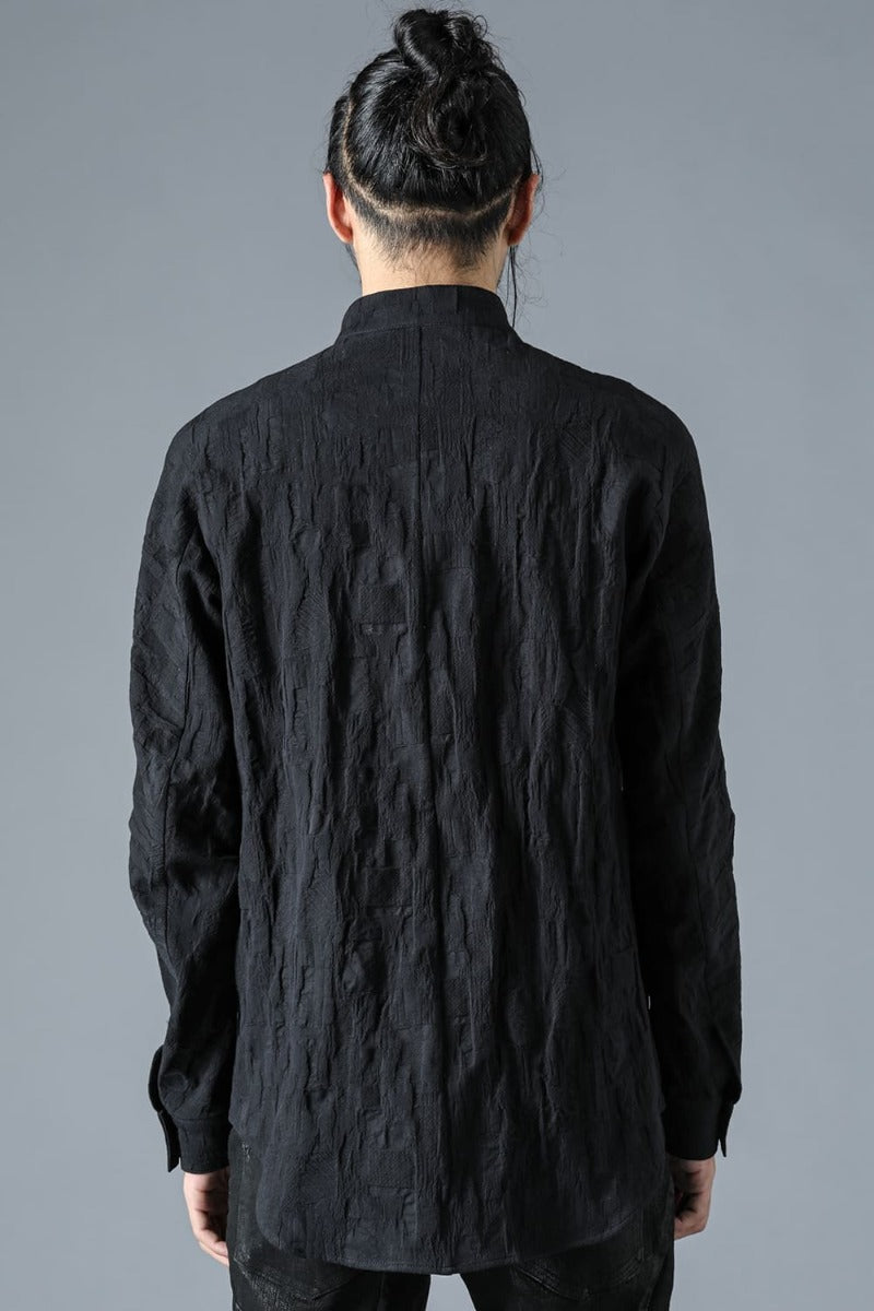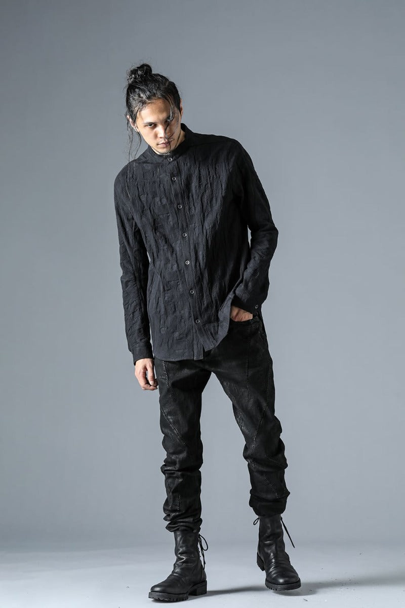 ・Original jacquard weave fabric with the impression of SCABS. Stretchability and three-dimensionality are enhanced by adding polyurethane to the weft threads. The weft threads are skipped in some places to express stitch marks. The metal buttons are painted matte black and have the edges shaved off.