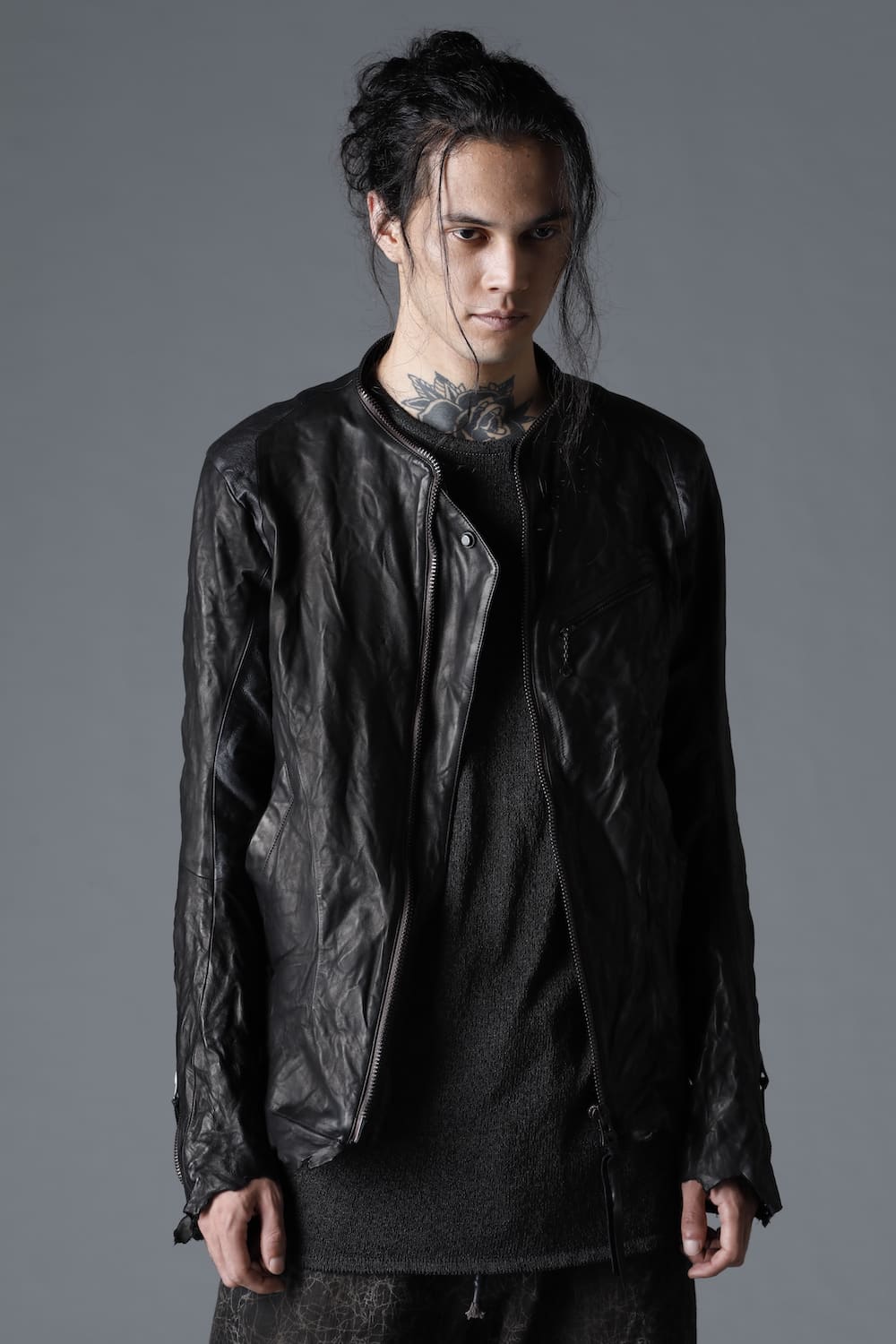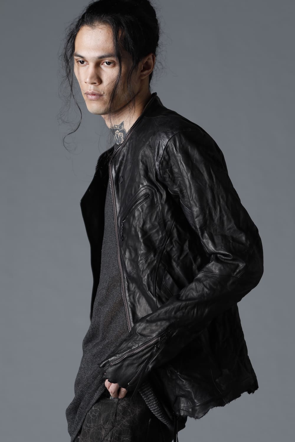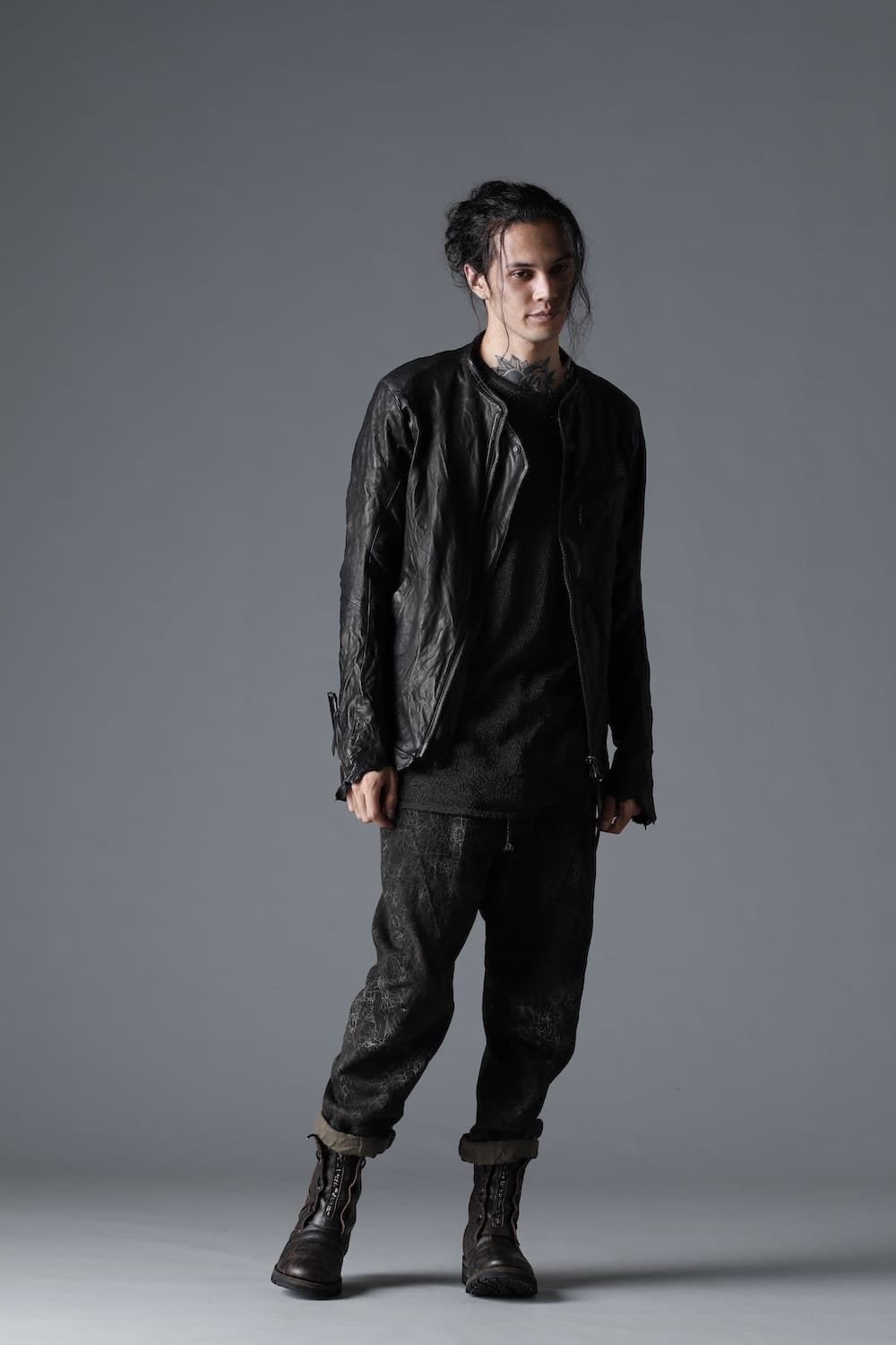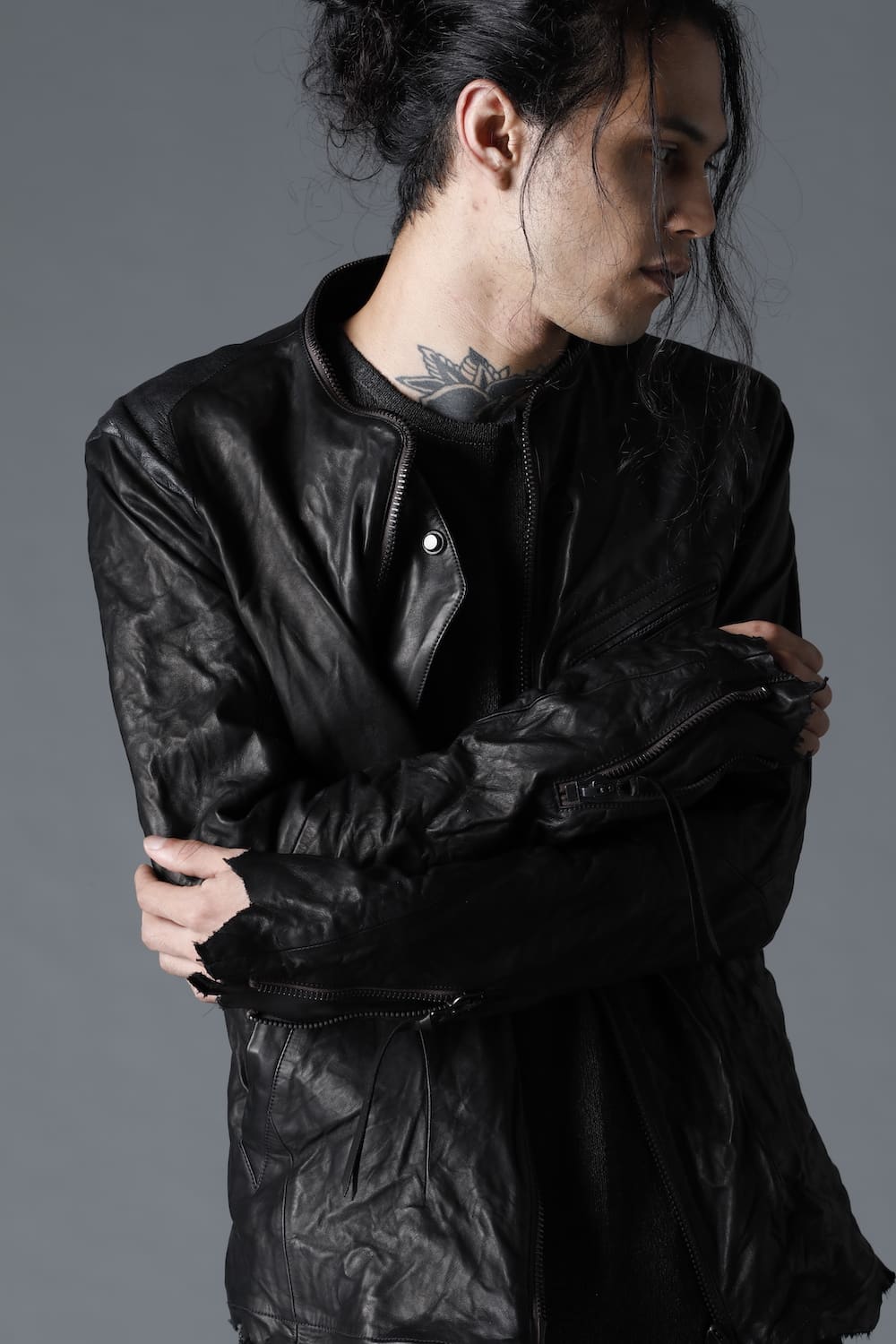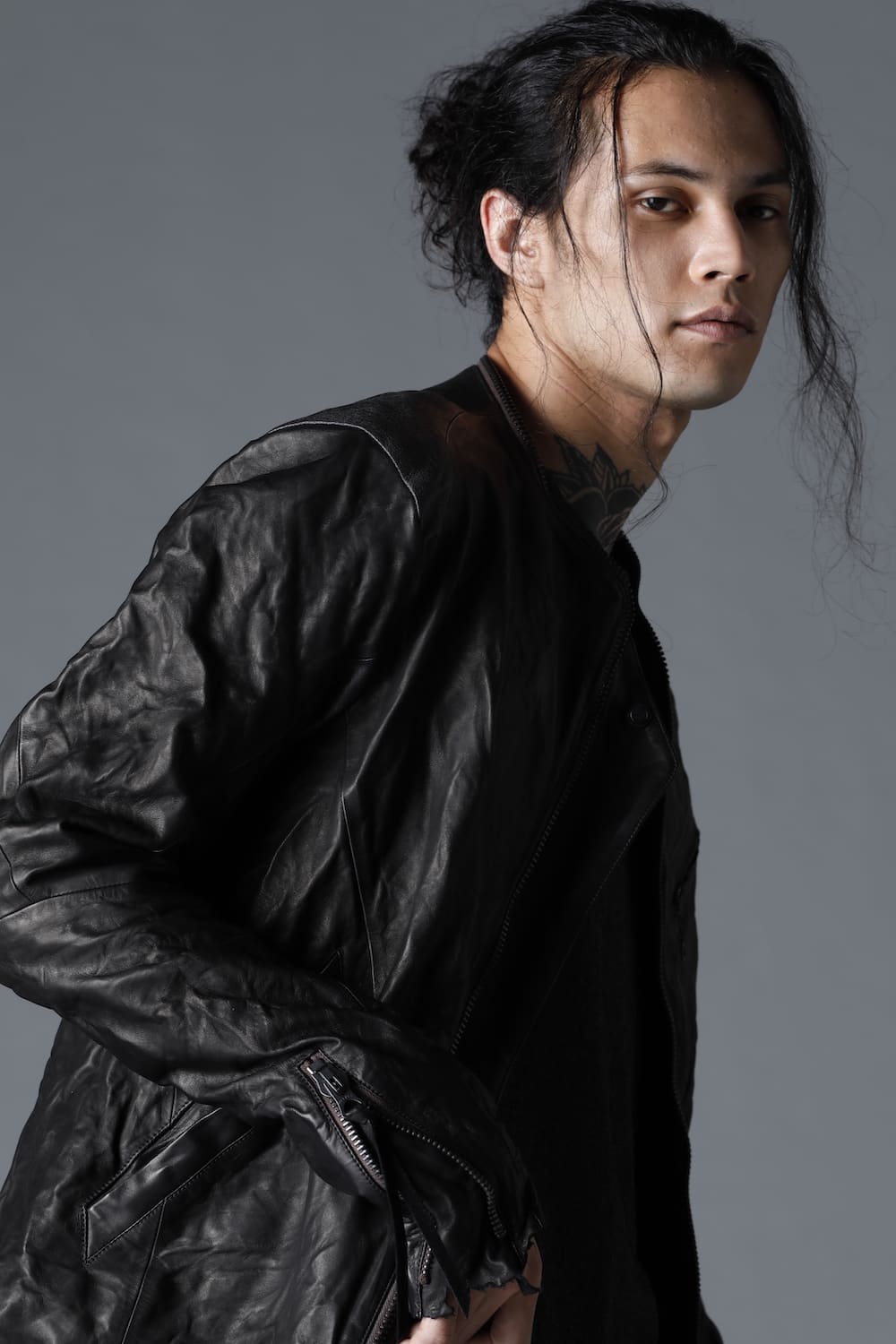 C/#BLACK is made of stretchy deerskin on the shoulders and underarms, and leather edges are used on the cuffs and hem for a rough image.