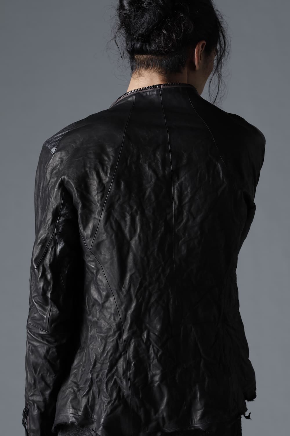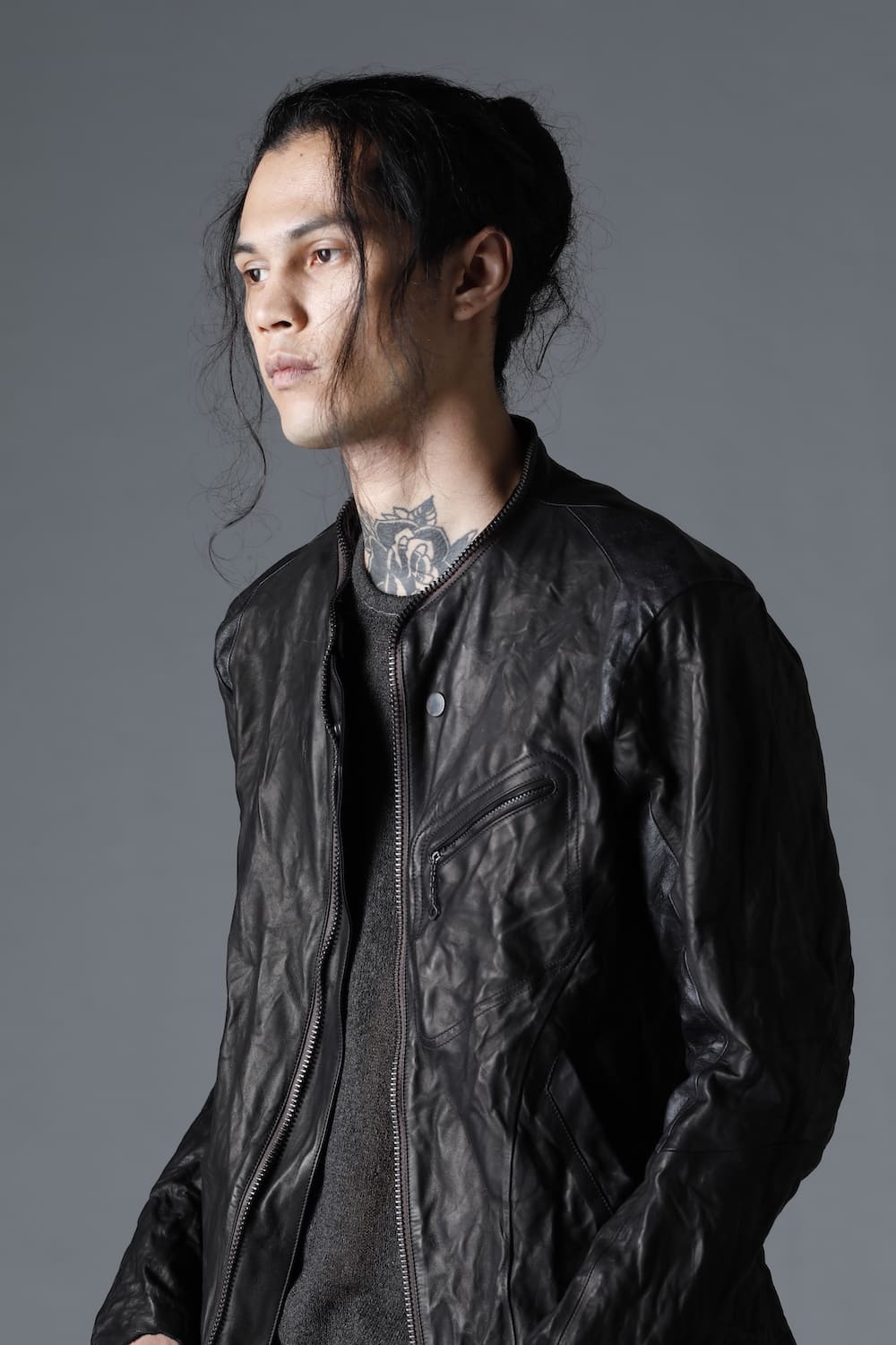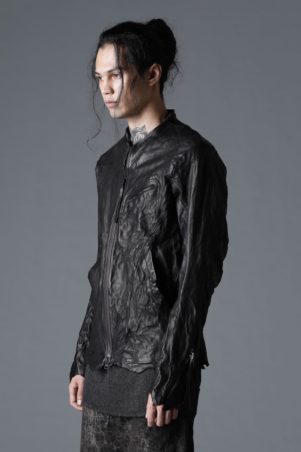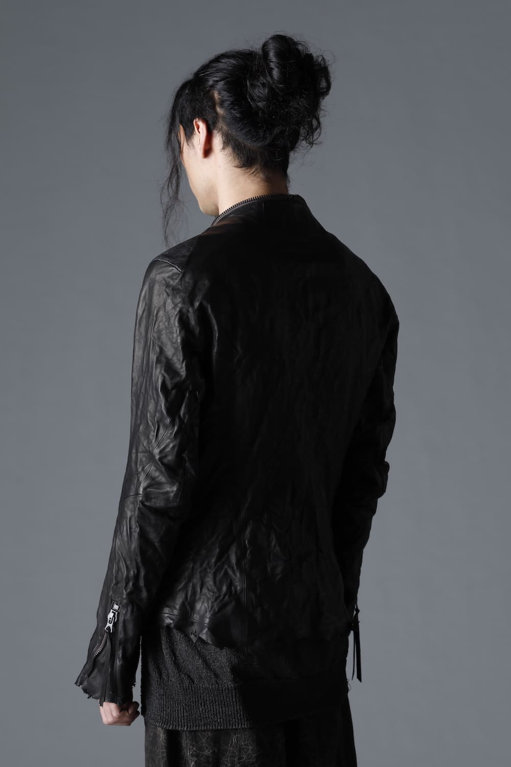 C/#BLACK is made of stretchy deerskin on the shoulders and underarms, and leather edges are used on the cuffs and hem for a rough image.