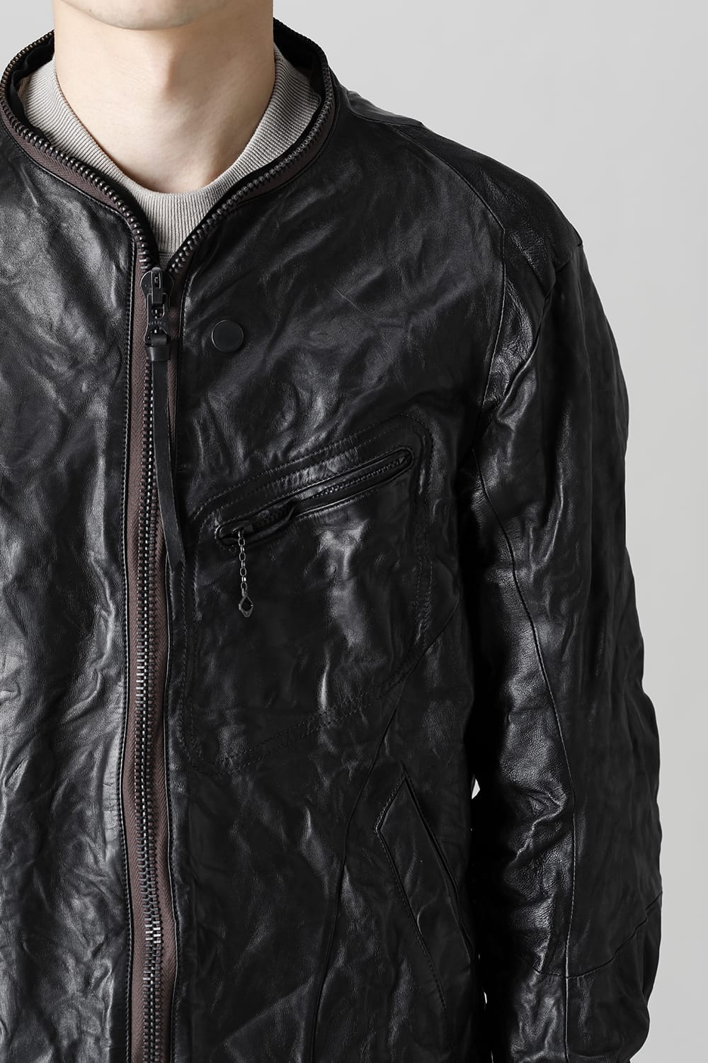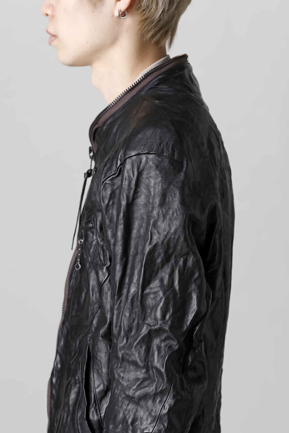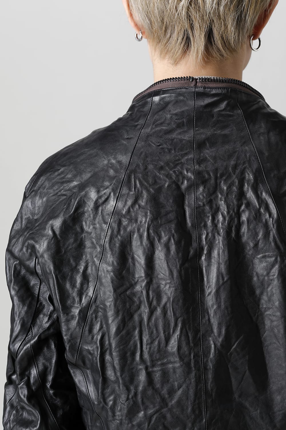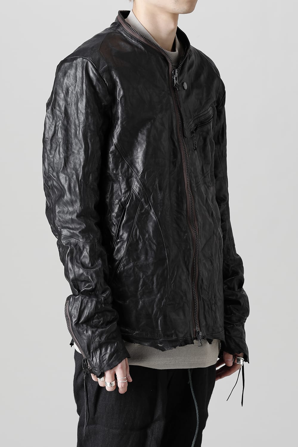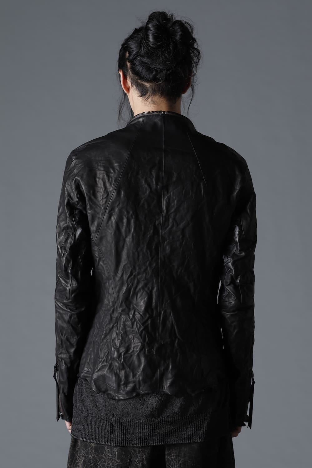 C/#BLACK is made of stretchy deerskin on the shoulders and underarms, and leather edges are used on the cuffs and hem for a rough image.