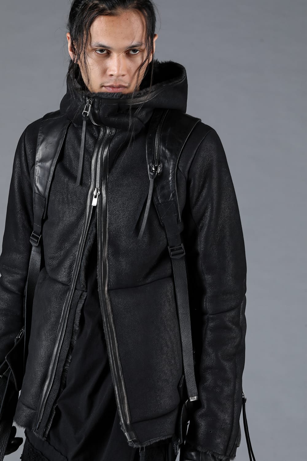 ・This fabric features fine and densely packed French baby lamb mouton, which is coated with a mottled finish on the suede side (outer side). The wool surface is dyed in charcoal color. Baby lamb mutton is exceptionally lightweight and soft.
