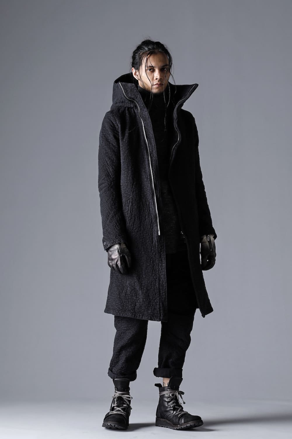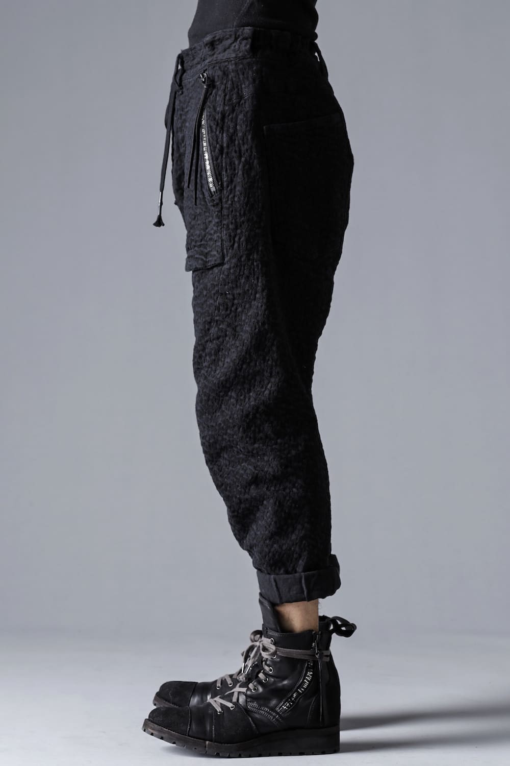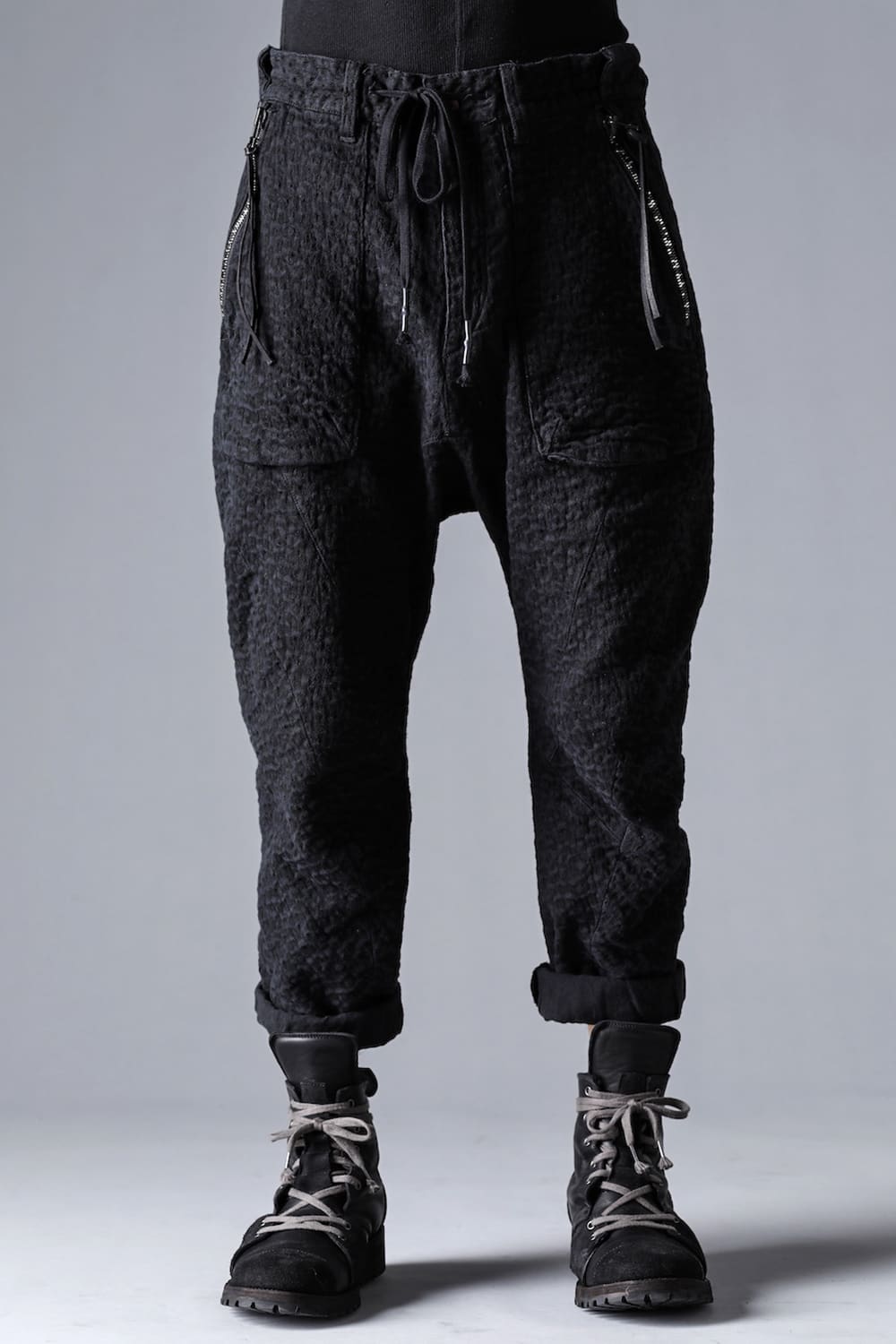 "・This jacquard weave stretch cotton denim fabric is inspired by this season's collection concept ""SCAB"" and represents a wound and skin in the process of healing. It has a rough and rugged look, with bumps and wrinkles and skipped warp threads. It is stretchable. ・ The warps are made of reaction-dyed black and the wefts are made of sulfide-dyed black yarns. By applying a bio-wash to the product, it is not a simple black, but a BLUE BLACK with a depth that is a mixture of faded sulfided black and unfaded black. ・ In addition to the curved silhouette, the drop crotch relaxed tapered silhouette has a high rise. ・ Uses mix color element EXCELLA for fasteners. ・Easy pants with draw cord at the waist. ・Eliminates the back groin and gives more space to the hip line. ・Rolling up the hem is recommended."