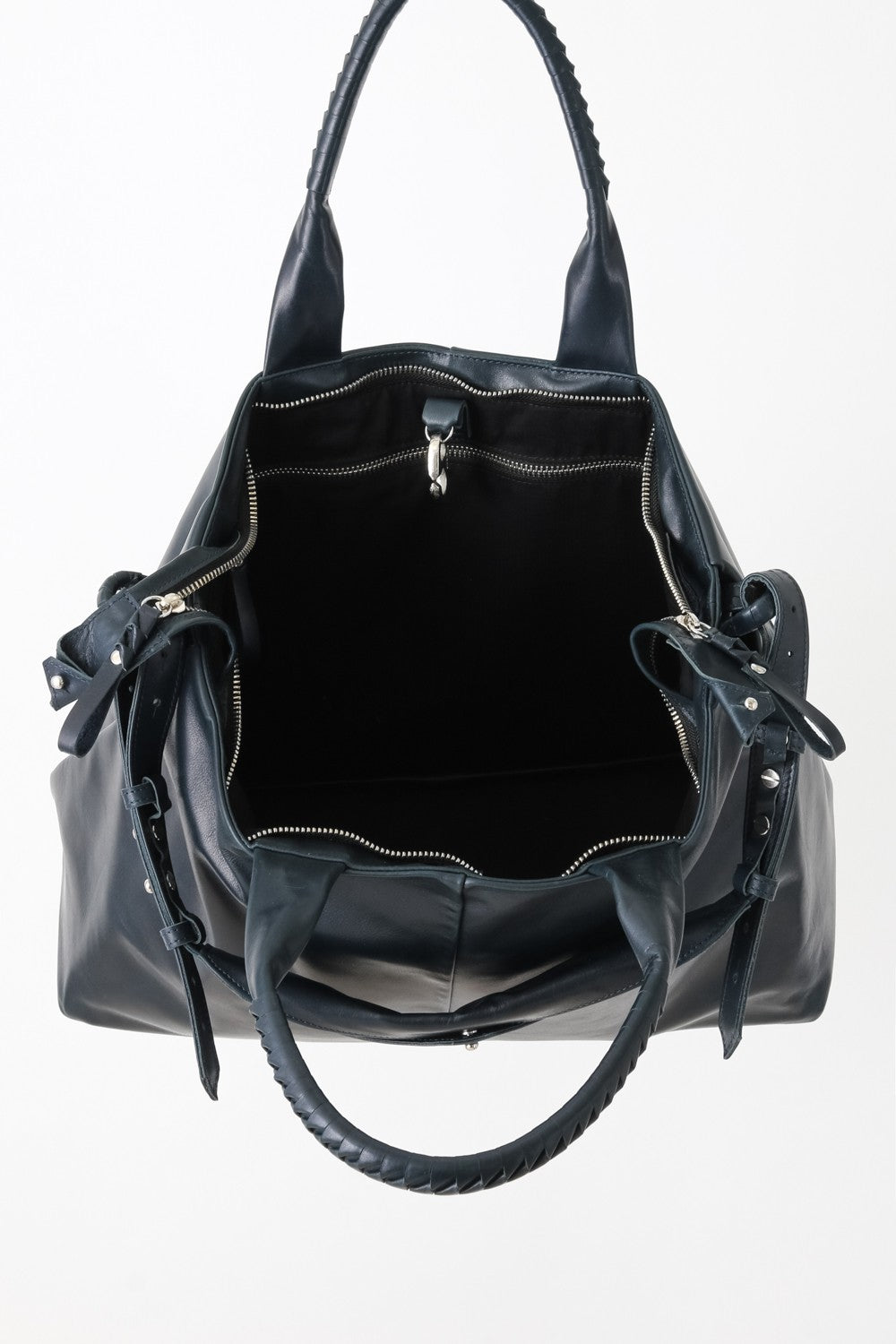 The Veil Handle Bag is constructed from domestically sourced steer oil leather. The bag features the label's signature katana handle which serves as a structure for the handles straps. Scarves and light outwear can be held between. Design of the original hardware used for the bag is inspired from ship Chandlery and certain parts can connect with coin cases and key holders from the label. Also, the bag is constructed in a way that it can change to a compact size. Thought the bag may appear heavy, it light and 0t stressful on the shoulders.