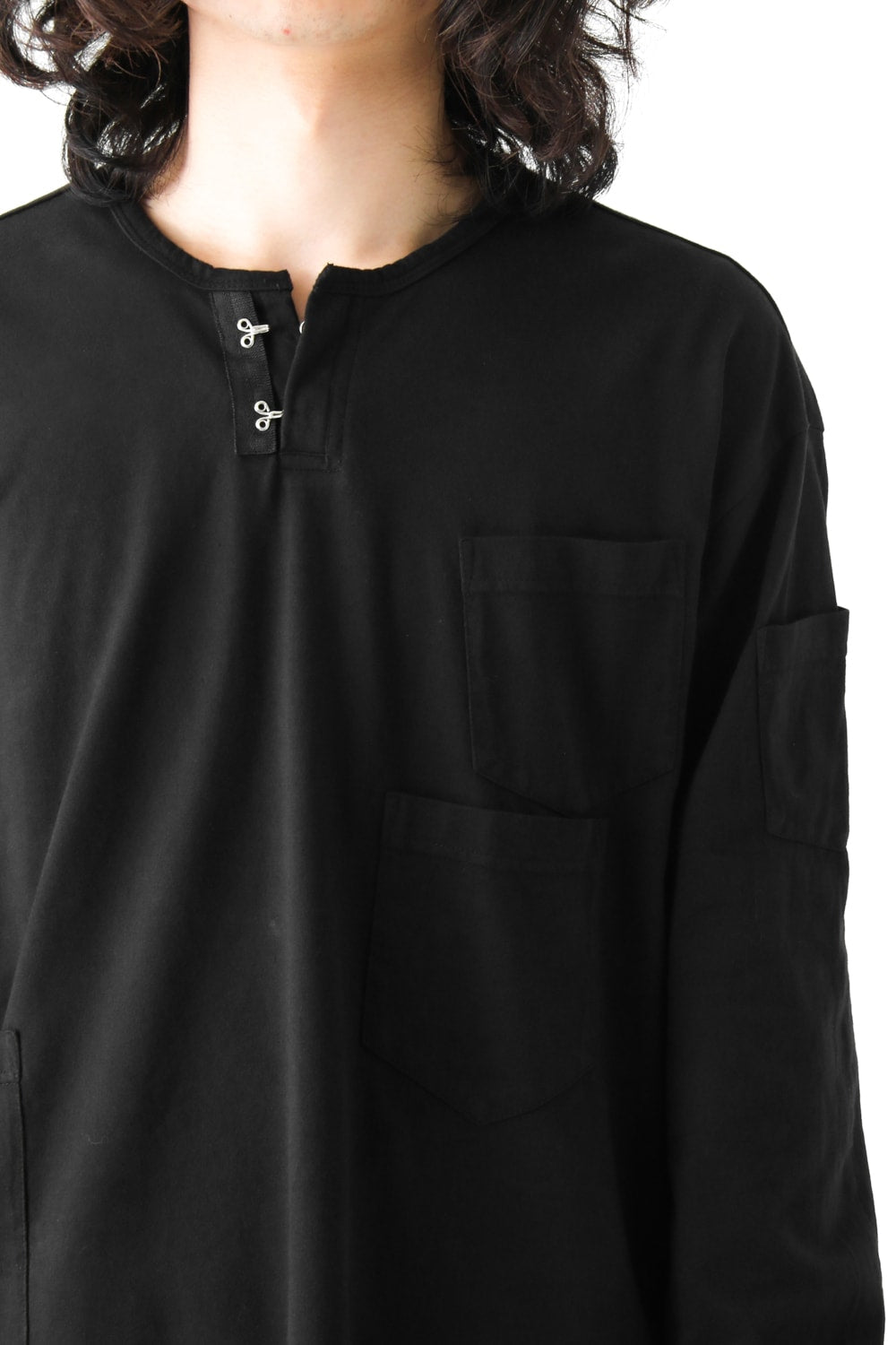 This henry neck cut-sew does not have a button but a hook, and is made with a dense vintage-like plain stitch material. It has a drop shoulder oversize silhouette. It is rather long.