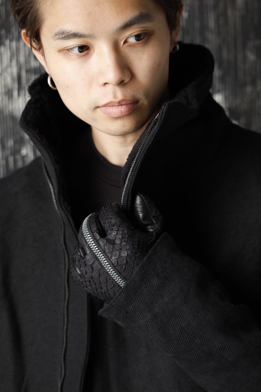 This is a secret item leather glove that was not in the collection. The back of the hand uses a combination of python leather and the palm uses hose leather.