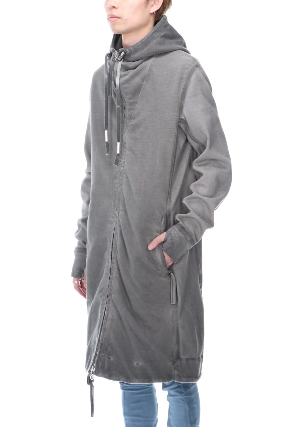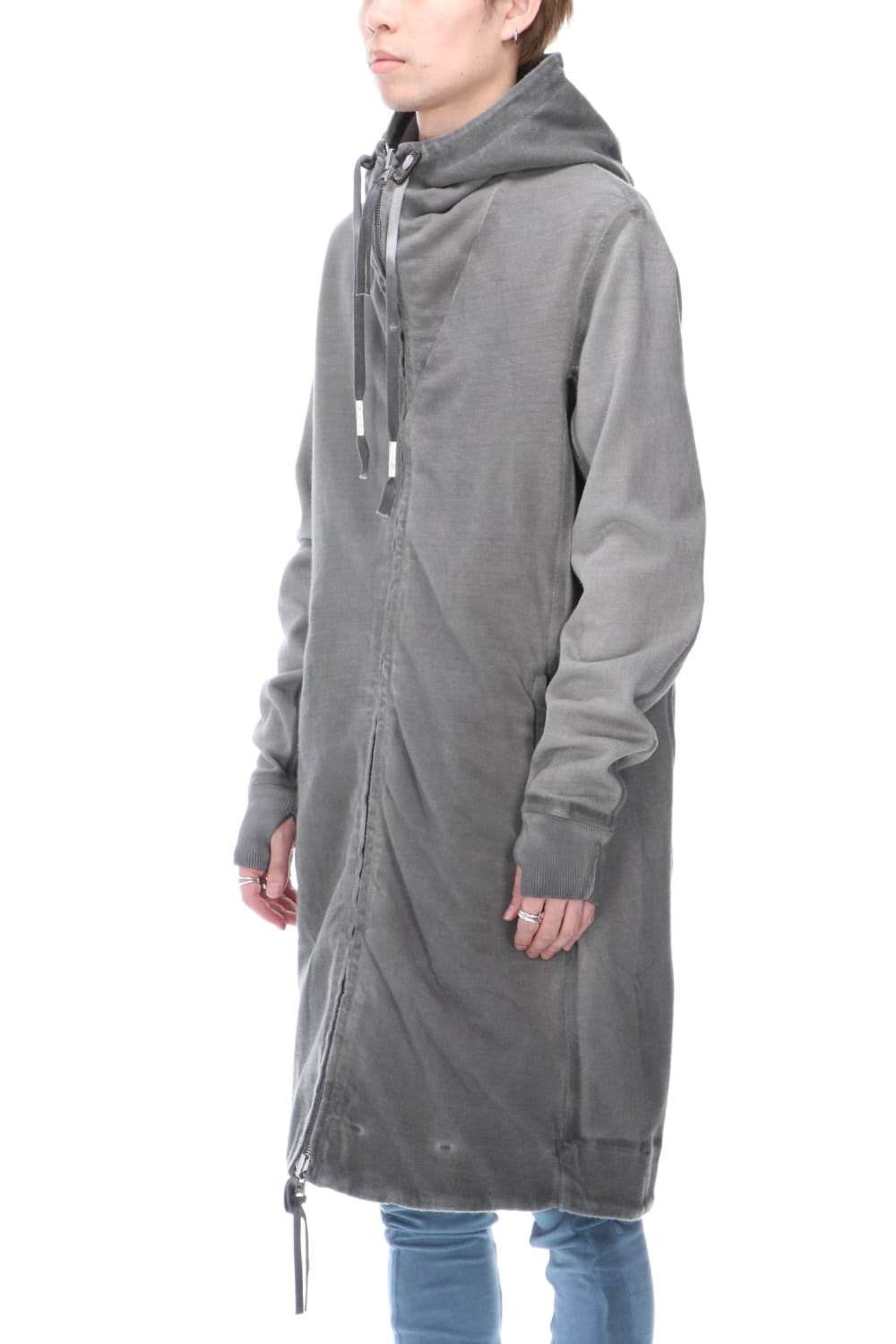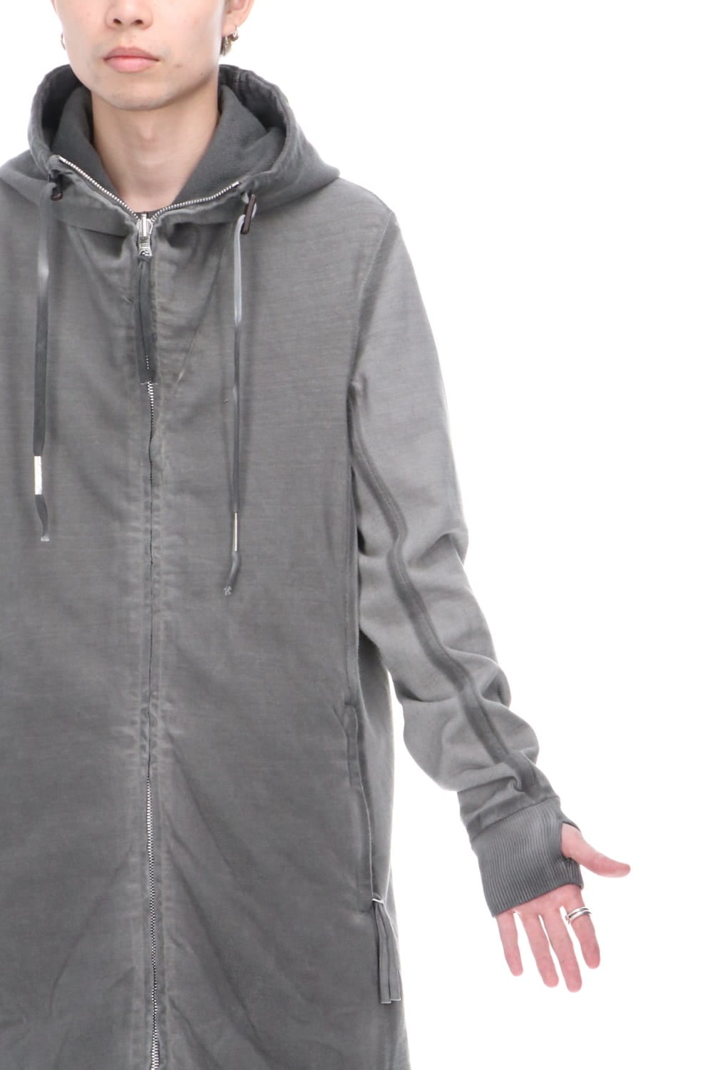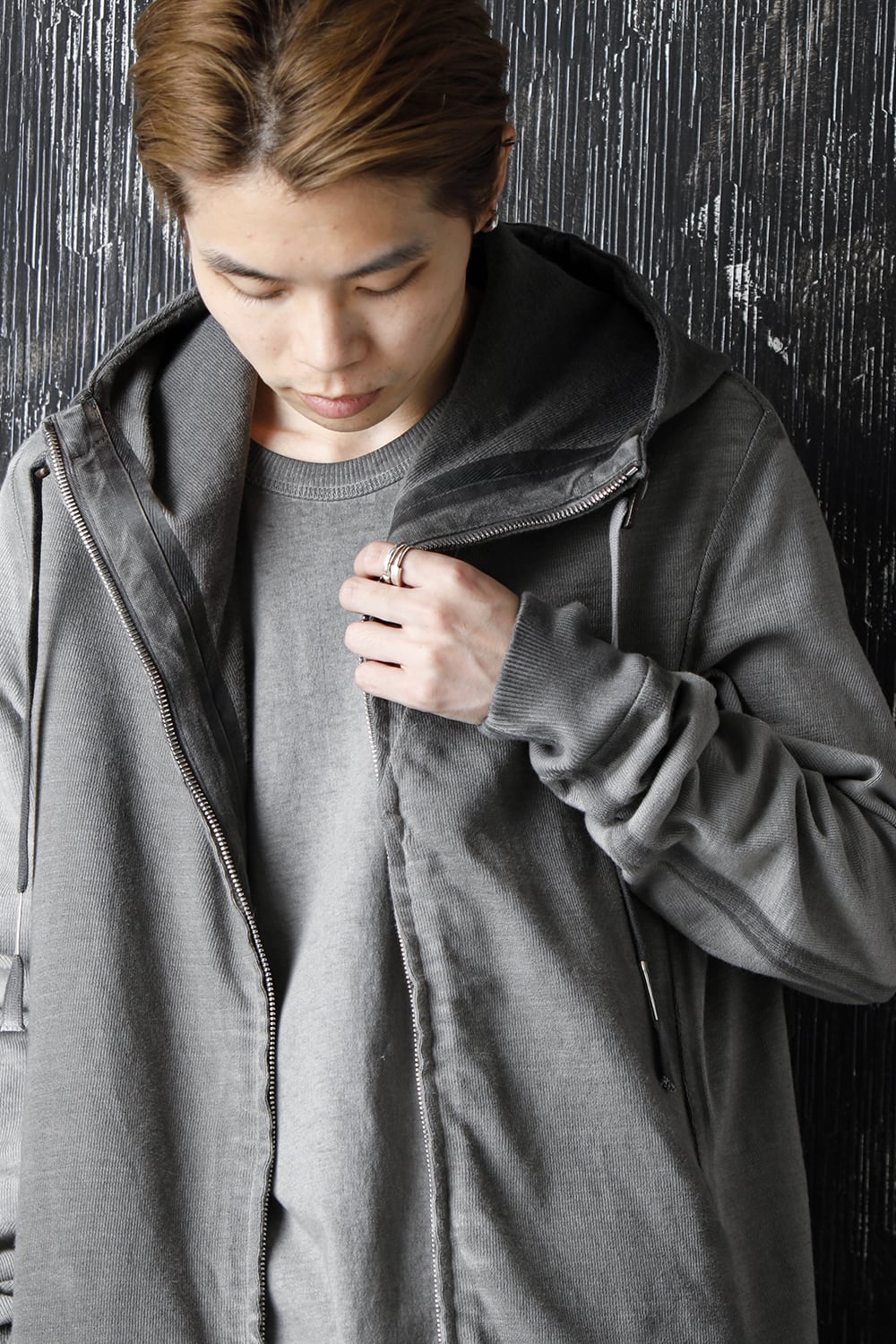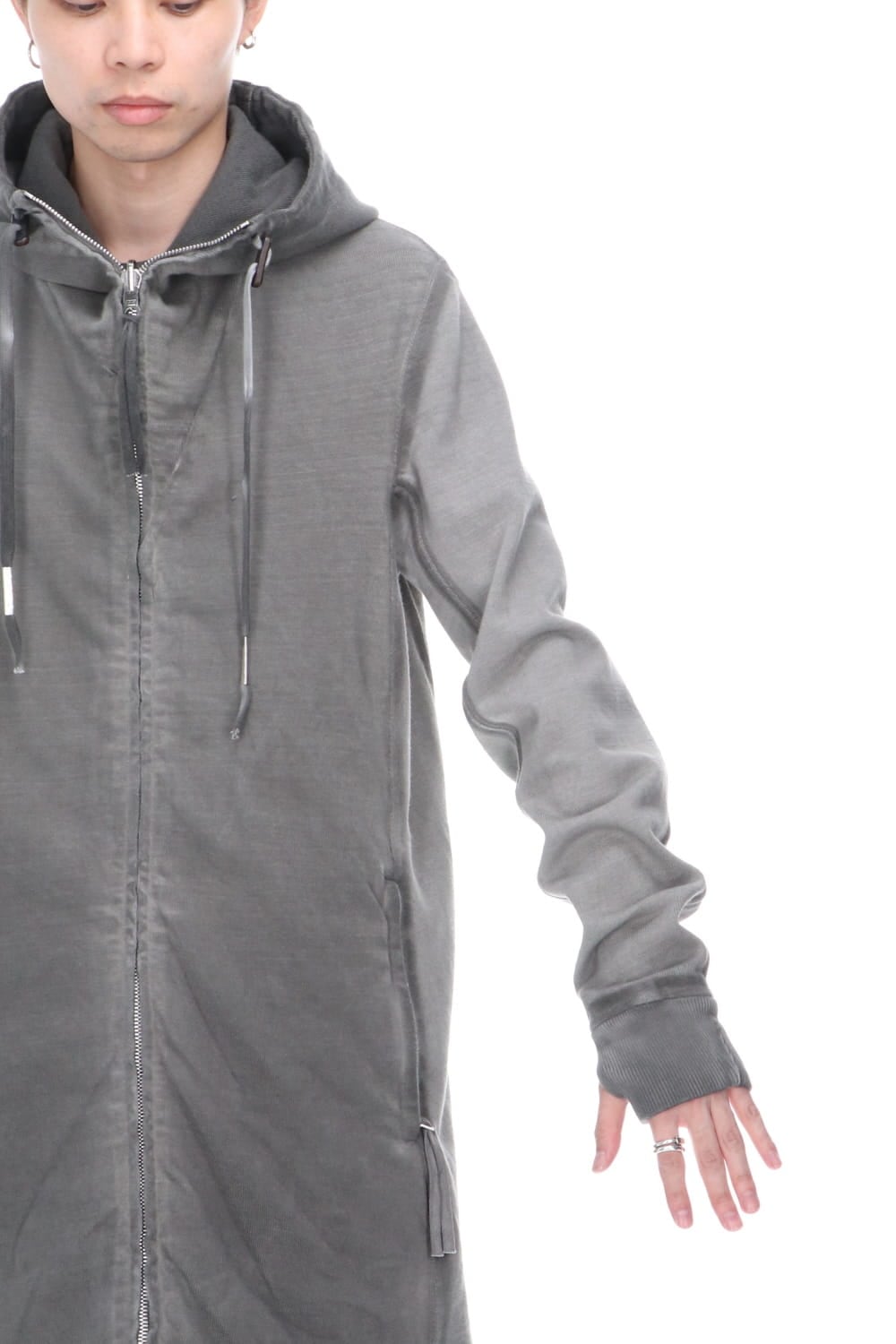 This is a long zip-up hoodie made of cotton jersey fabric that was introduced as ZIPPER series. This item is made of thick and heavy jersey fabric and is reversible. The seam on the back is treated with seam tape and the rough texture of the garment-dyed fabric creates a decadent and dignified look that is characteristic of this brand. Taking advantage of the characteristics of the cold dye, this item has a reversible design with different colour density and uneven feel on the front and back. The zipper is reversible, so you can open and close it from both sides.