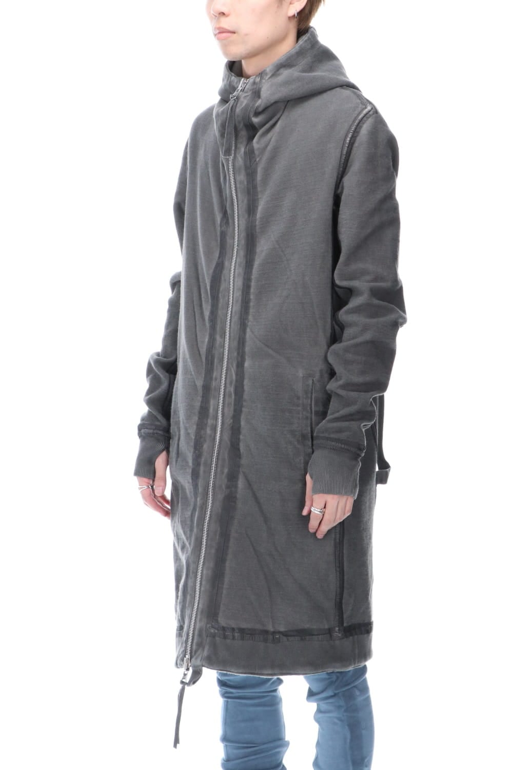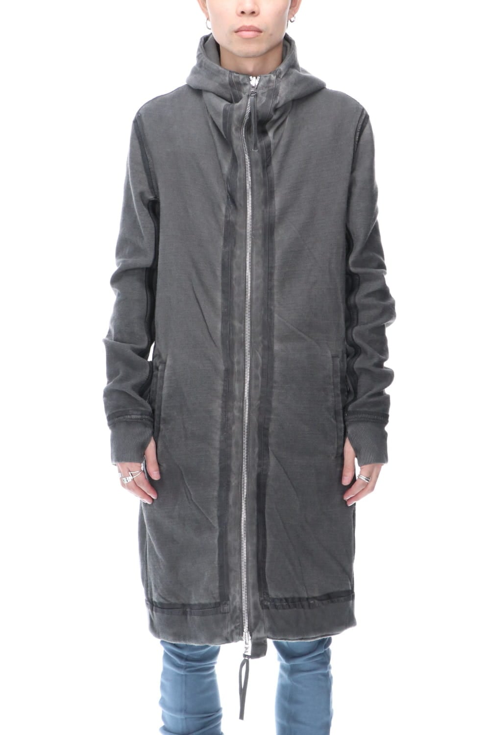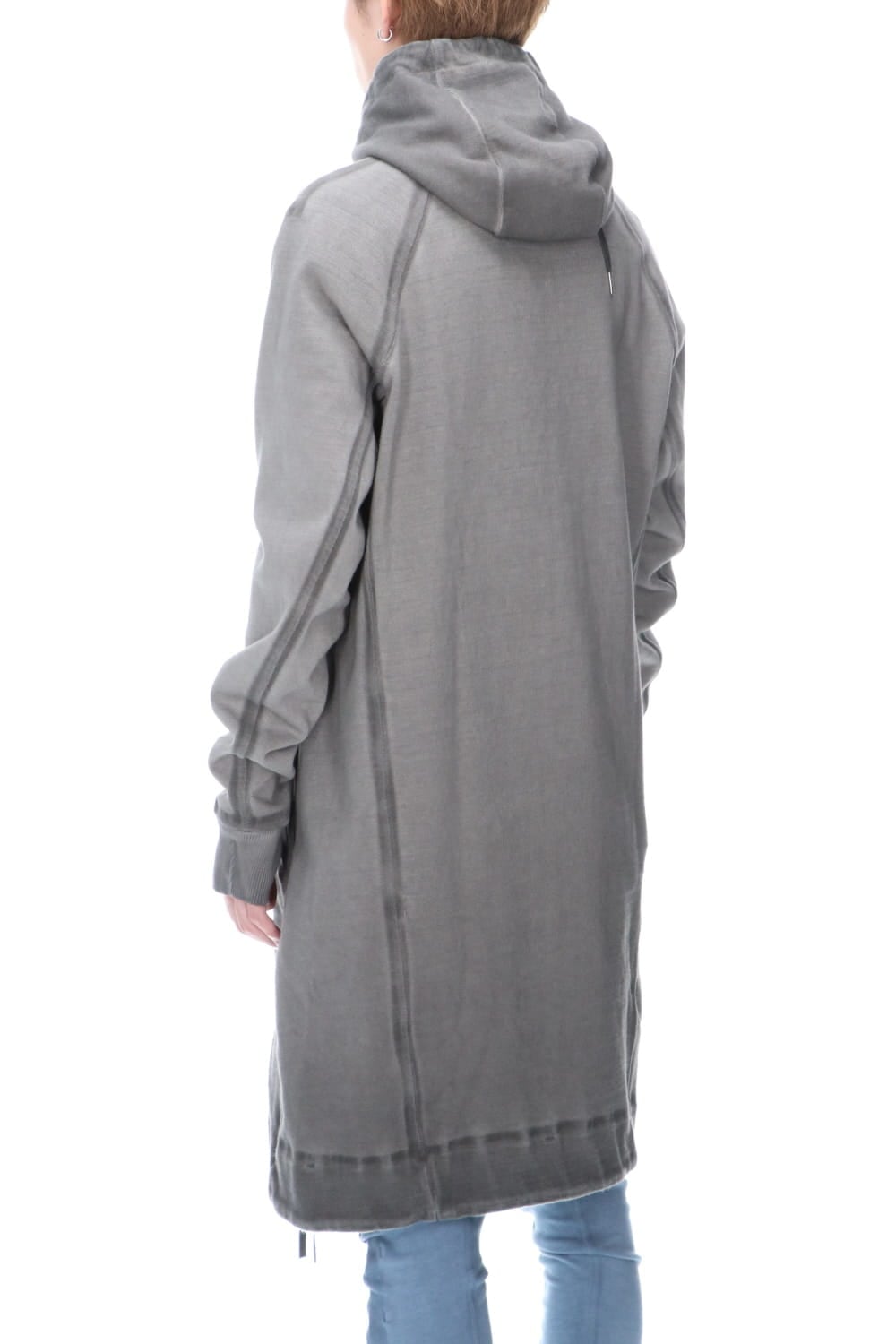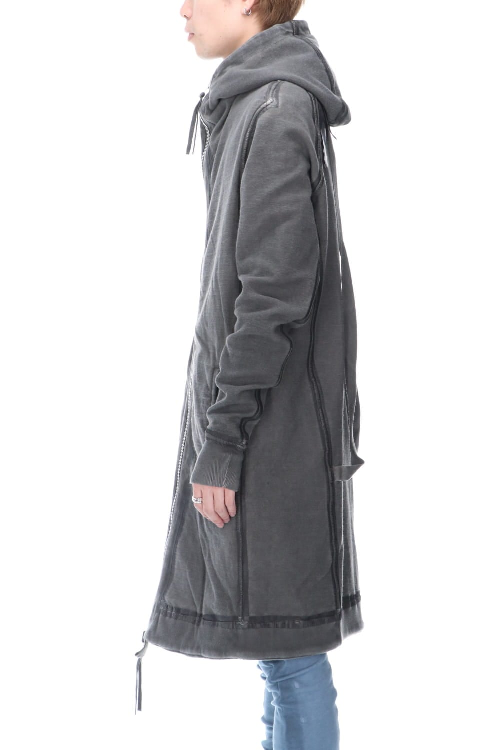 This is a long zip-up hoodie made of cotton jersey fabric that was introduced as ZIPPER series. This item is made of thick and heavy jersey fabric and is reversible. The seam on the back is treated with seam tape and the rough texture of the garment-dyed fabric creates a decadent and dignified look that is characteristic of this brand. Taking advantage of the characteristics of the cold dye, this item has a reversible design with different colour density and uneven feel on the front and back. The zipper is reversible, so you can open and close it from both sides.