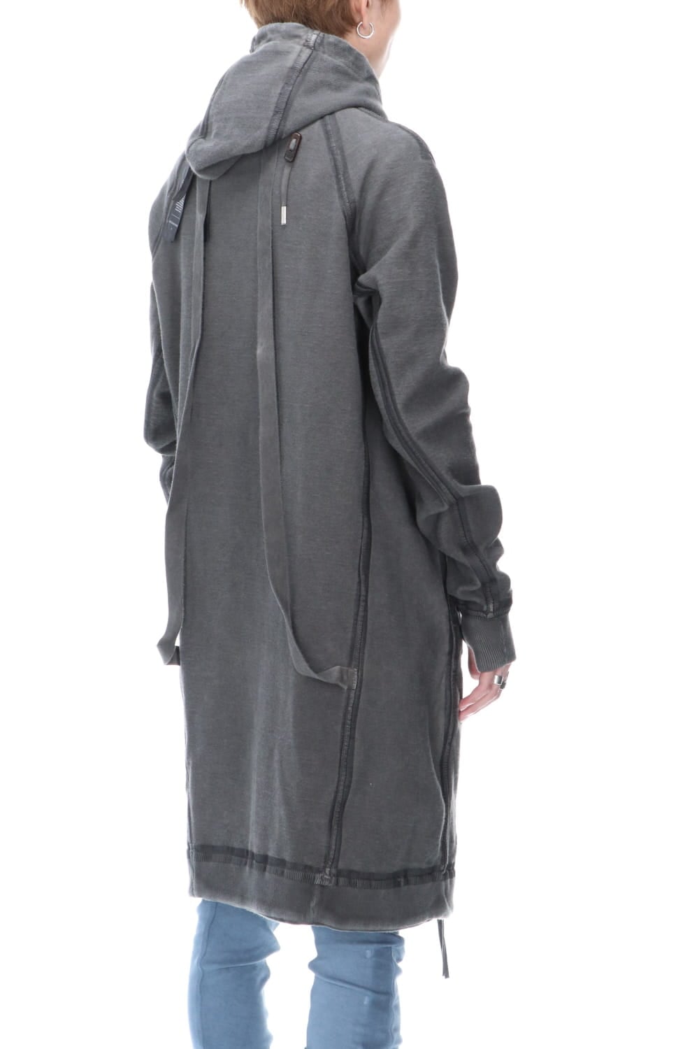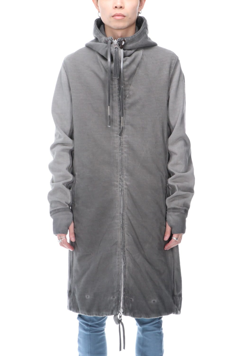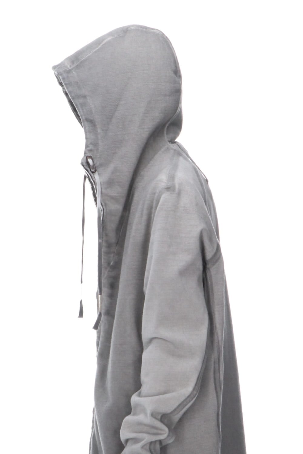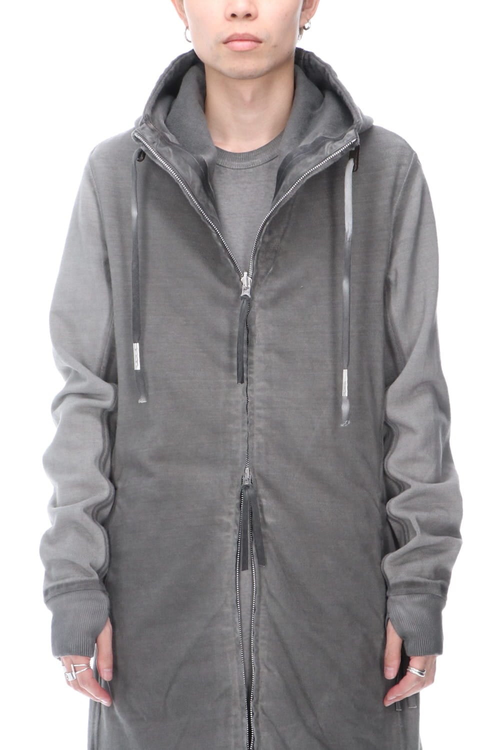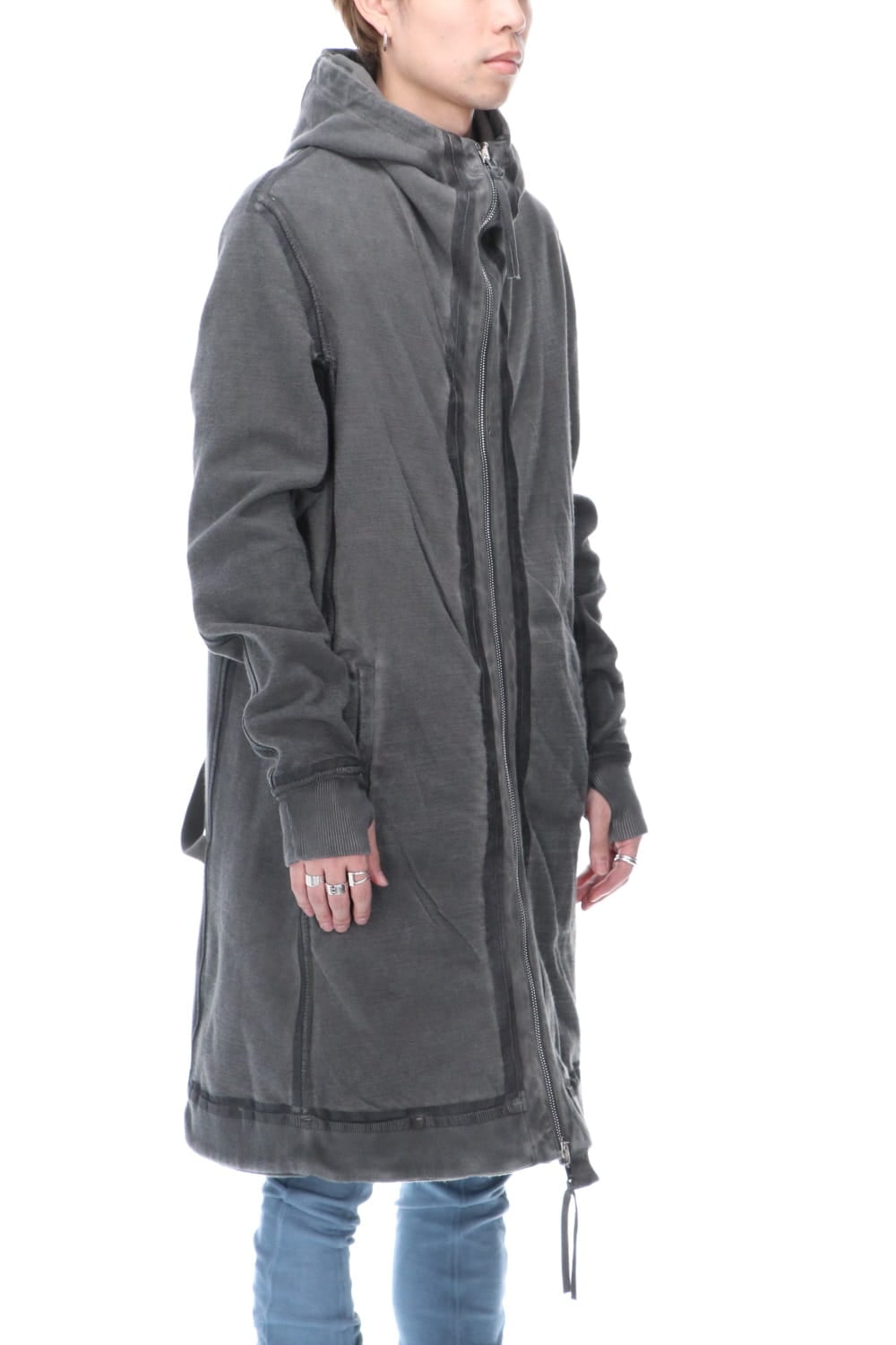 This is a long zip-up hoodie made of cotton jersey fabric that was introduced as ZIPPER series. This item is made of thick and heavy jersey fabric and is reversible. The seam on the back is treated with seam tape and the rough texture of the garment-dyed fabric creates a decadent and dignified look that is characteristic of this brand. Taking advantage of the characteristics of the cold dye, this item has a reversible design with different colour density and uneven feel on the front and back. The zipper is reversible, so you can open and close it from both sides.