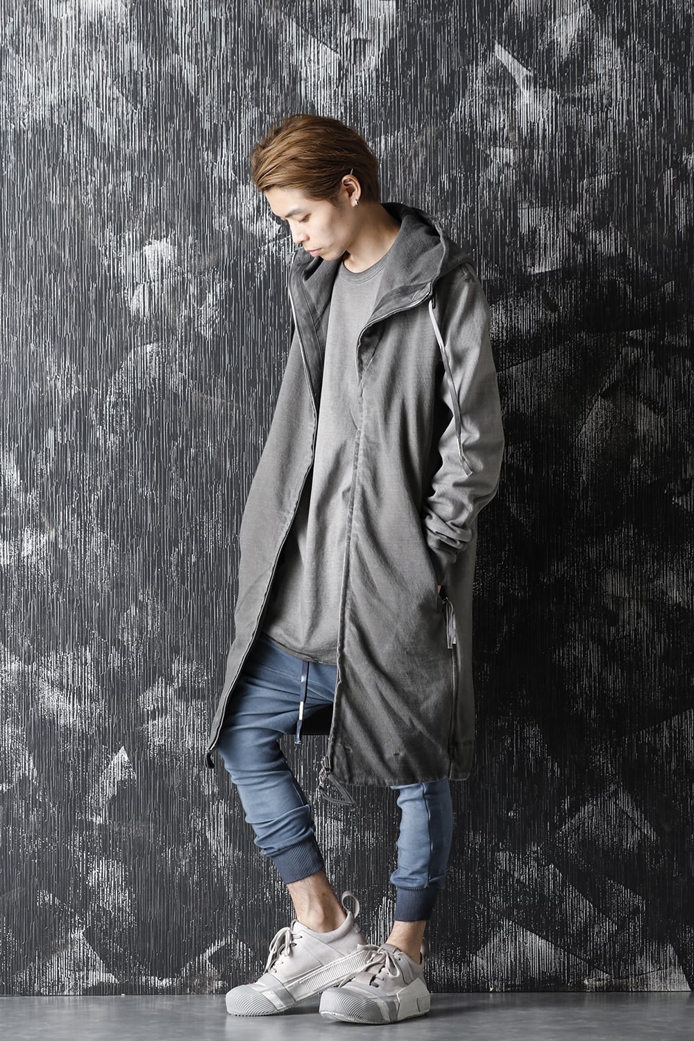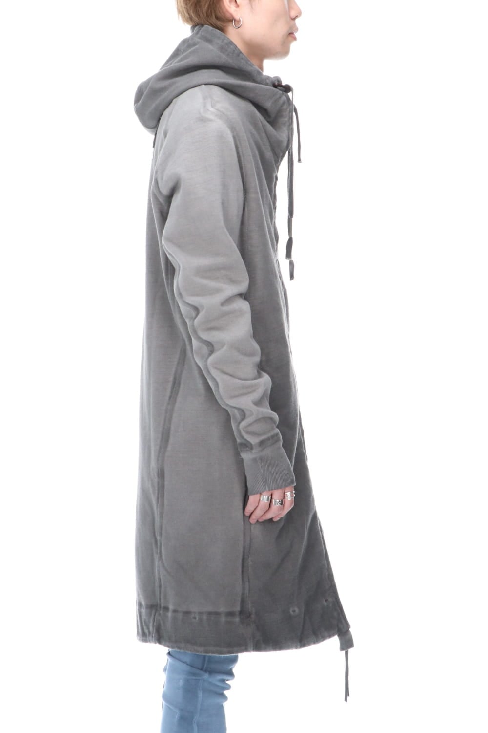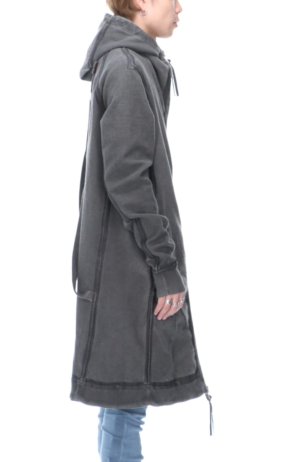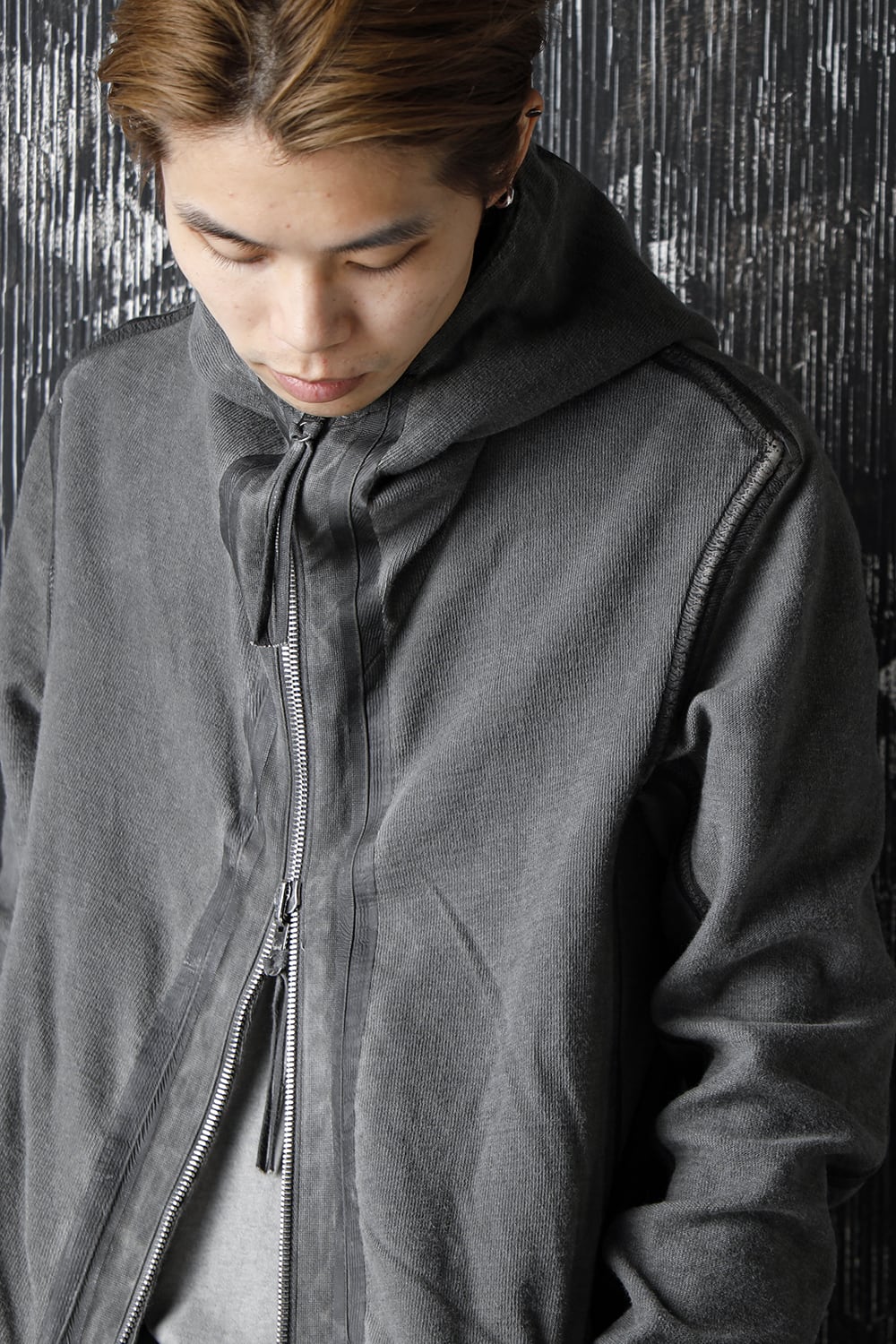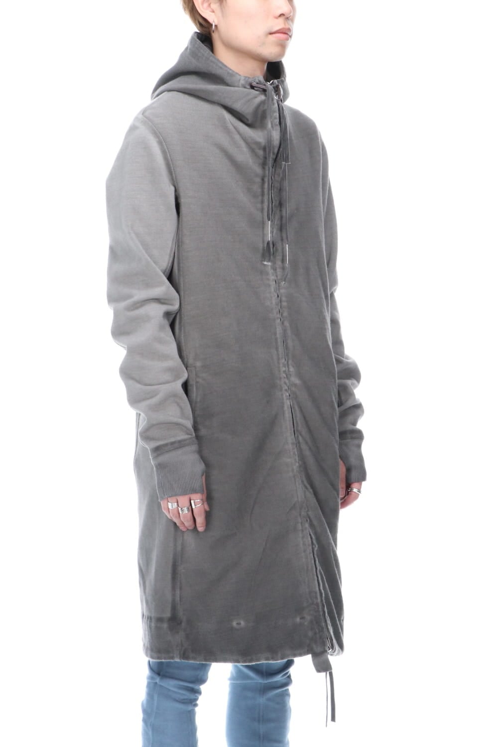 This is a long zip-up hoodie made of cotton jersey fabric that was introduced as ZIPPER series. This item is made of thick and heavy jersey fabric and is reversible. The seam on the back is treated with seam tape and the rough texture of the garment-dyed fabric creates a decadent and dignified look that is characteristic of this brand. Taking advantage of the characteristics of the cold dye, this item has a reversible design with different colour density and uneven feel on the front and back. The zipper is reversible, so you can open and close it from both sides.