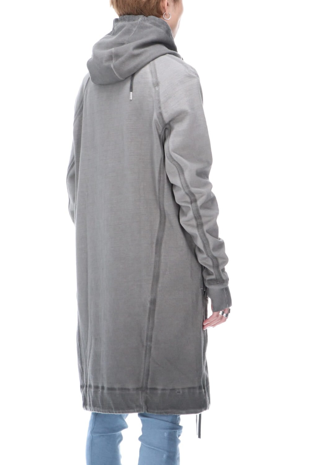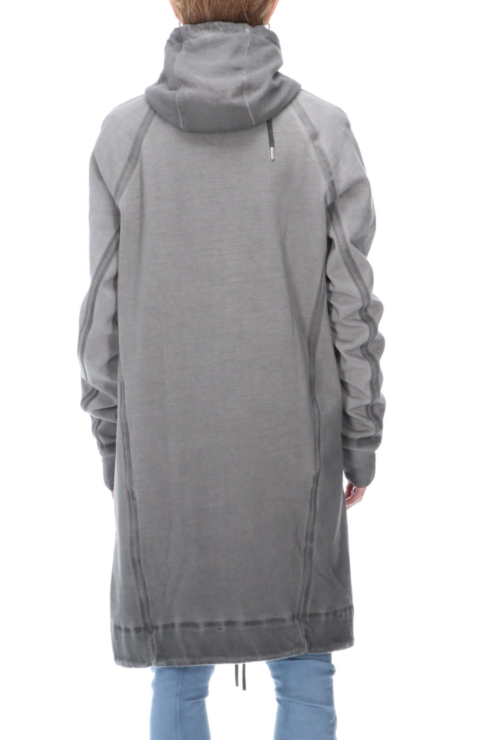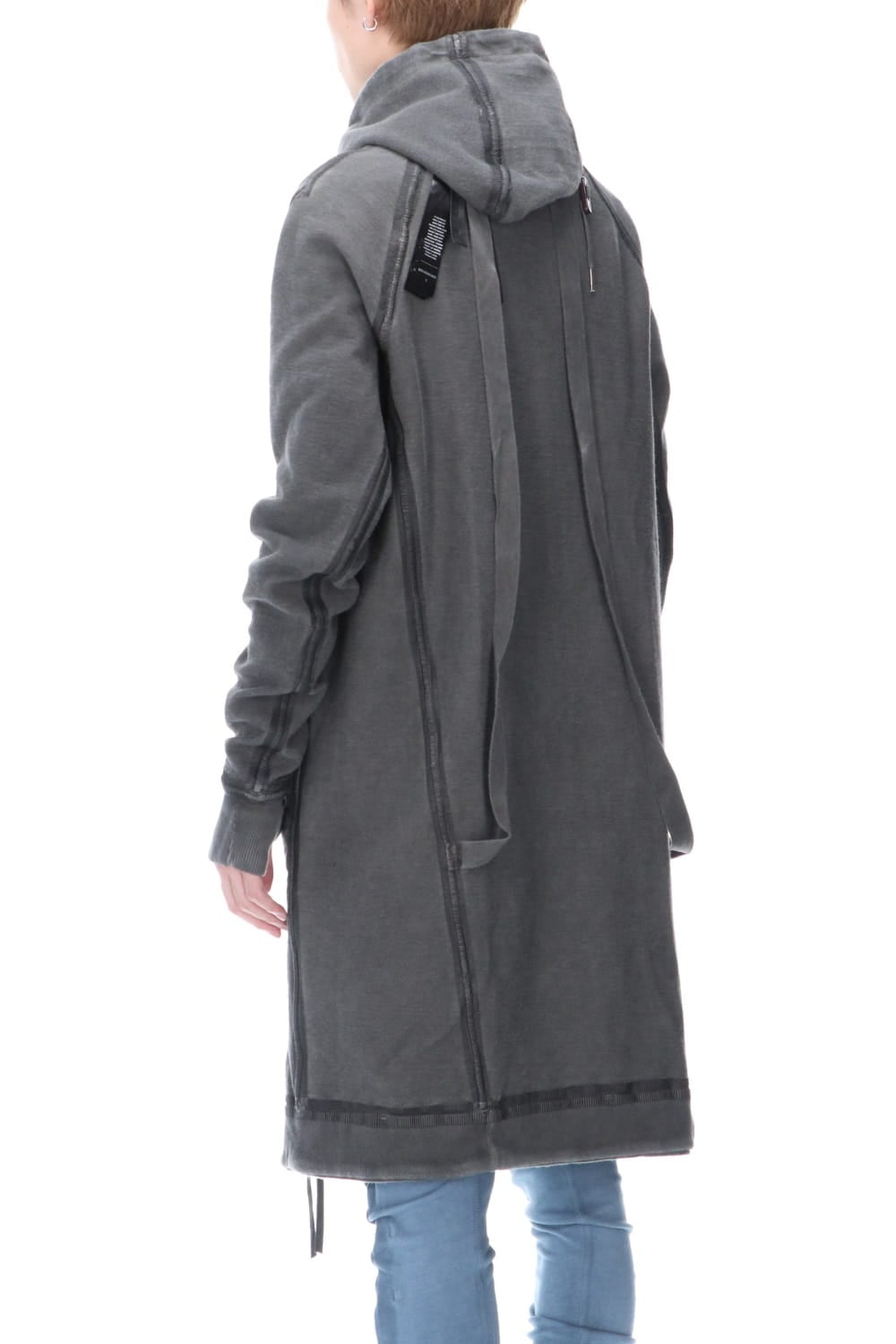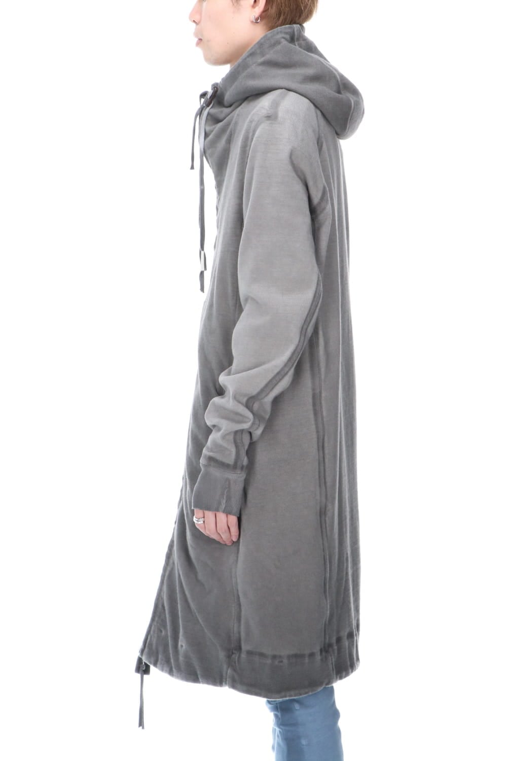 This is a long zip-up hoodie made of cotton jersey fabric that was introduced as ZIPPER series. This item is made of thick and heavy jersey fabric and is reversible. The seam on the back is treated with seam tape and the rough texture of the garment-dyed fabric creates a decadent and dignified look that is characteristic of this brand. Taking advantage of the characteristics of the cold dye, this item has a reversible design with different colour density and uneven feel on the front and back. The zipper is reversible, so you can open and close it from both sides.