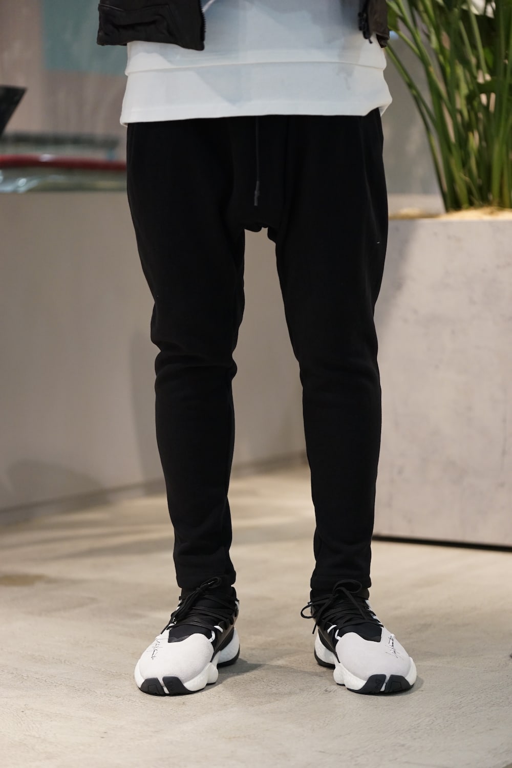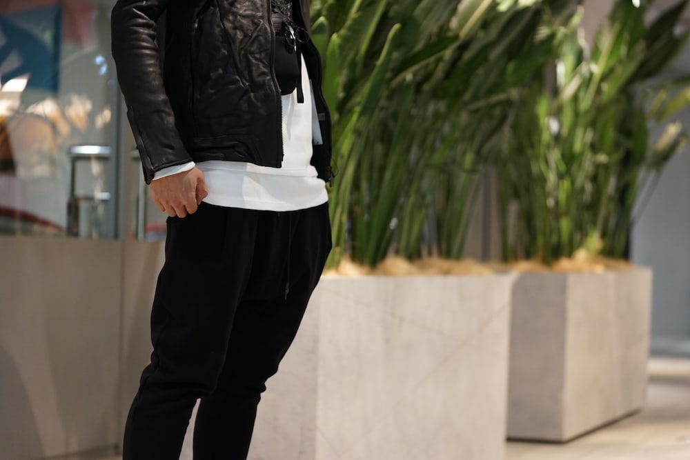 ボンバーヒート素材を使用したライトサルエルジャージーパンツは、スニーカーで軽く合わせるのもお勧めです。