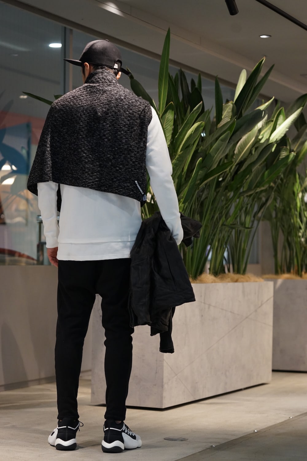 今回のスタイリングのポイントは、ドレープ感の出たスヌードポンチョと、レイヤードL/Sのレイヤード部分の見え方。 裾が重なった見え方をすることでシンプルなレザージャケットにワンポイントを持たせています。