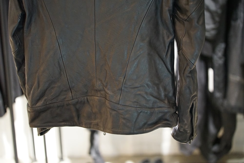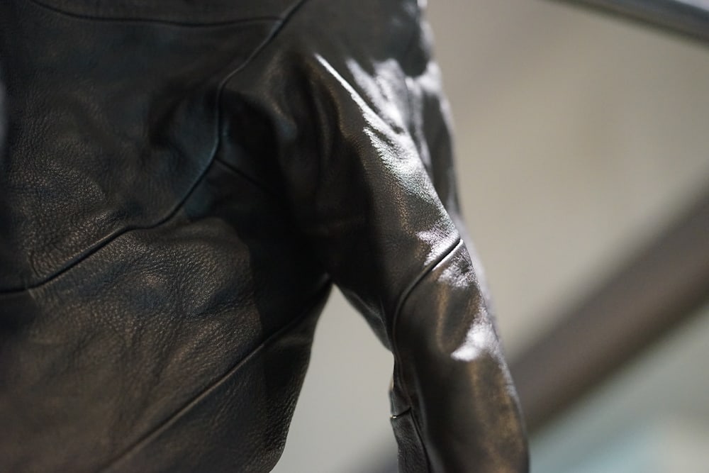 1.2〜1.3mm前後の厚みのある革ですが、オイルを含み非常にしなやかで弾力があるため、ただ厚みのある革とは袖を通した時のフィット感に大きな差を生んでいます。
