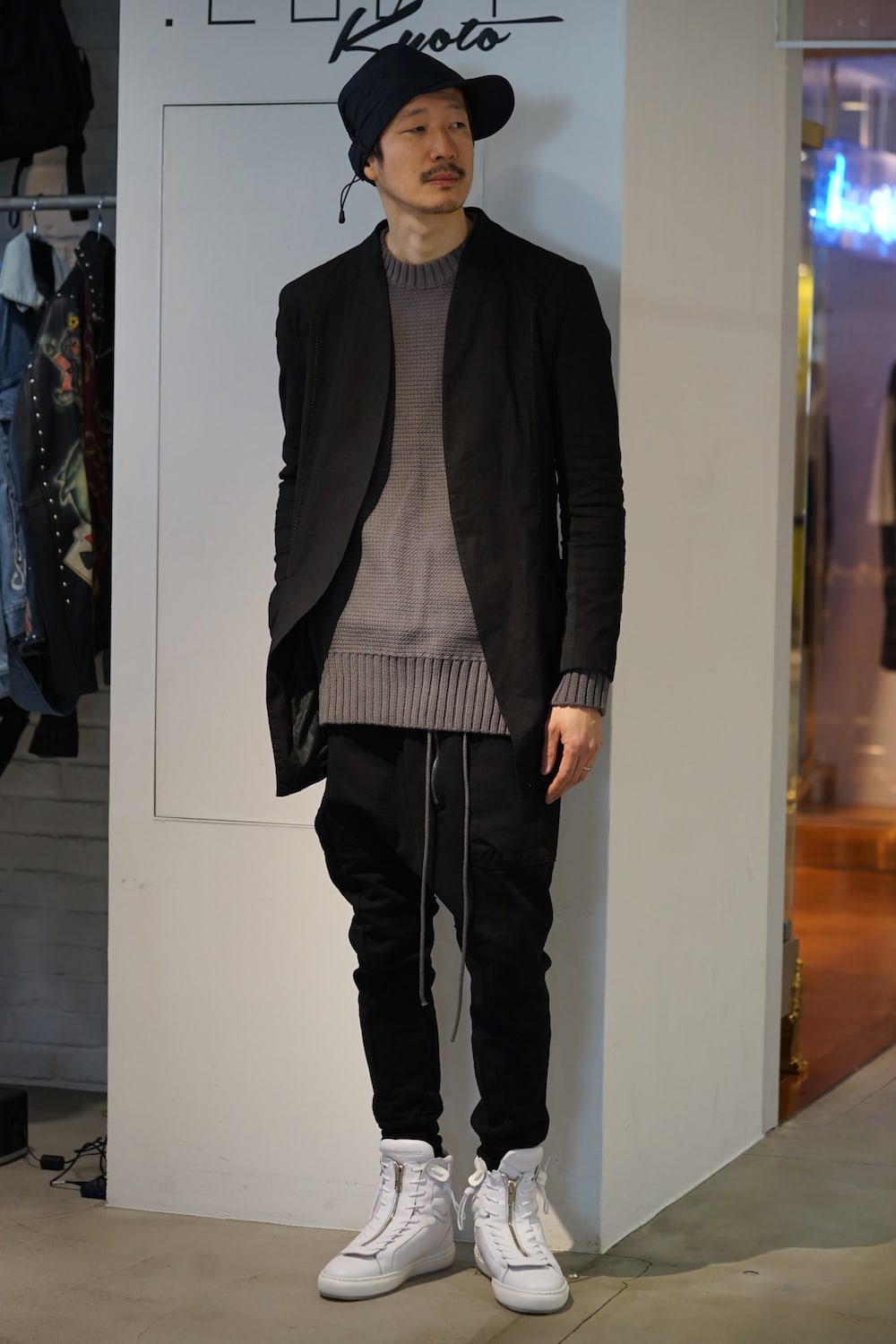 全体をブラックでまとめたスタイリングですが、インナーには先日ご紹介した3GG REVER CARDE同素材の3GG RIVER KNITをセレクトし、軽さをご提案しました。