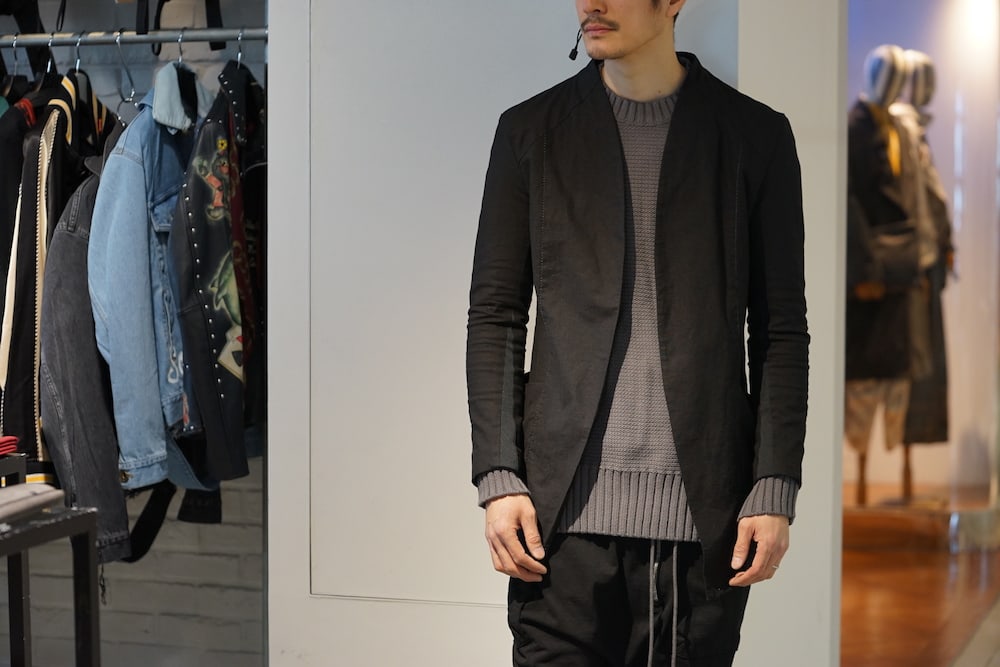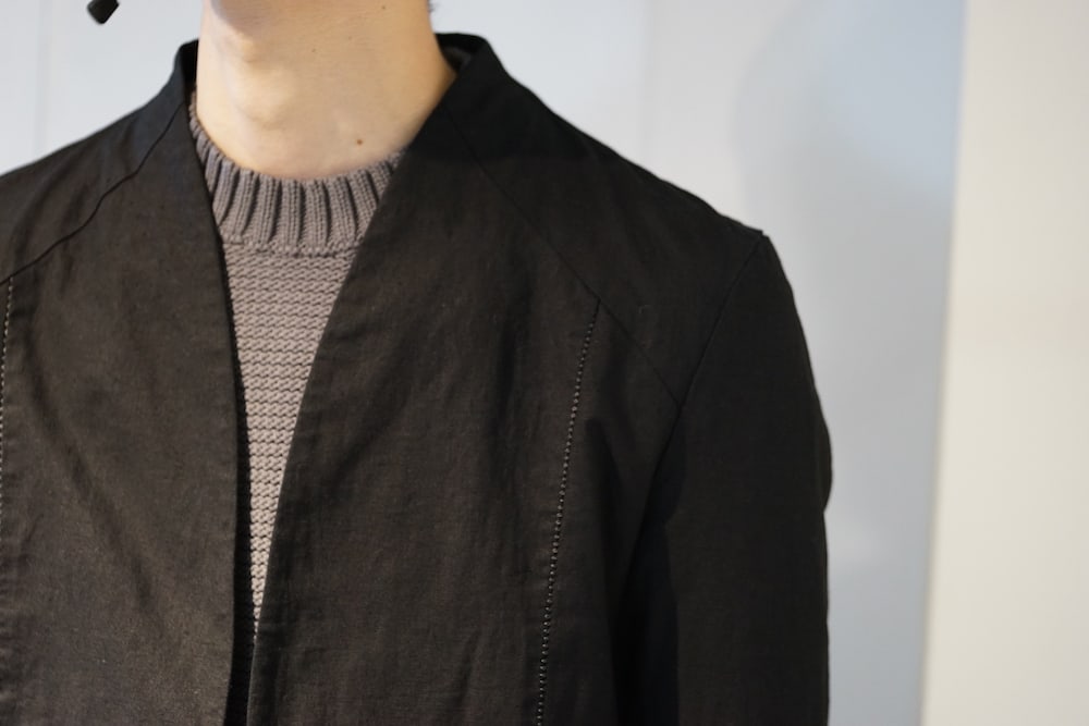 無駄を削いだスッキリとした襟とフロント長め後ろ短めのレングスバランスは過去のドレーピングジャケットや今期で言うRIVER KNIT CARDIGANなどのデザインをアップデートさせています。