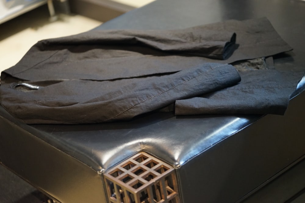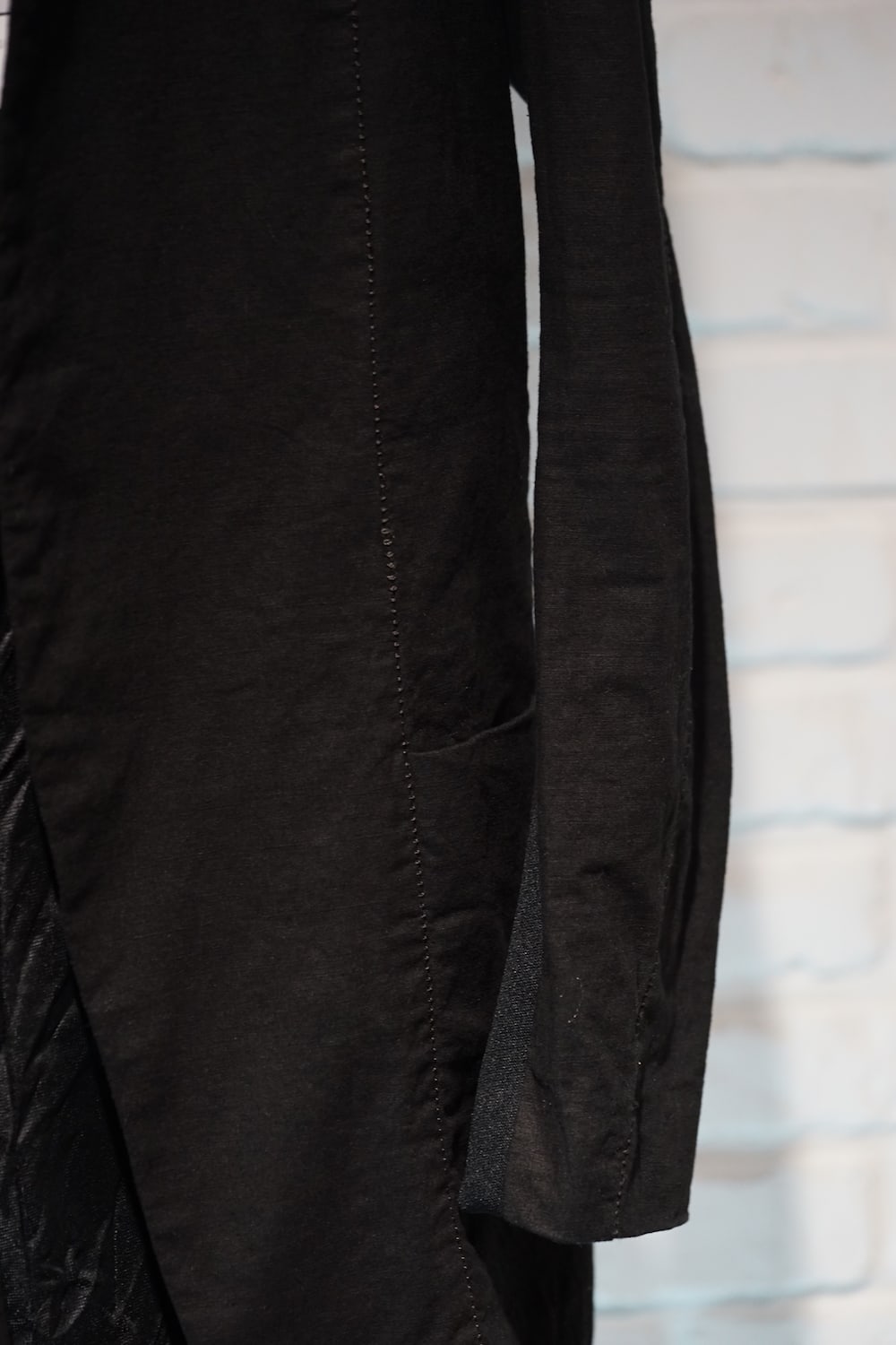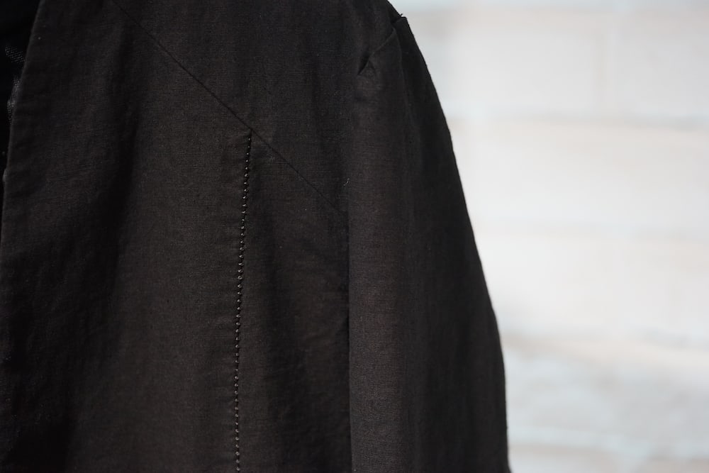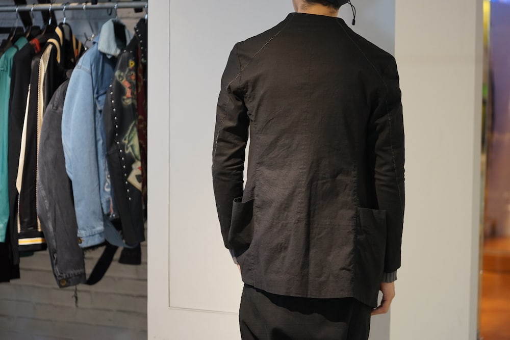 リネン55% / コットン43% / ポリウレタン2%の混紡生地を使用したジャケット風の羽織物でして、ルックに出たころから気になるお客様もおられたかと思いますが、着てみてやはり良い雰囲気。