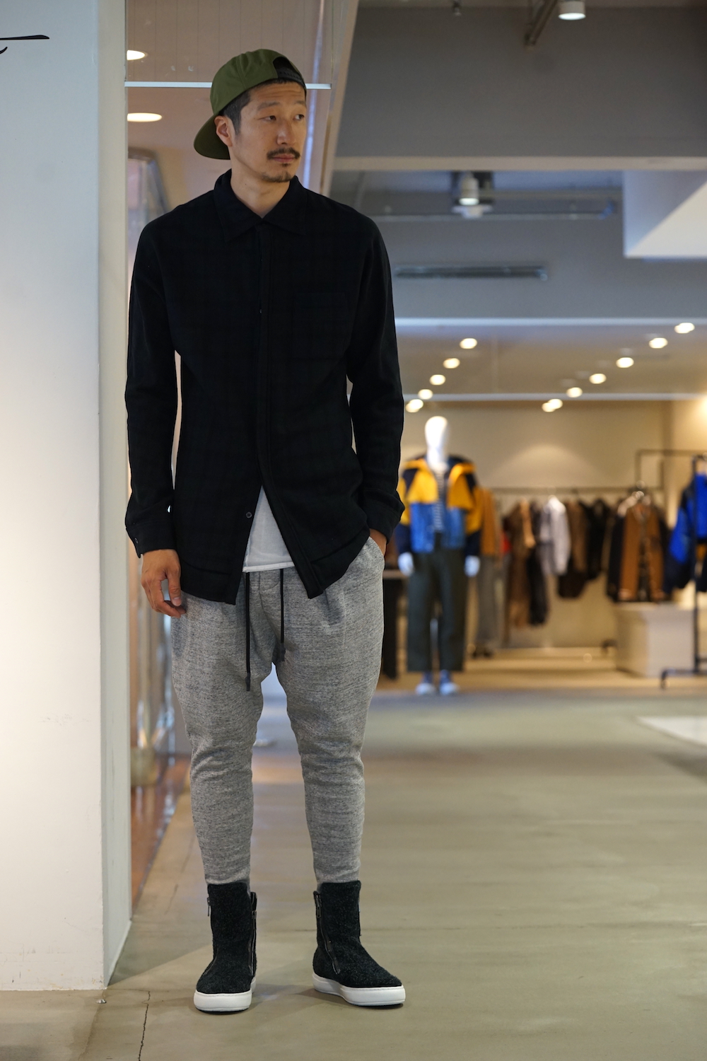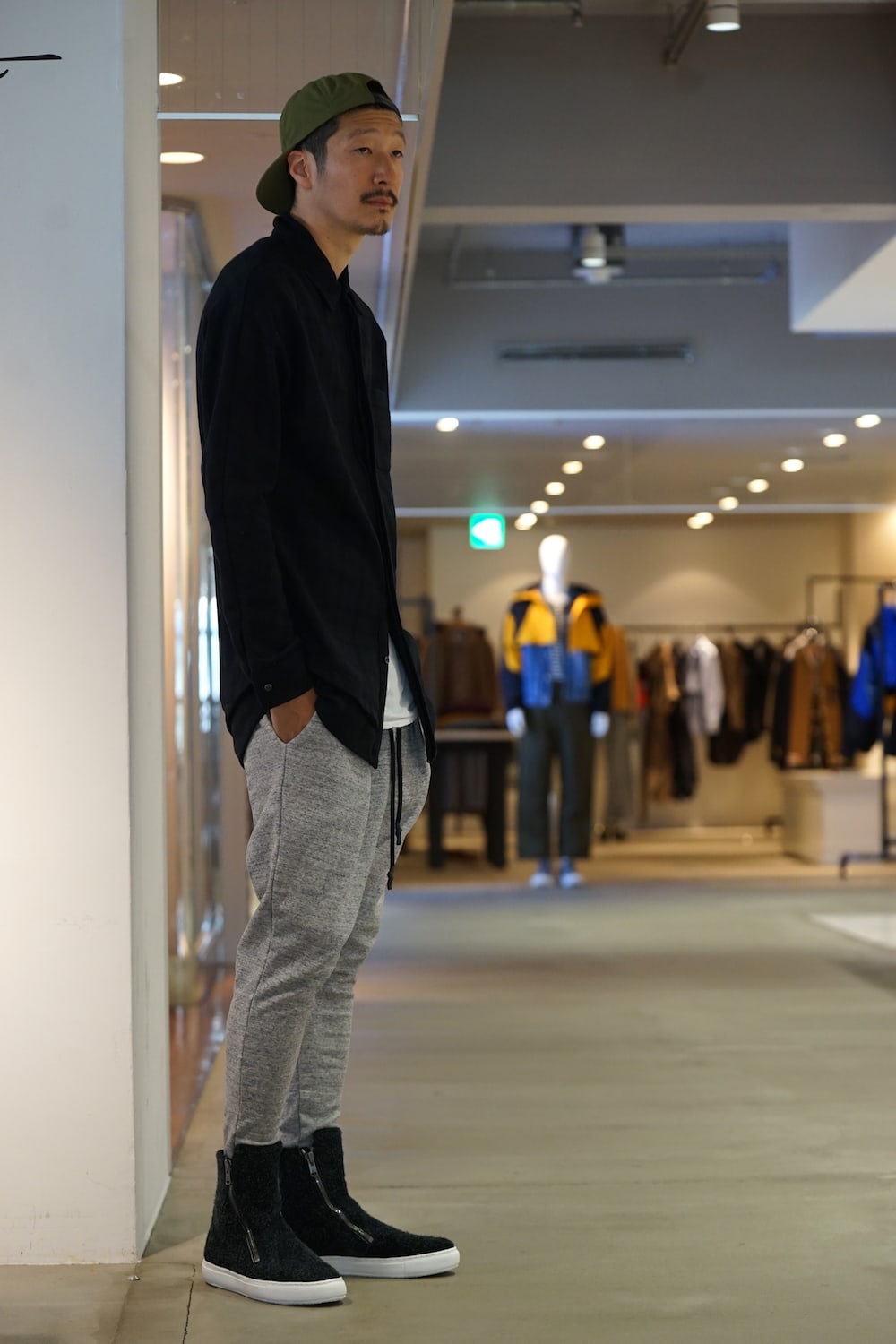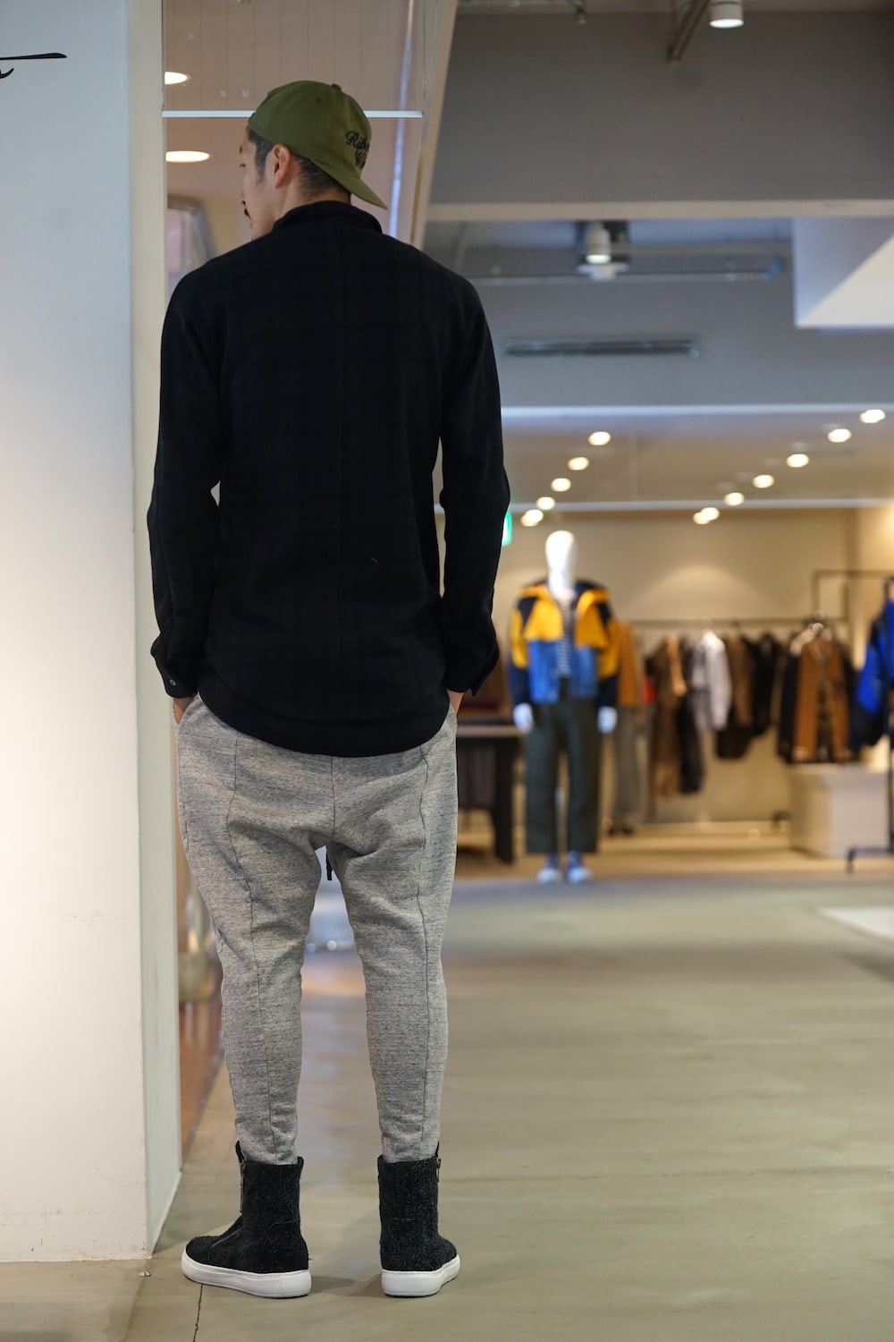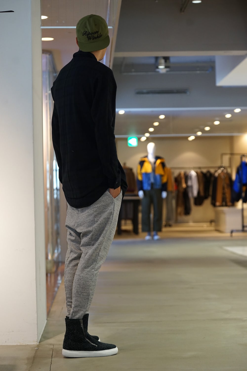 チャコールグレーをベースに、落ち着いた印象を見せるSHADOW GRAY。裾レイヤード仕様によりジョッパーズ型のパンツと相性が良いので、本日選んだパンツはCROPPED JERSEY PANTS。
