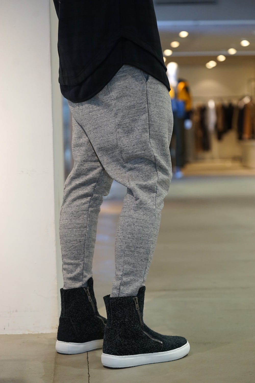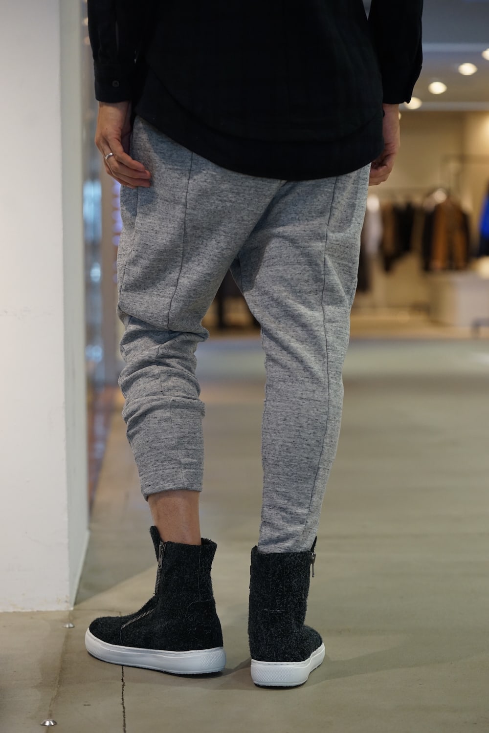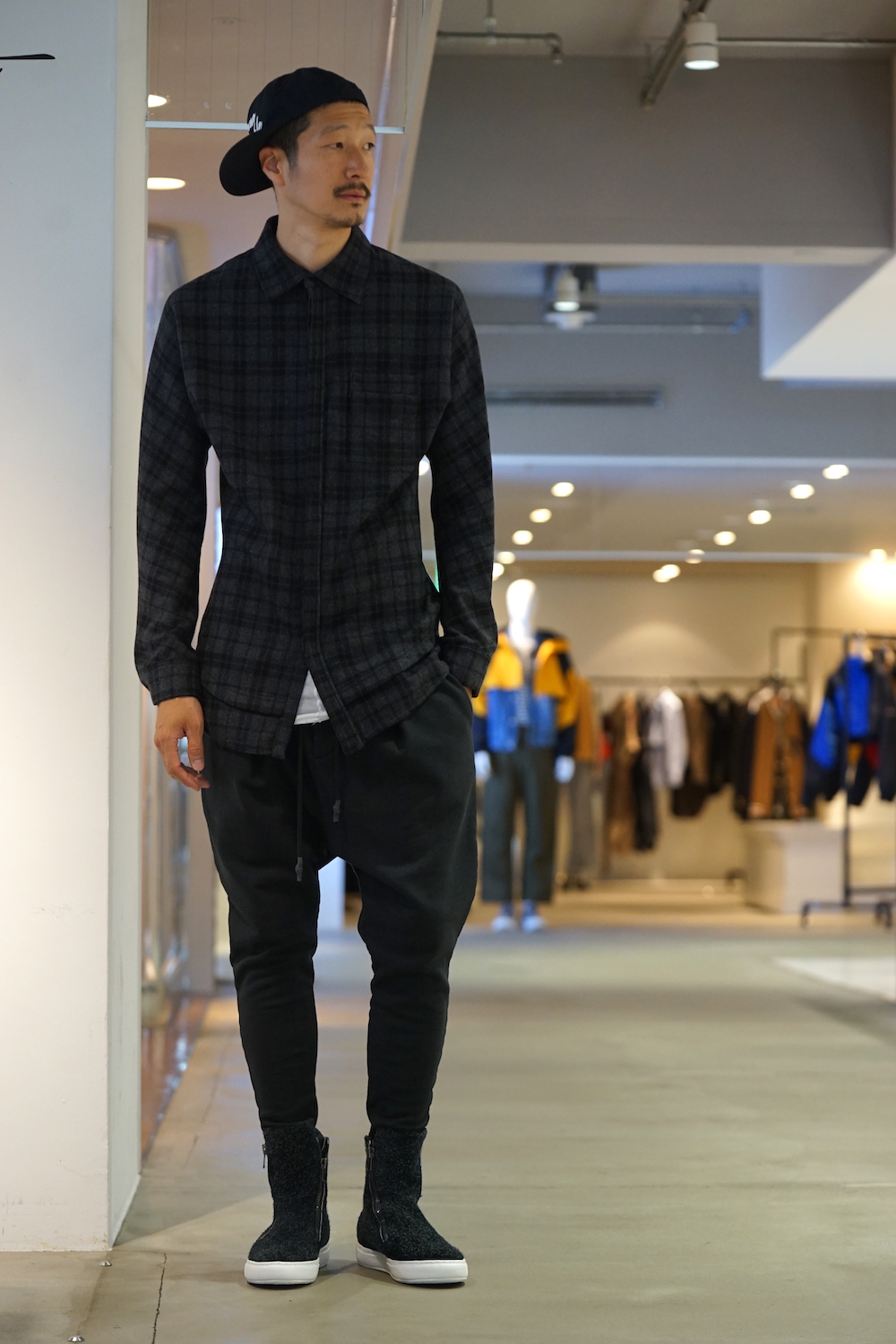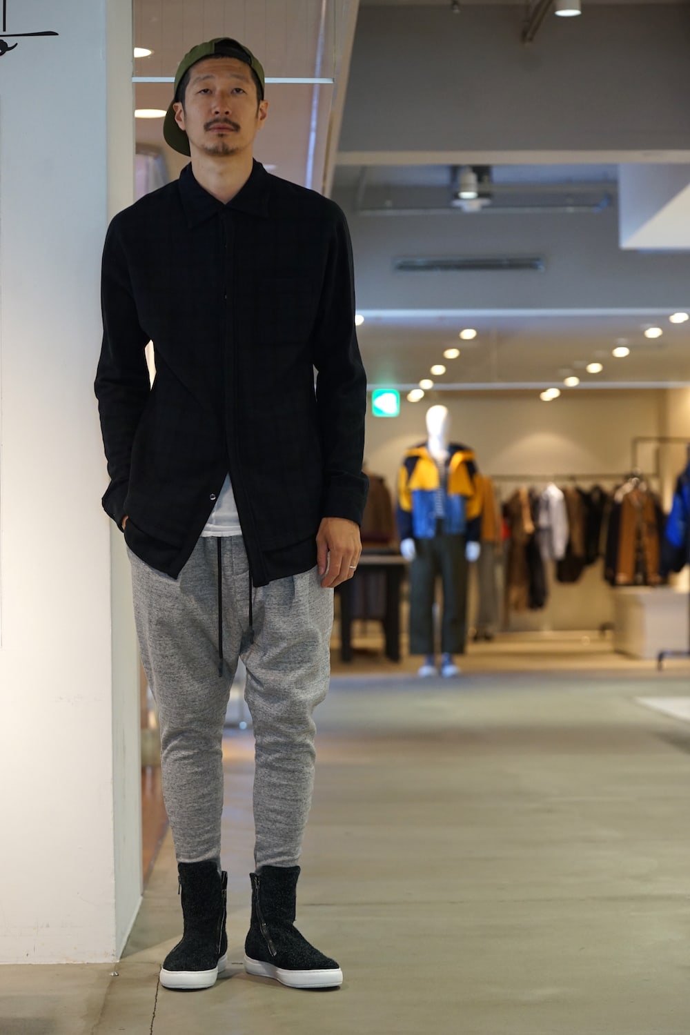 チャコールグレーをベースに、落ち着いた印象を見せるSHADOW GRAY。裾レイヤード仕様によりジョッパーズ型のパンツと相性が良いので、本日選んだパンツはCROPPED JERSEY PANTS。