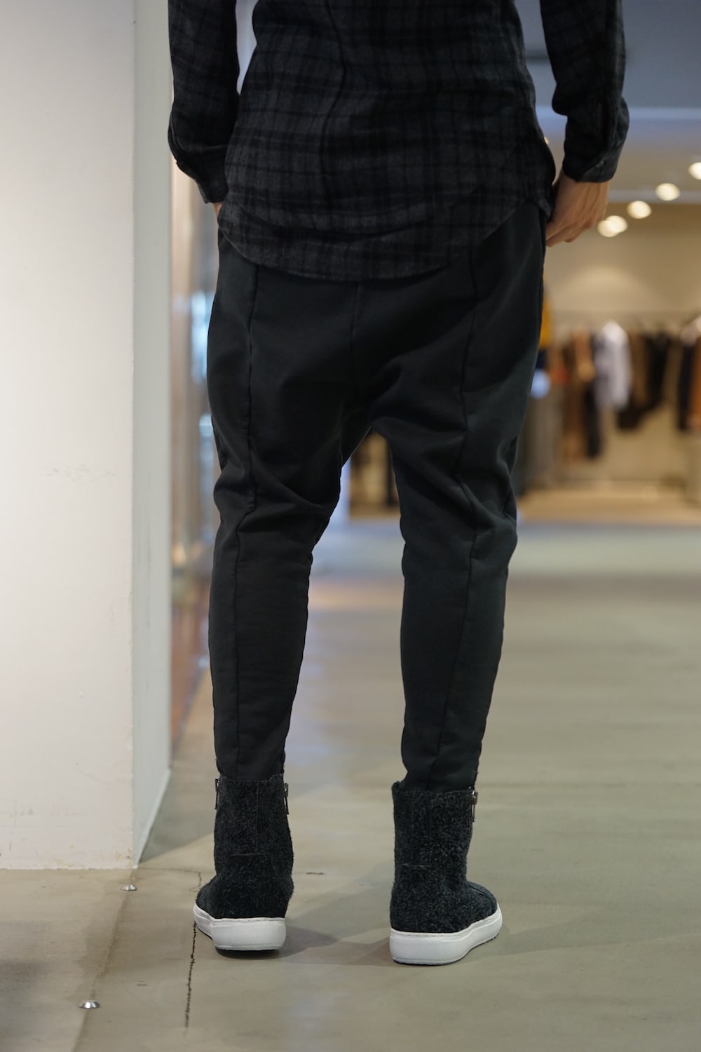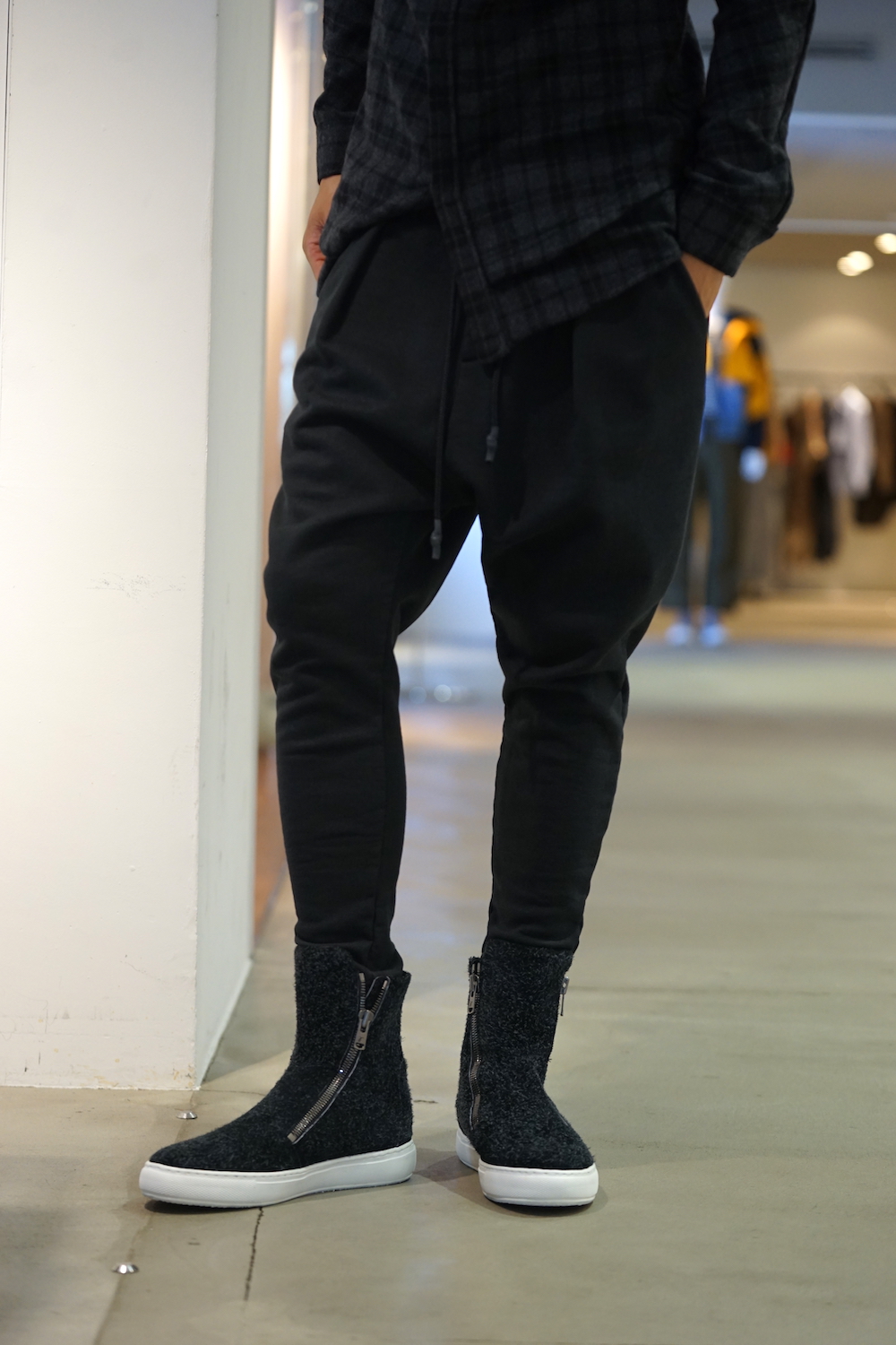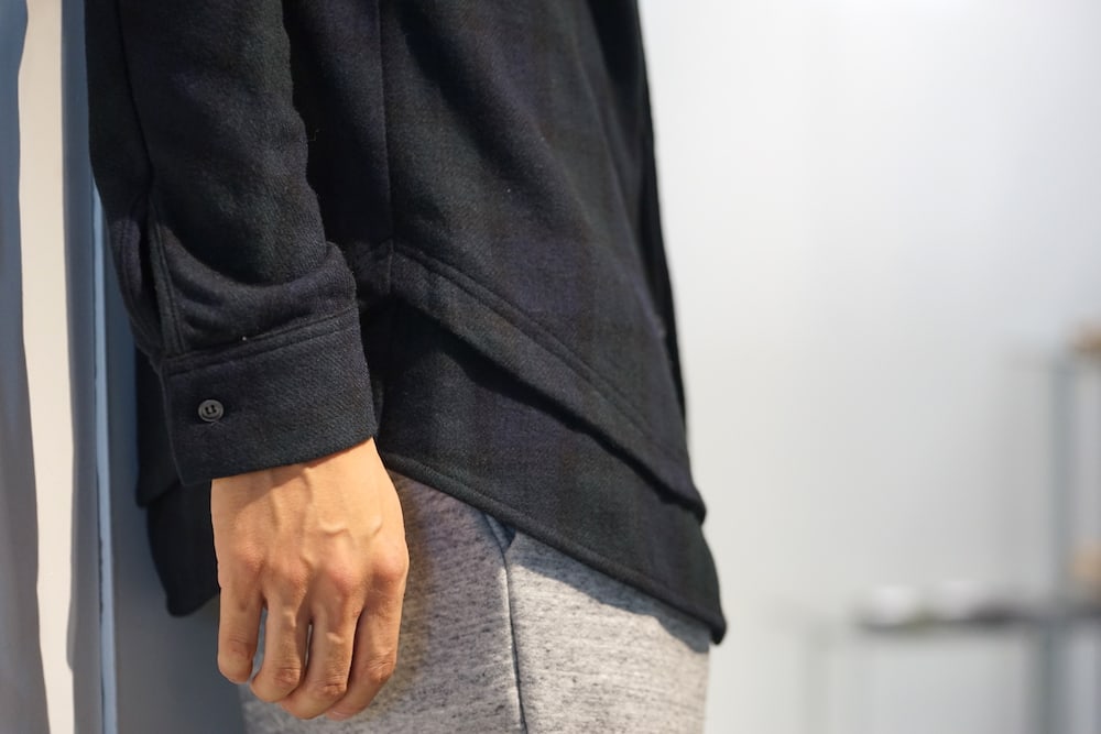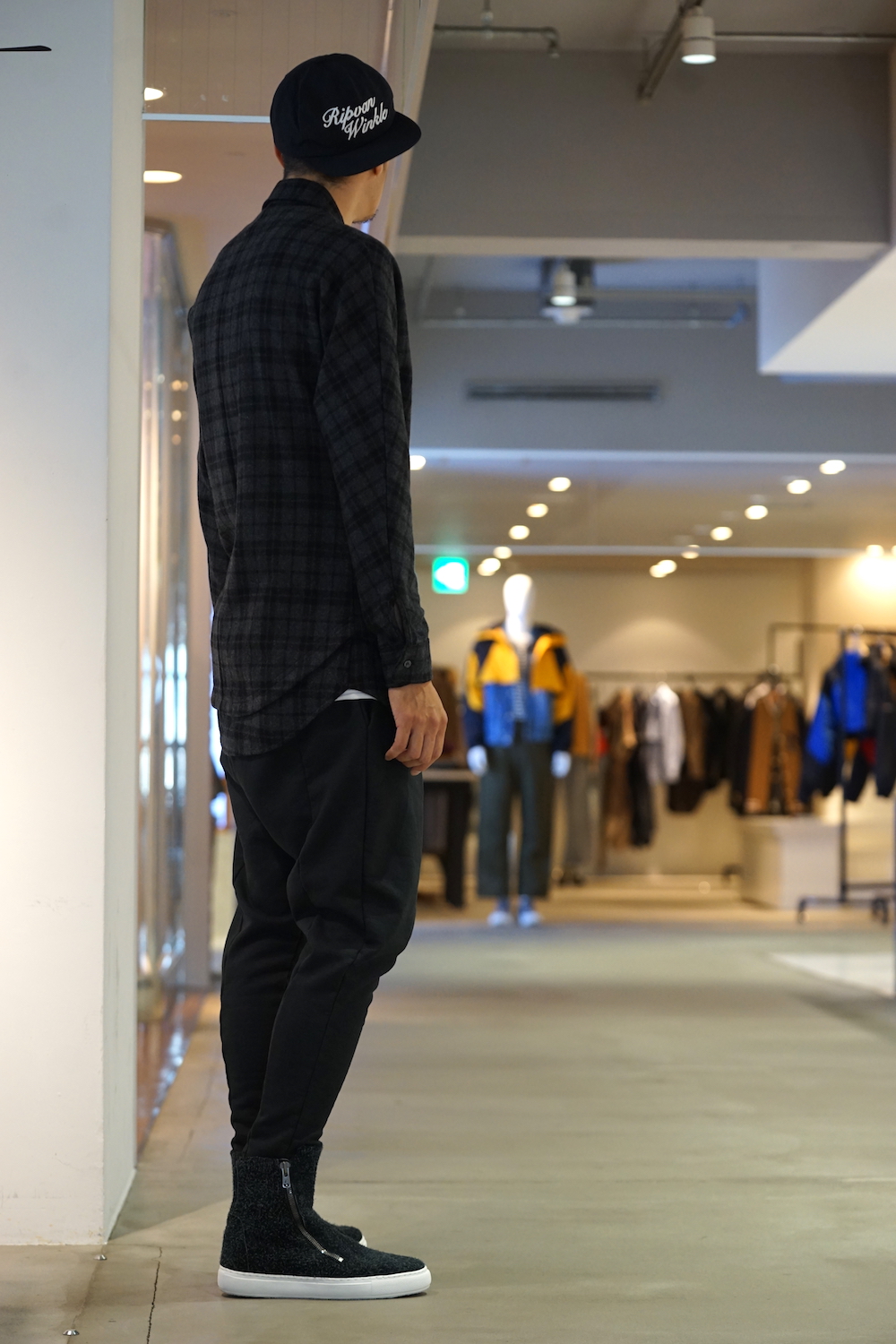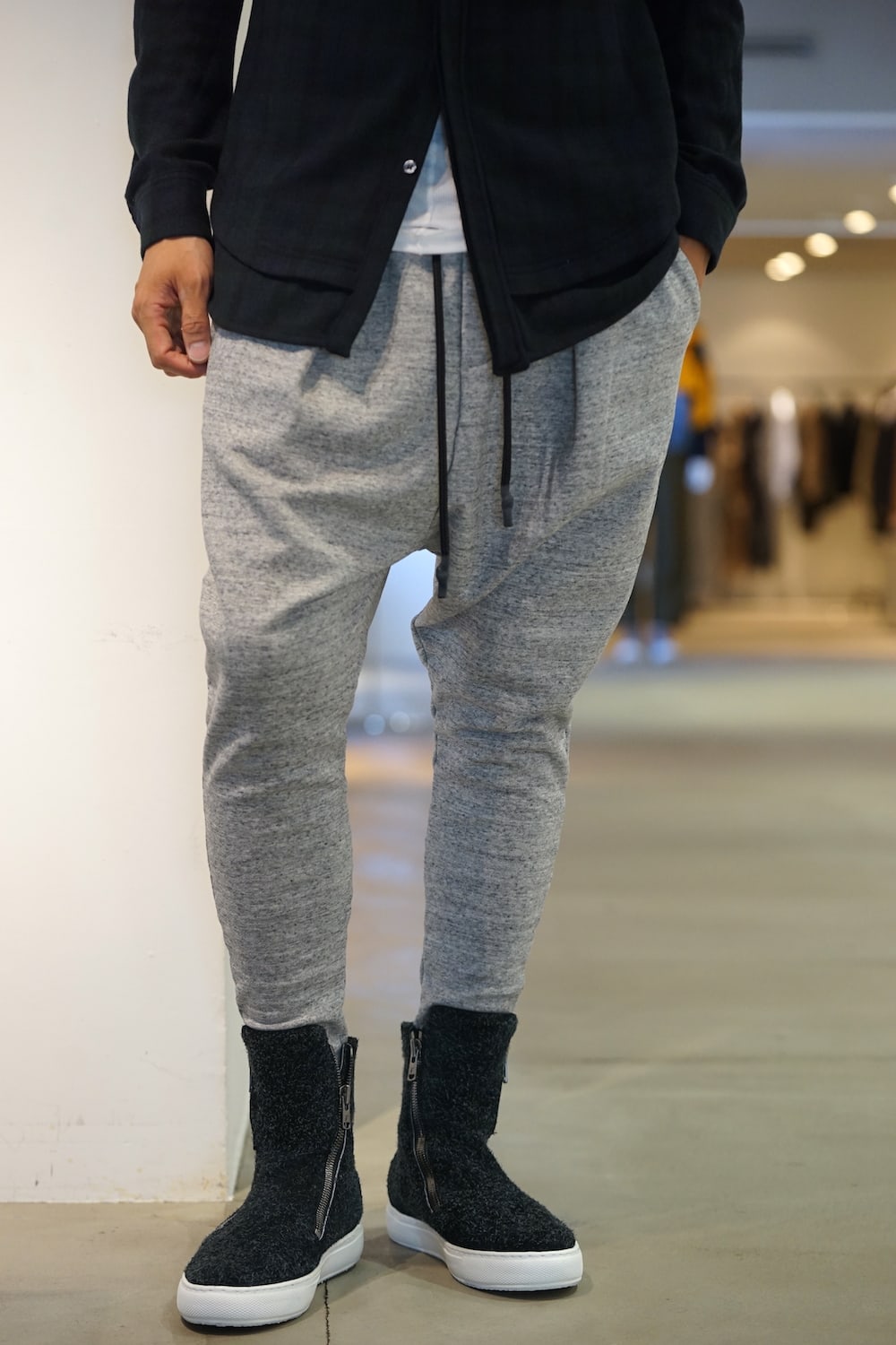 チャコールグレーをベースに、落ち着いた印象を見せるSHADOW GRAY。裾レイヤード仕様によりジョッパーズ型のパンツと相性が良いので、本日選んだパンツはCROPPED JERSEY PANTS。