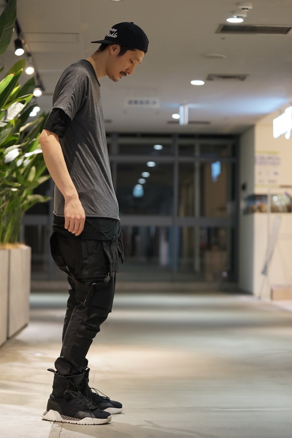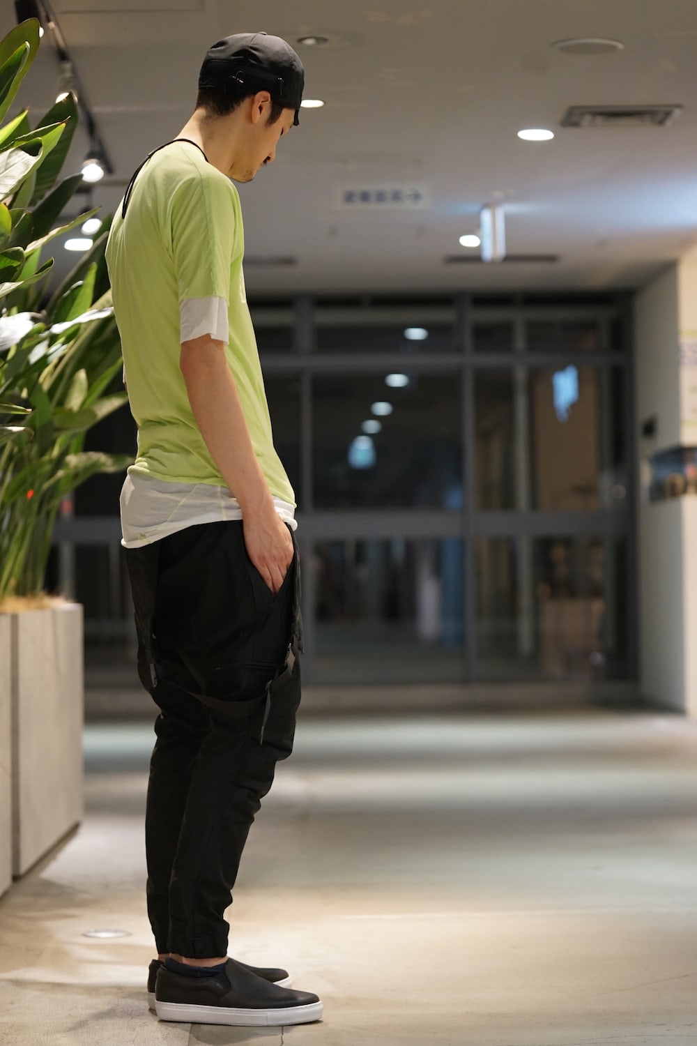 リブパンツにしっくりくるKAZUYUKI KUMAGAIのGUIDIレザースリッポンを合わせ、キャップはCIVILIZEDの新着ワークキャップを合わせています。